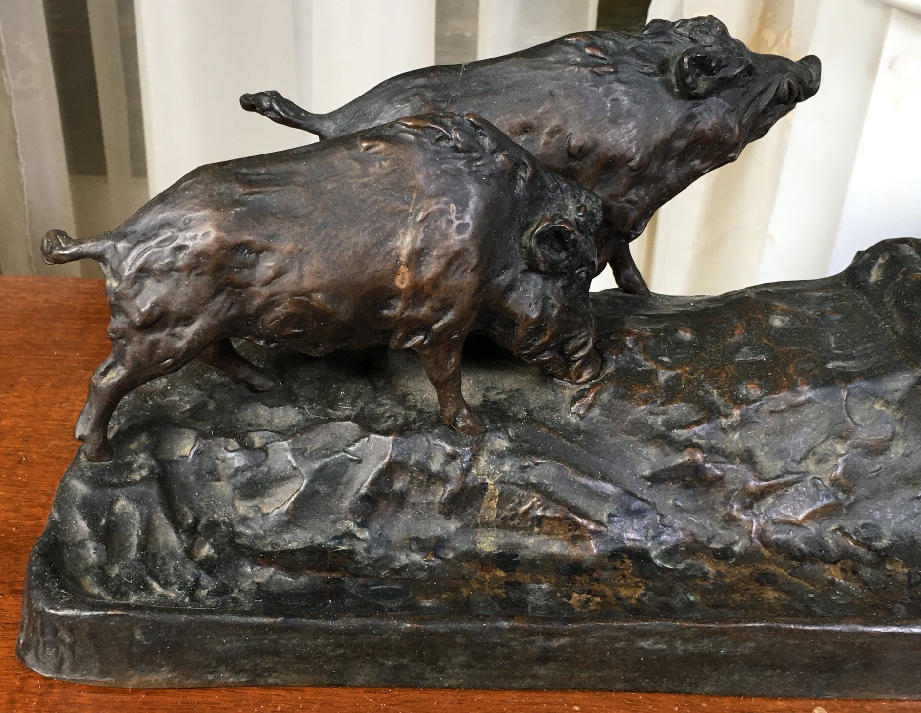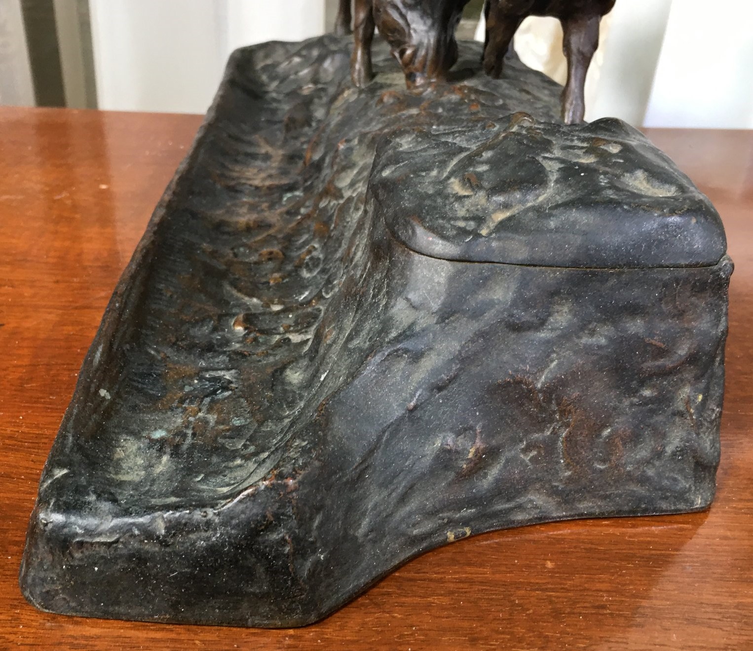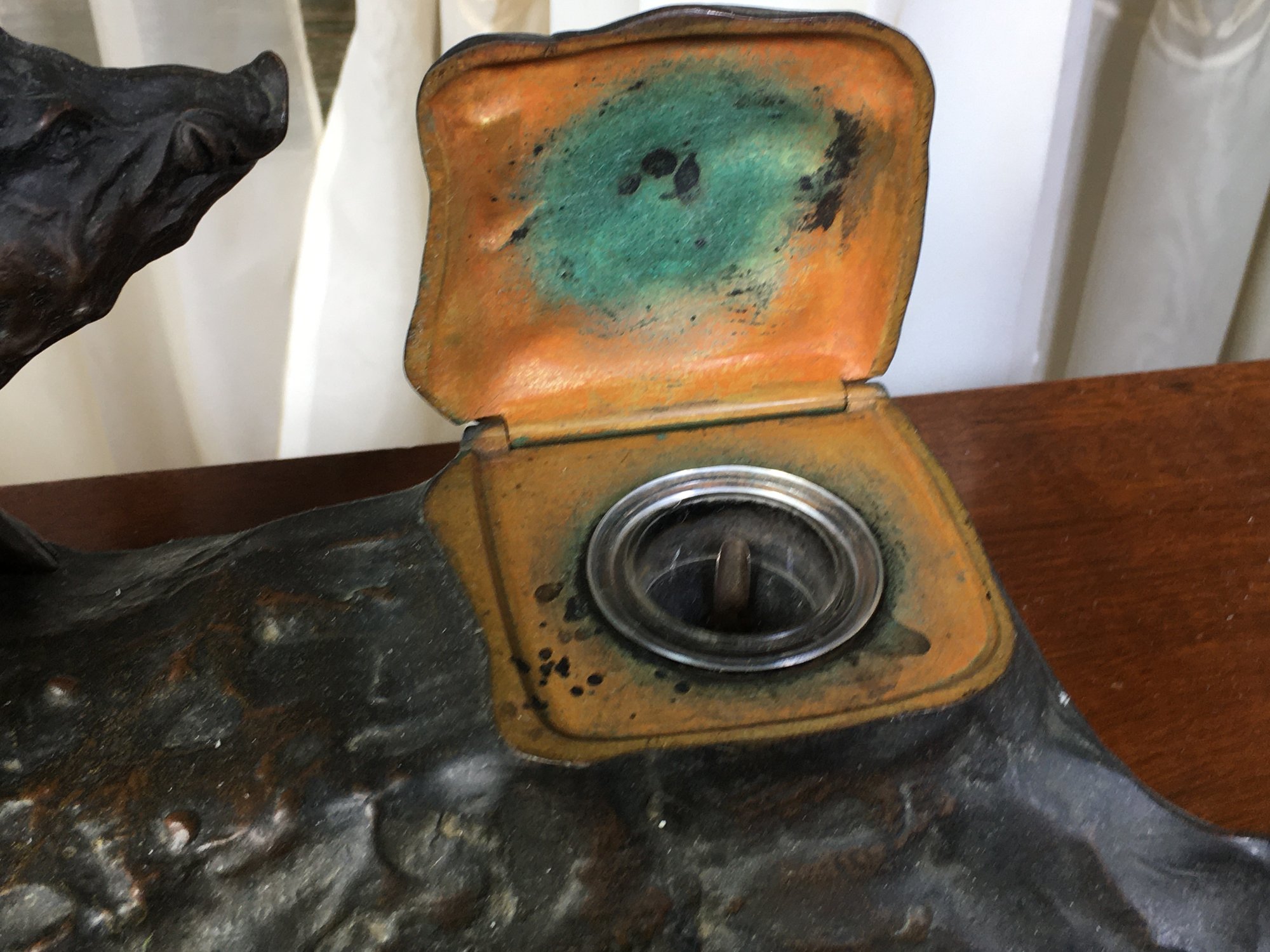 Two wild boars stand on a bronze inkstand by Friedrich Gornik (signed), an Austrian artist (born 1877, Prävali, Slovenia – died 1943, Vienna Austria). The foundry mark (AR – Arthur Rubenstein) is also marked on the piece.