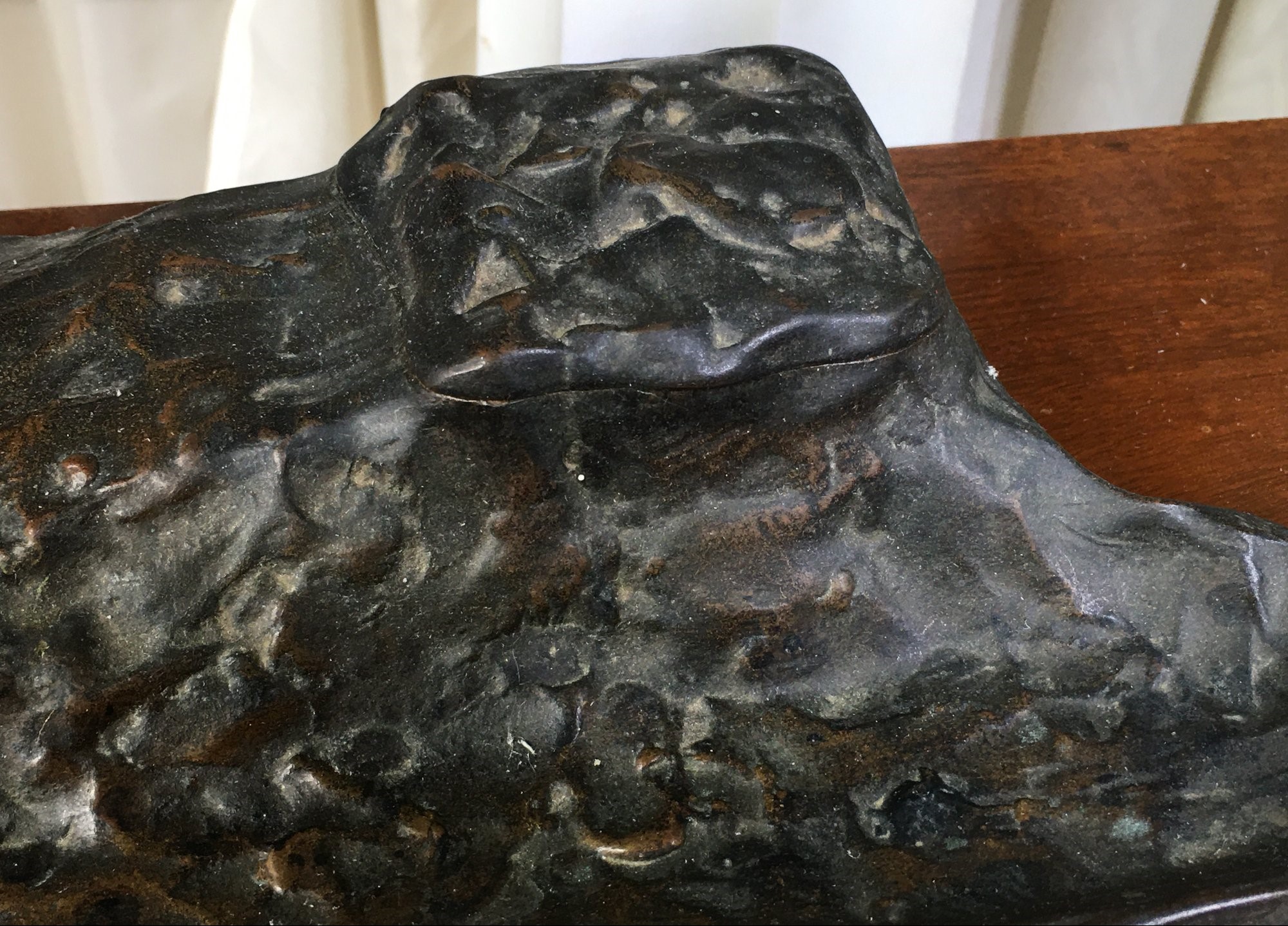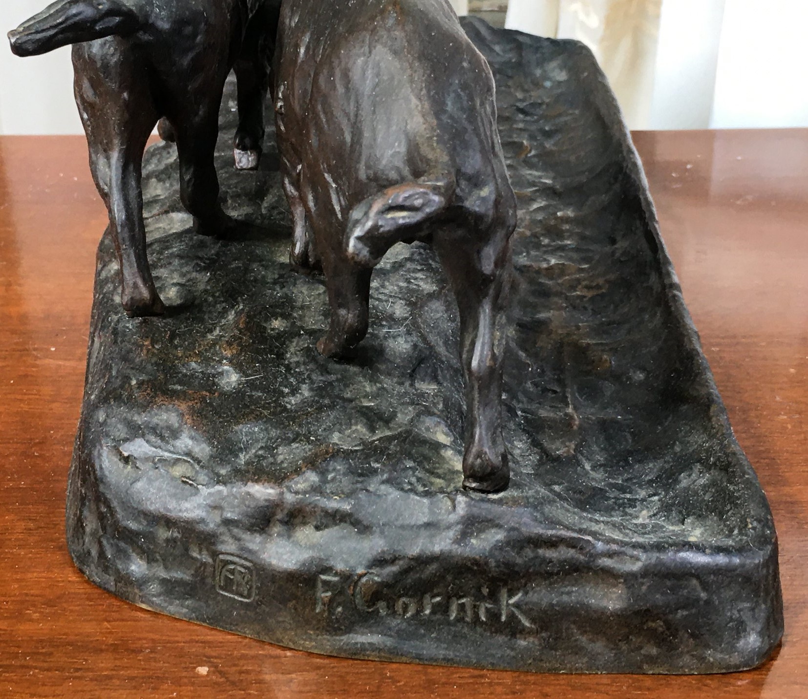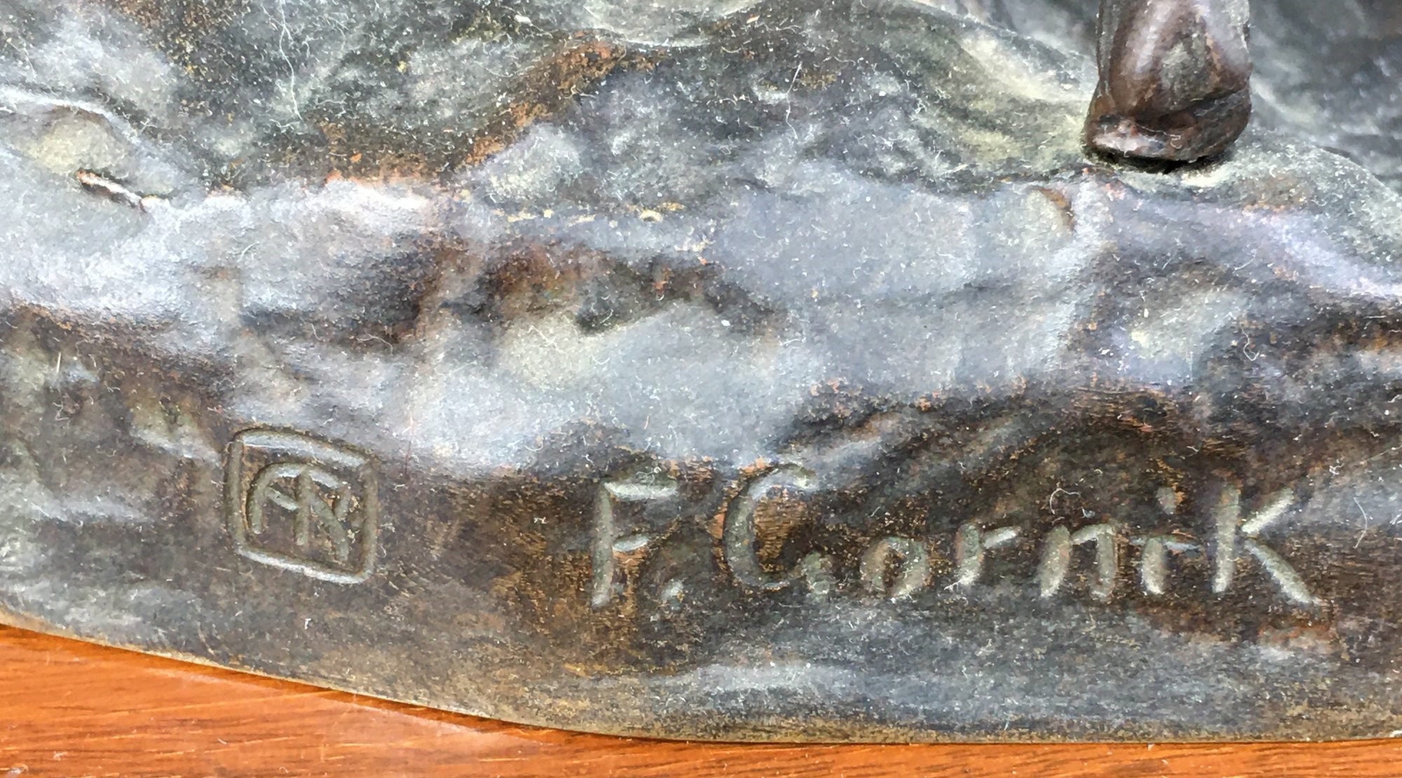 Two wild boars stand on a bronze inkstand by Friedrich Gornik (signed), an Austrian artist (born 1877, Prävali, Slovenia – died 1943, Vienna Austria). The foundry mark (AR – Arthur Rubenstein) is also marked on the piece.