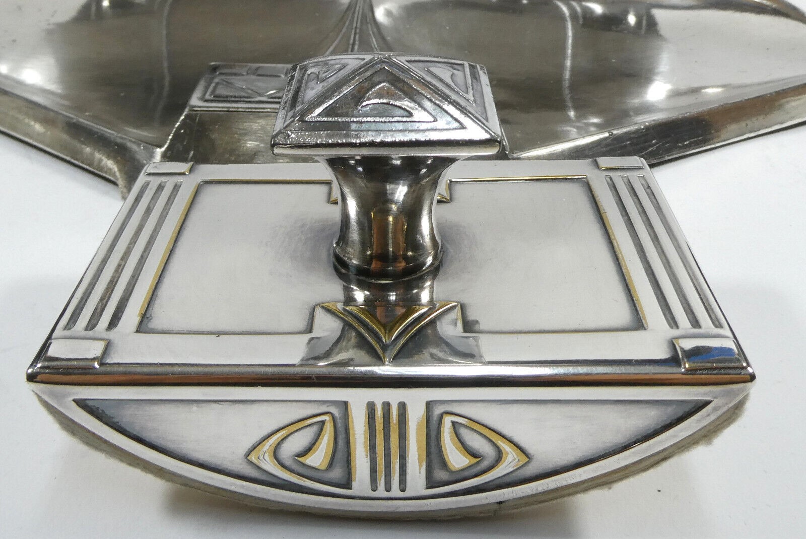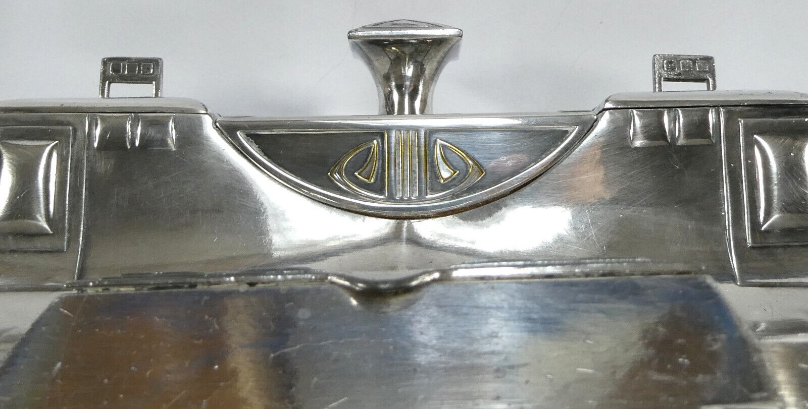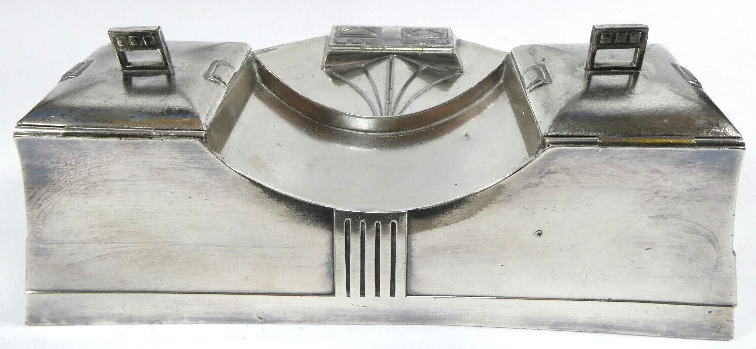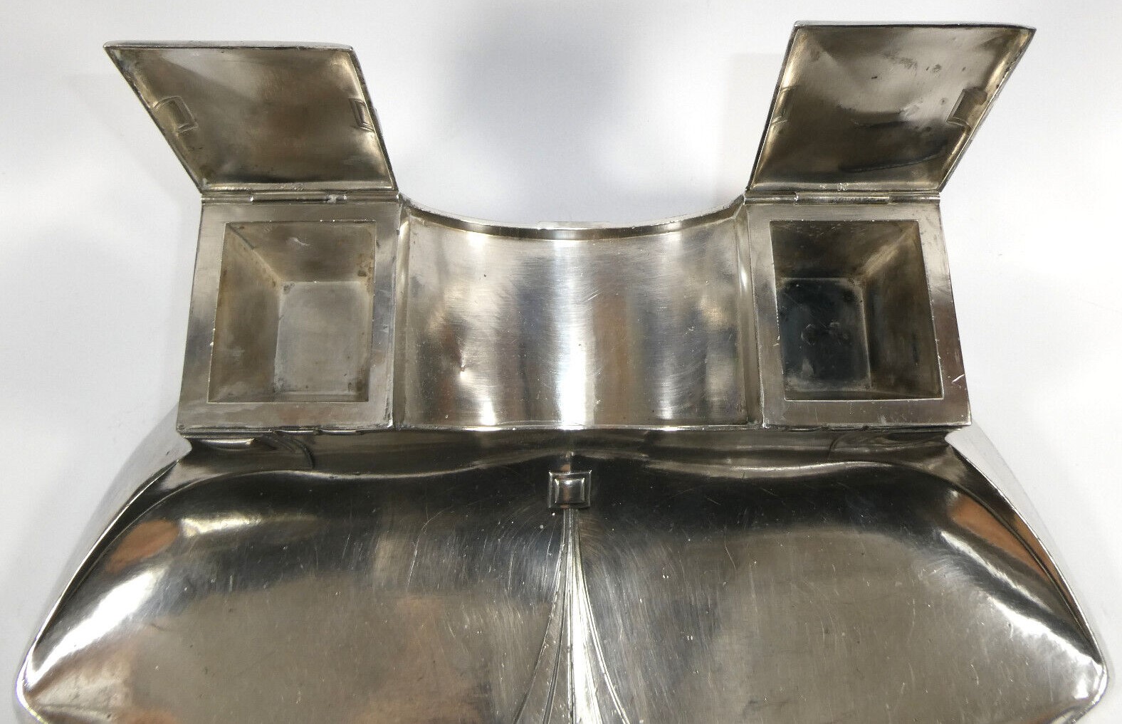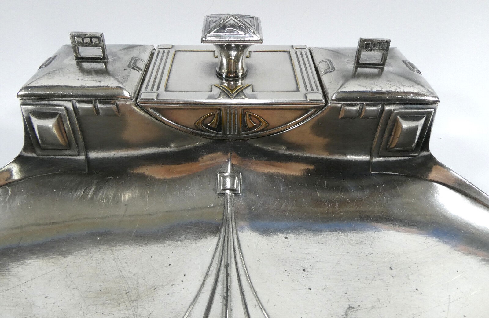 This silverplated inkstand features a built-in rocker blotter and a hinged lidded stamp box both integral to and highlights of the design – a harmonious blend of art and functionality. The design is attributed to Peter Behrens. The piece is marked WMF (Württembergische Metallwarenfabrik), B (Brittania an alloy with tin), I/O (normal thickness of silverplating), OX (oxidized), and the number 184.