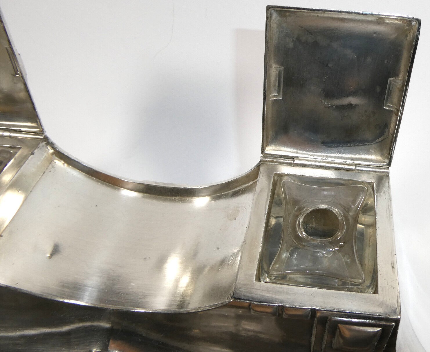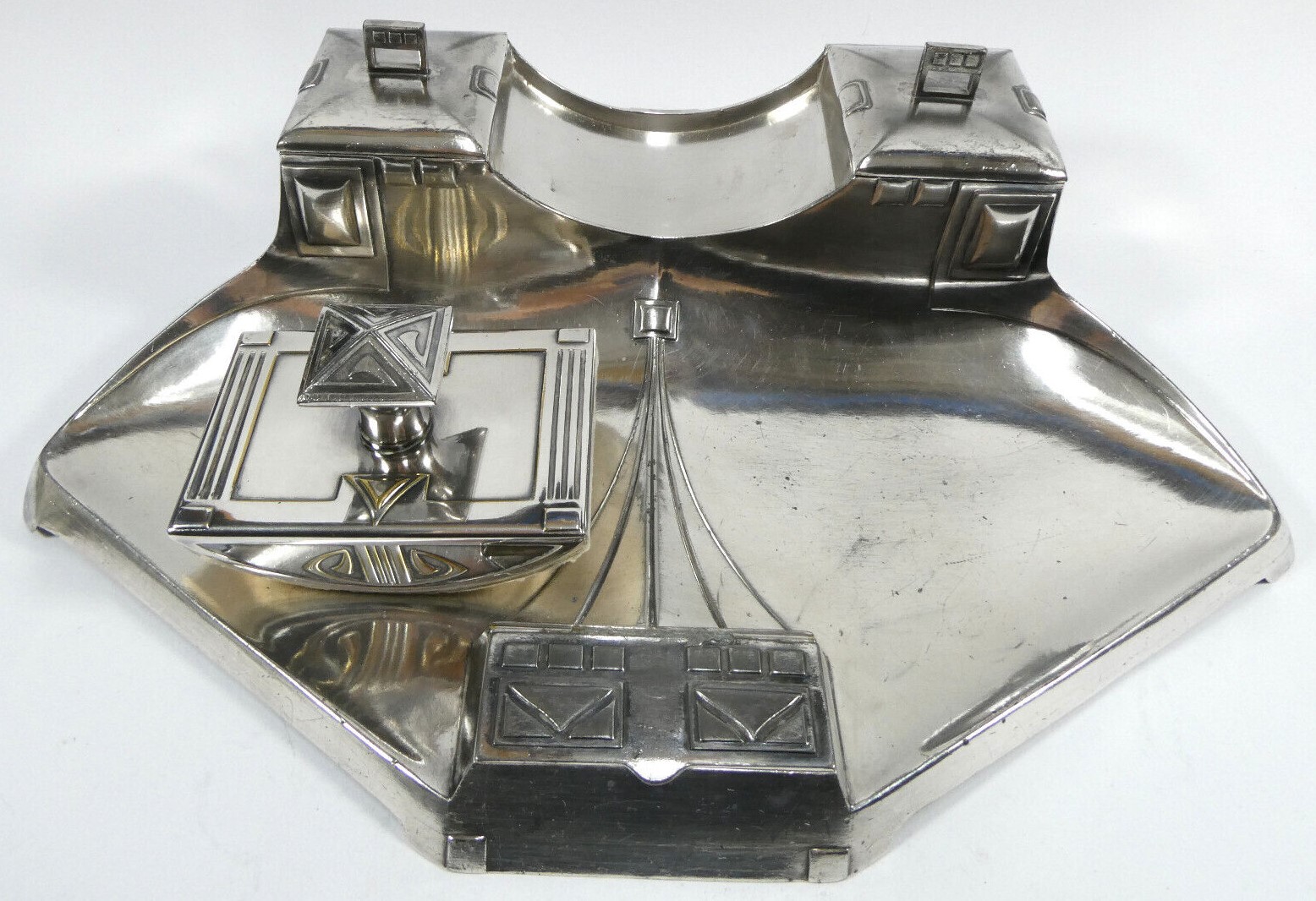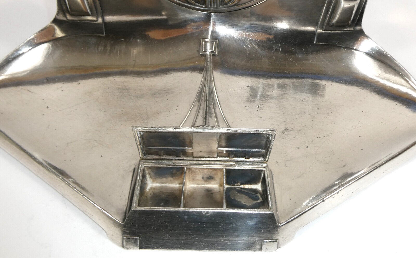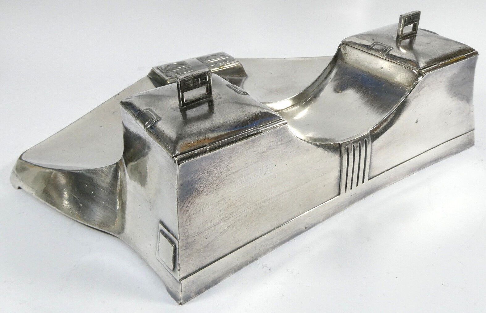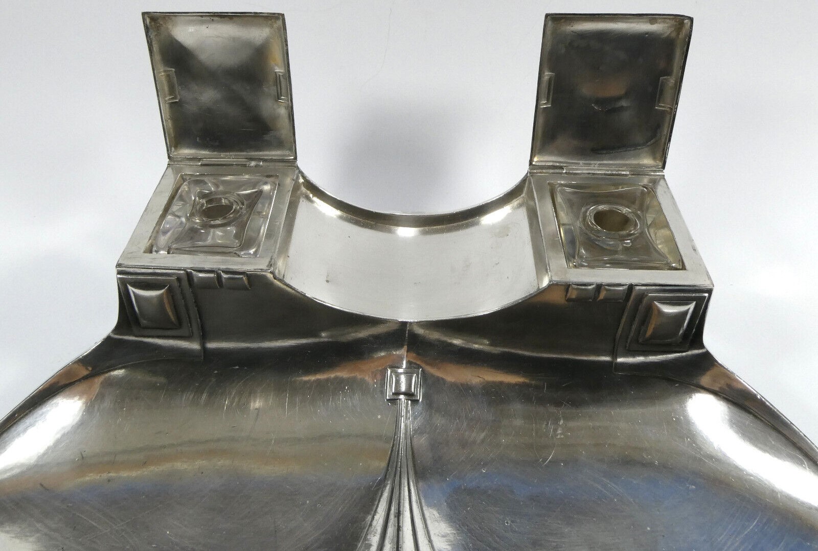 This silverplated inkstand features a built-in rocker blotter and a hinged lidded stamp box both integral to and highlights of the design – a harmonious blend of art and functionality. The design is attributed to Peter Behrens. The piece is marked WMF (Württembergische Metallwarenfabrik), B (Brittania an alloy with tin), I/O (normal thickness of silverplating), OX (oxidized), and the number 184.