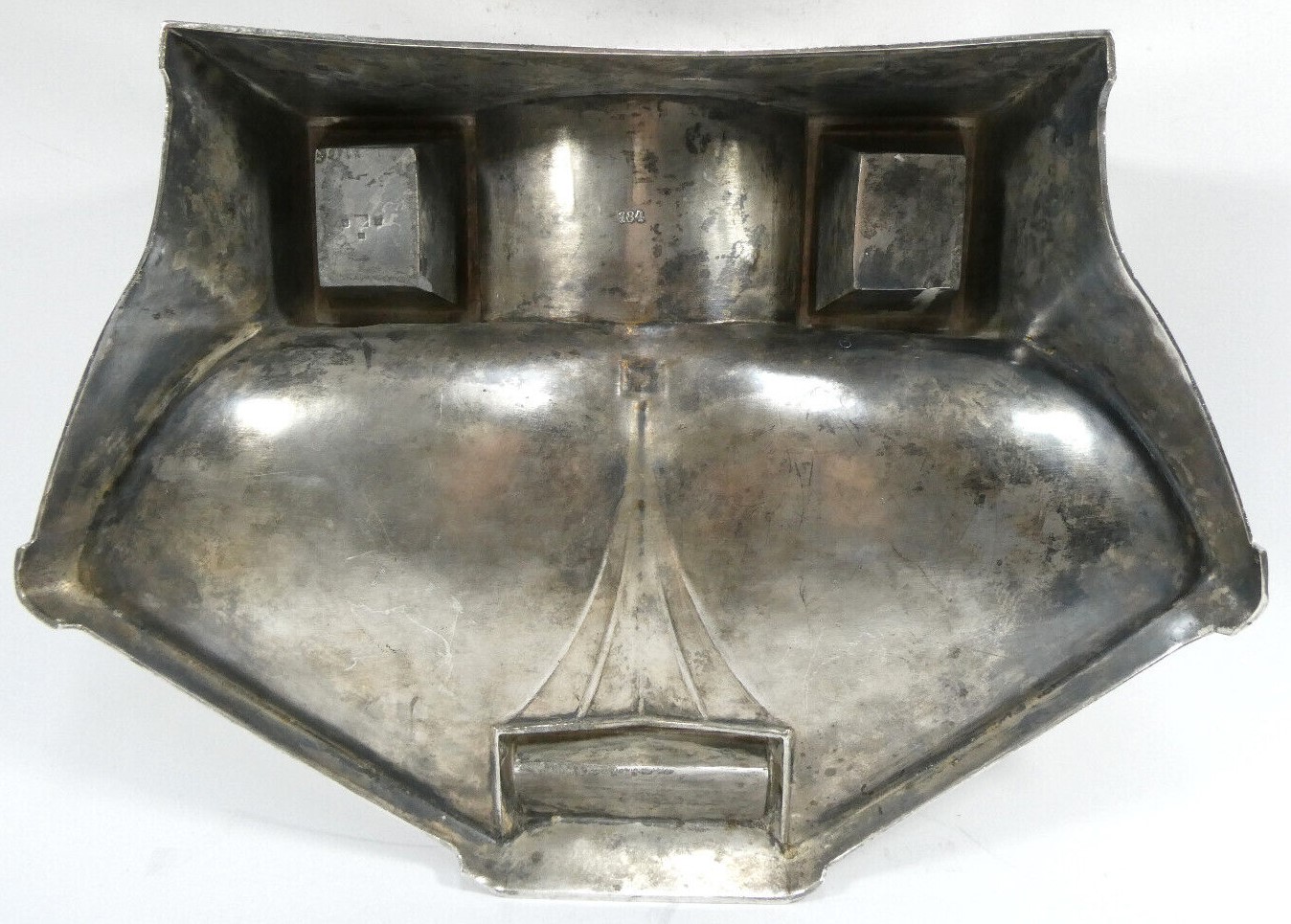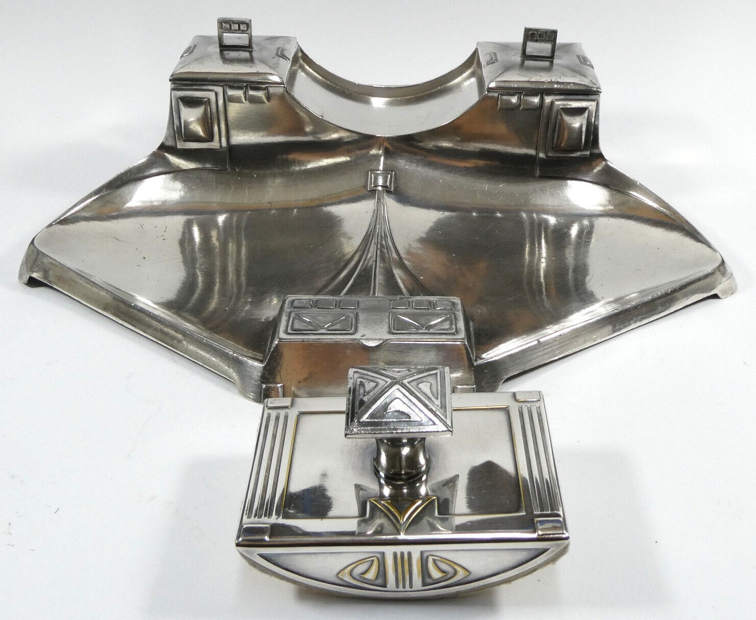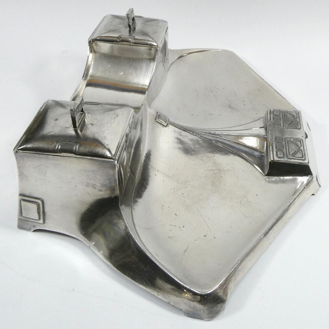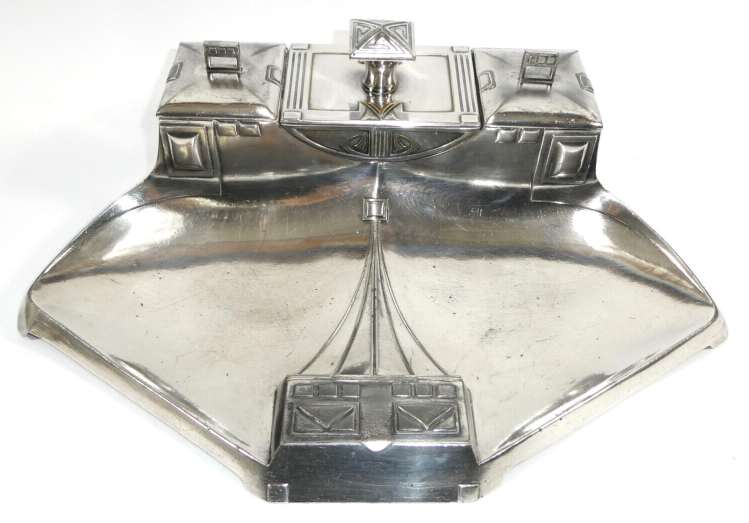 This silverplated inkstand features a built-in rocker blotter and a hinged lidded stamp box both integral to and highlights of the design – a harmonious blend of art and functionality. The design is attributed to Peter Behrens. The piece is marked WMF (Württembergische Metallwarenfabrik), B (Brittania an alloy with tin), I/O (normal thickness of silverplating), OX (oxidized), and the number 184.