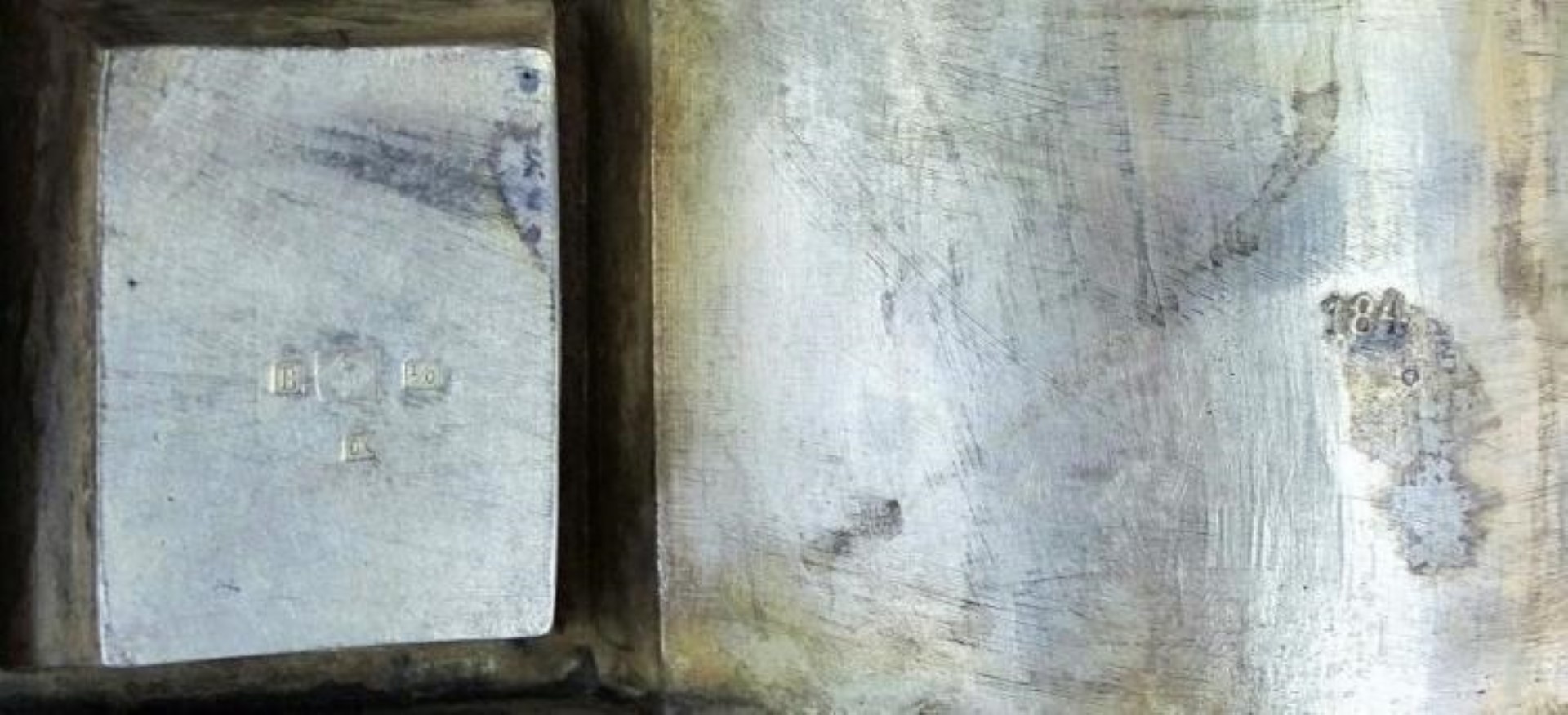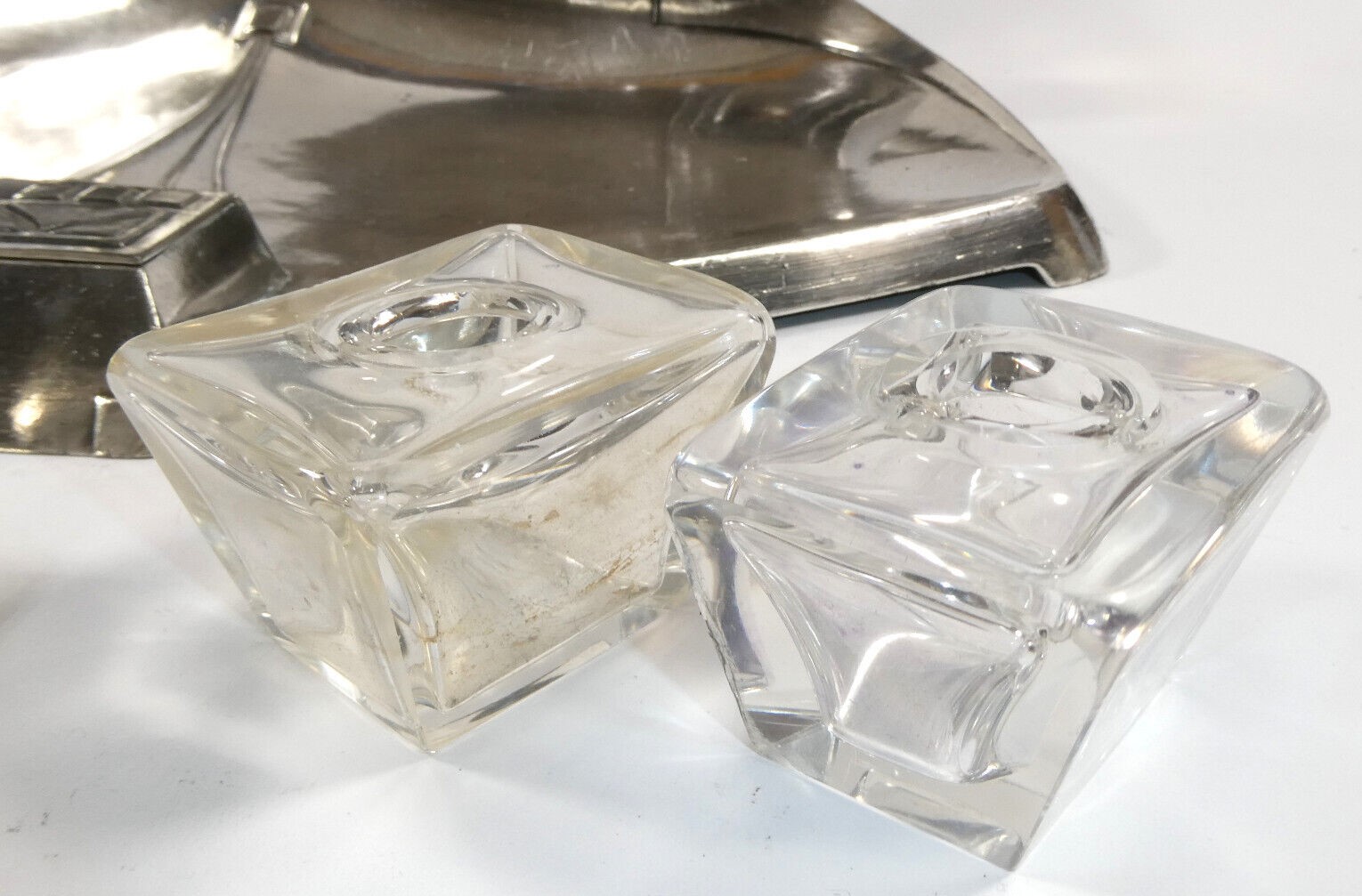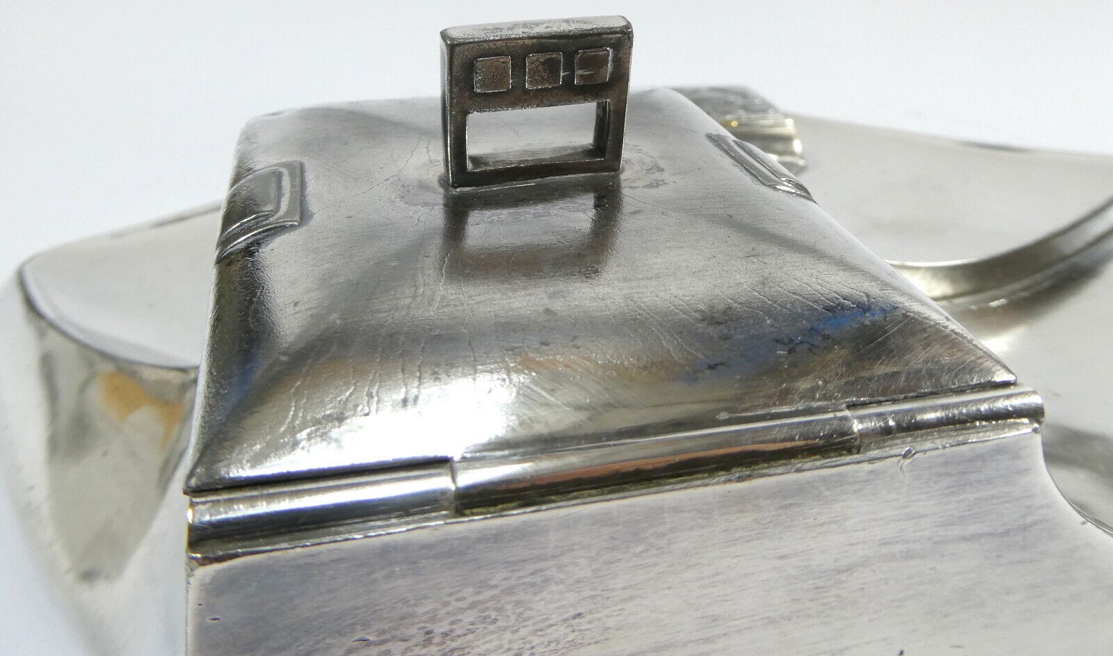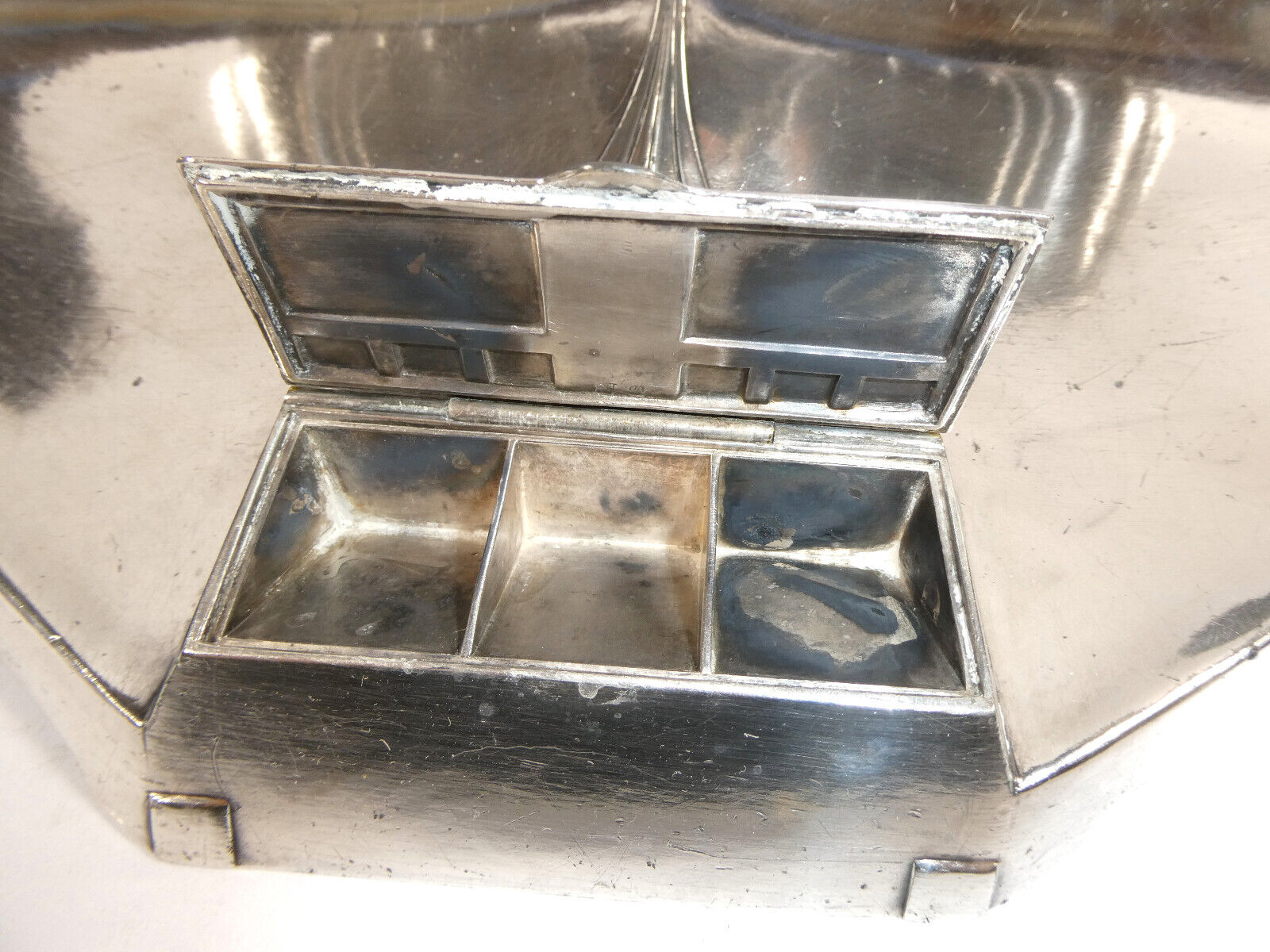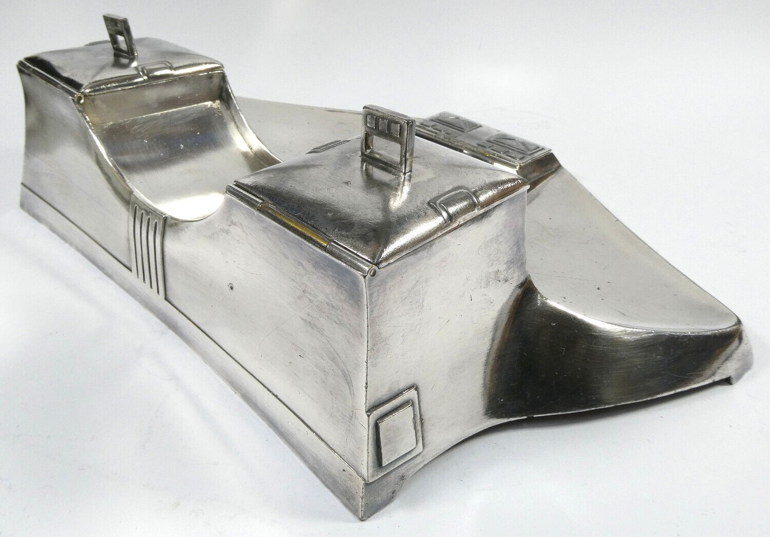 This silverplated inkstand features a built-in rocker blotter and a hinged lidded stamp box both integral to and highlights of the design – a harmonious blend of art and functionality. The design is attributed to Peter Behrens. The piece is marked WMF (Württembergische Metallwarenfabrik), B (Brittania an alloy with tin), I/O (normal thickness of silverplating), OX (oxidized), and the number 184.