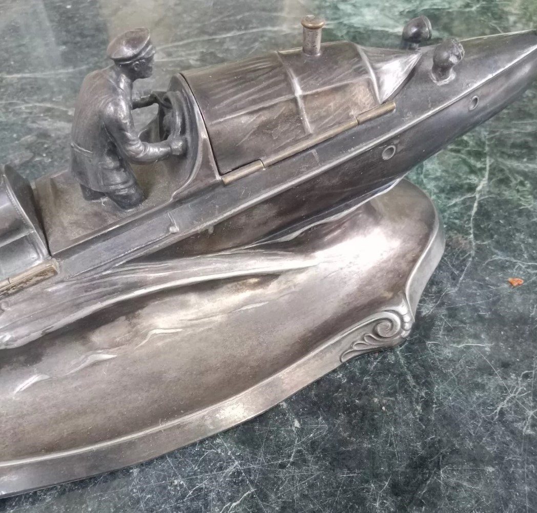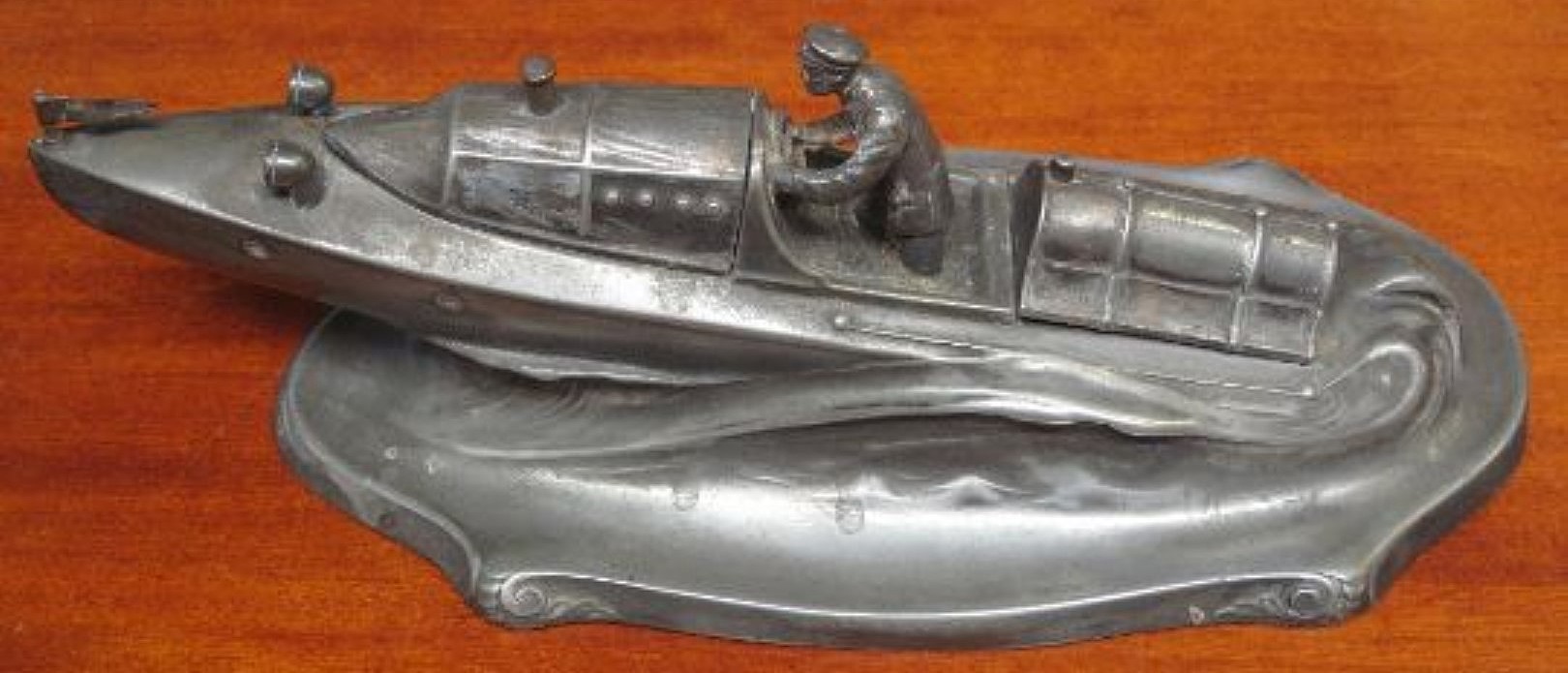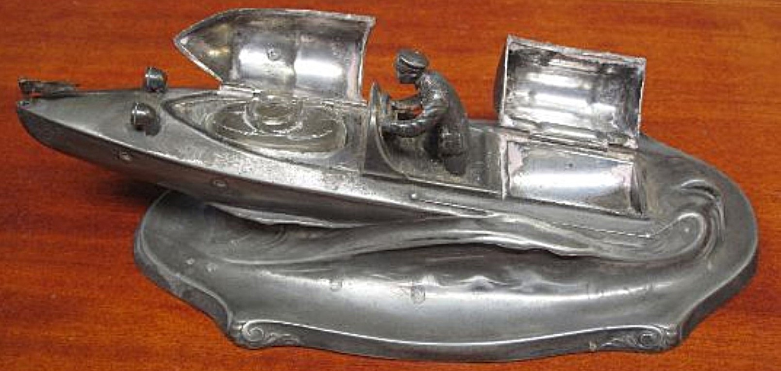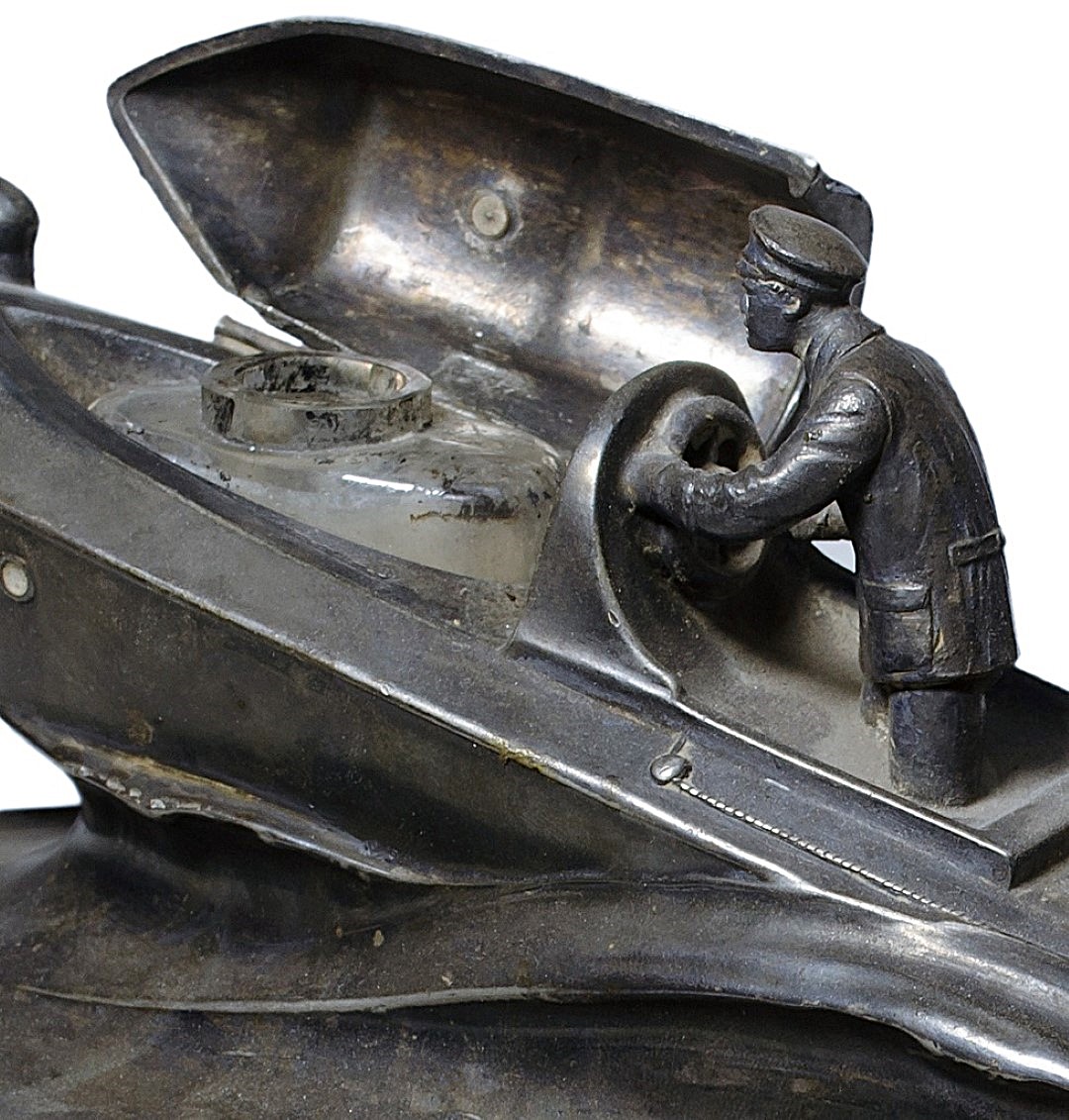 This WMF (Württembergische Metallwarenfabrik) inkstand is designed to resemble a speedboat with a helmsman. The glass inkwell is located in the bow’s front cargo area. At the stern (rear) where the motor would be, there’s a storage compartment. The pen tray is formed at the water’s wake in front of the helmsman.