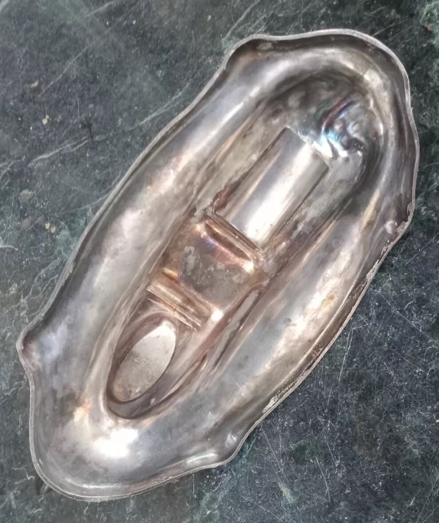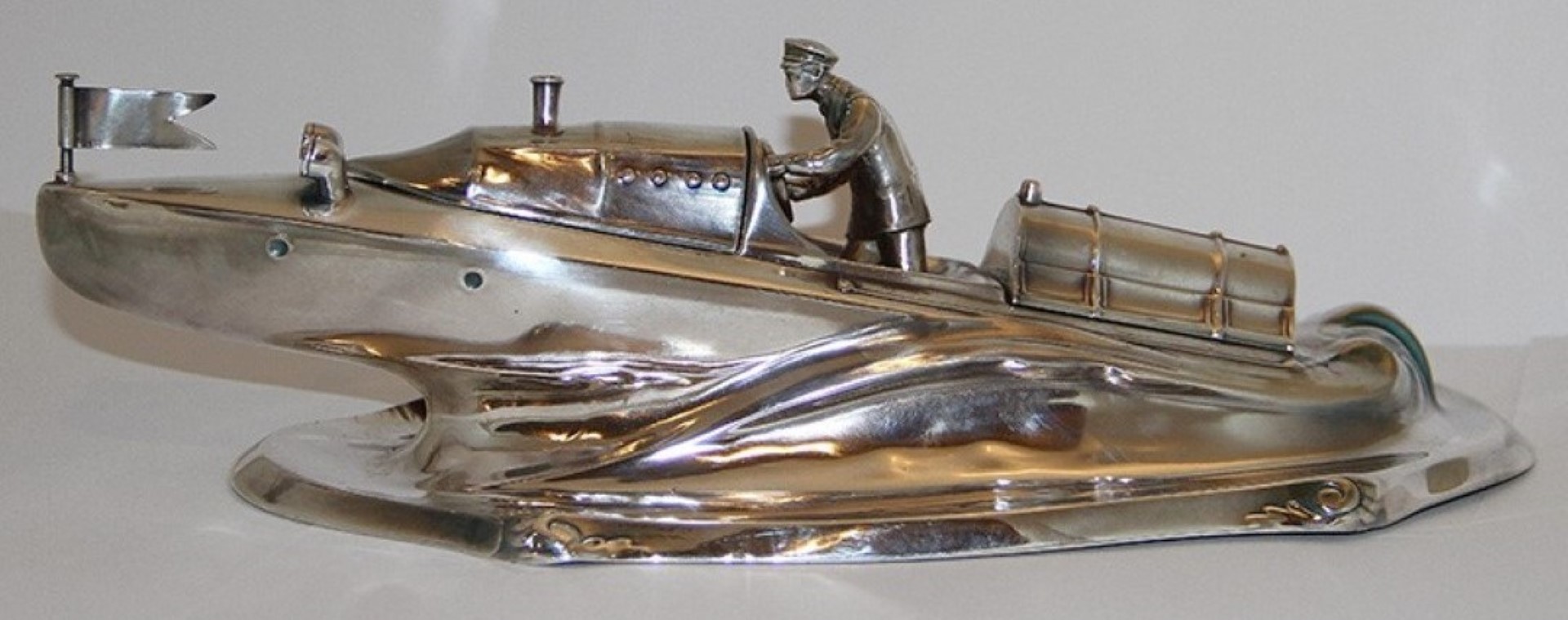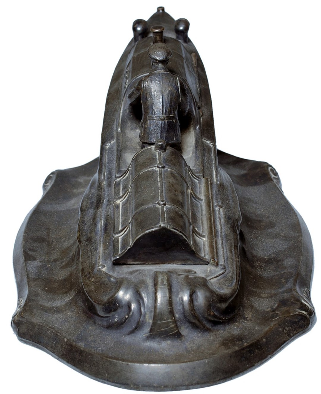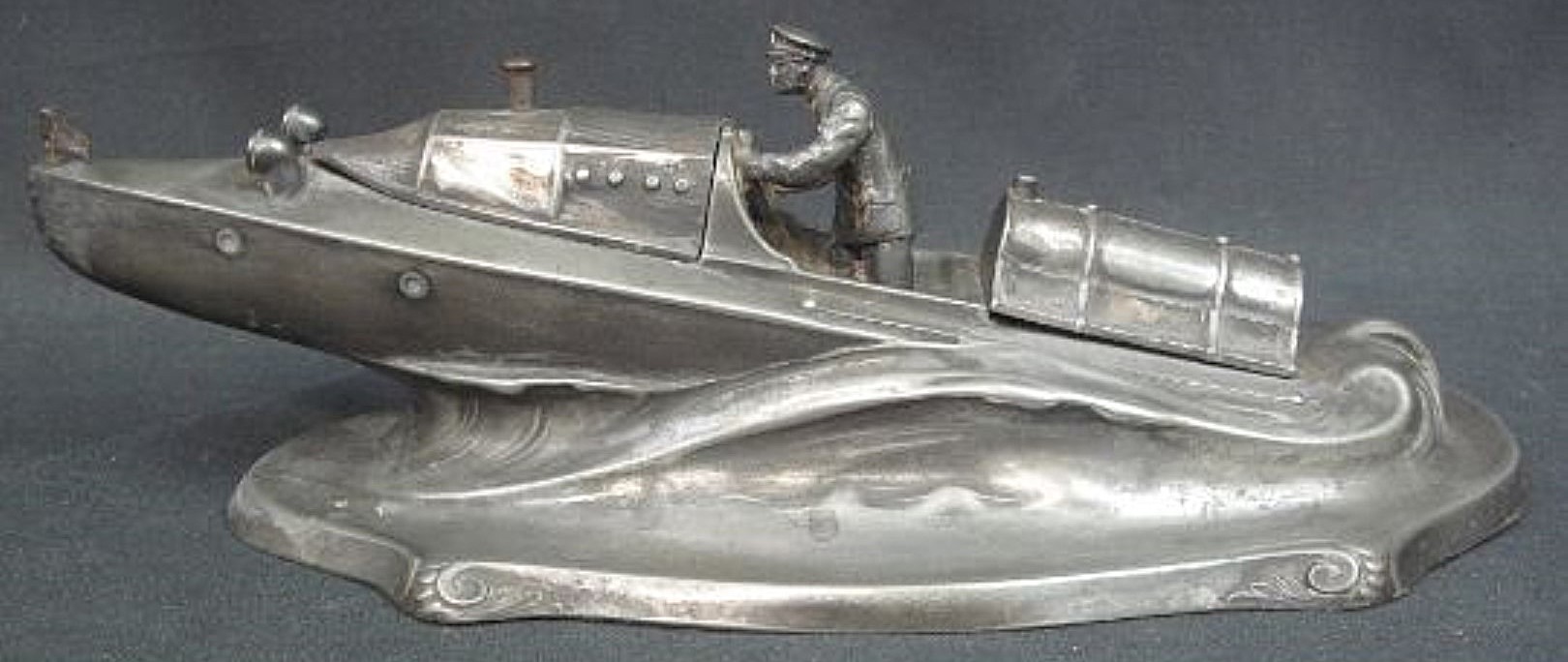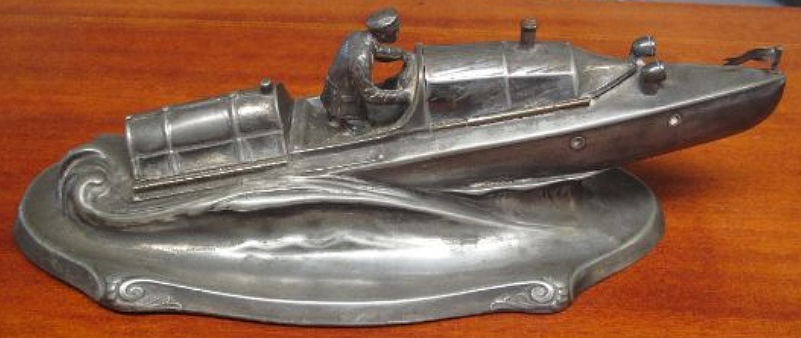 This WMF (Württembergische Metallwarenfabrik) inkstand is designed to resemble a speedboat with a helmsman. The glass inkwell is located in the bow’s front cargo area. At the stern (rear) where the motor would be, there’s a storage compartment. The pen tray is formed at the water’s wake in front of the helmsman.