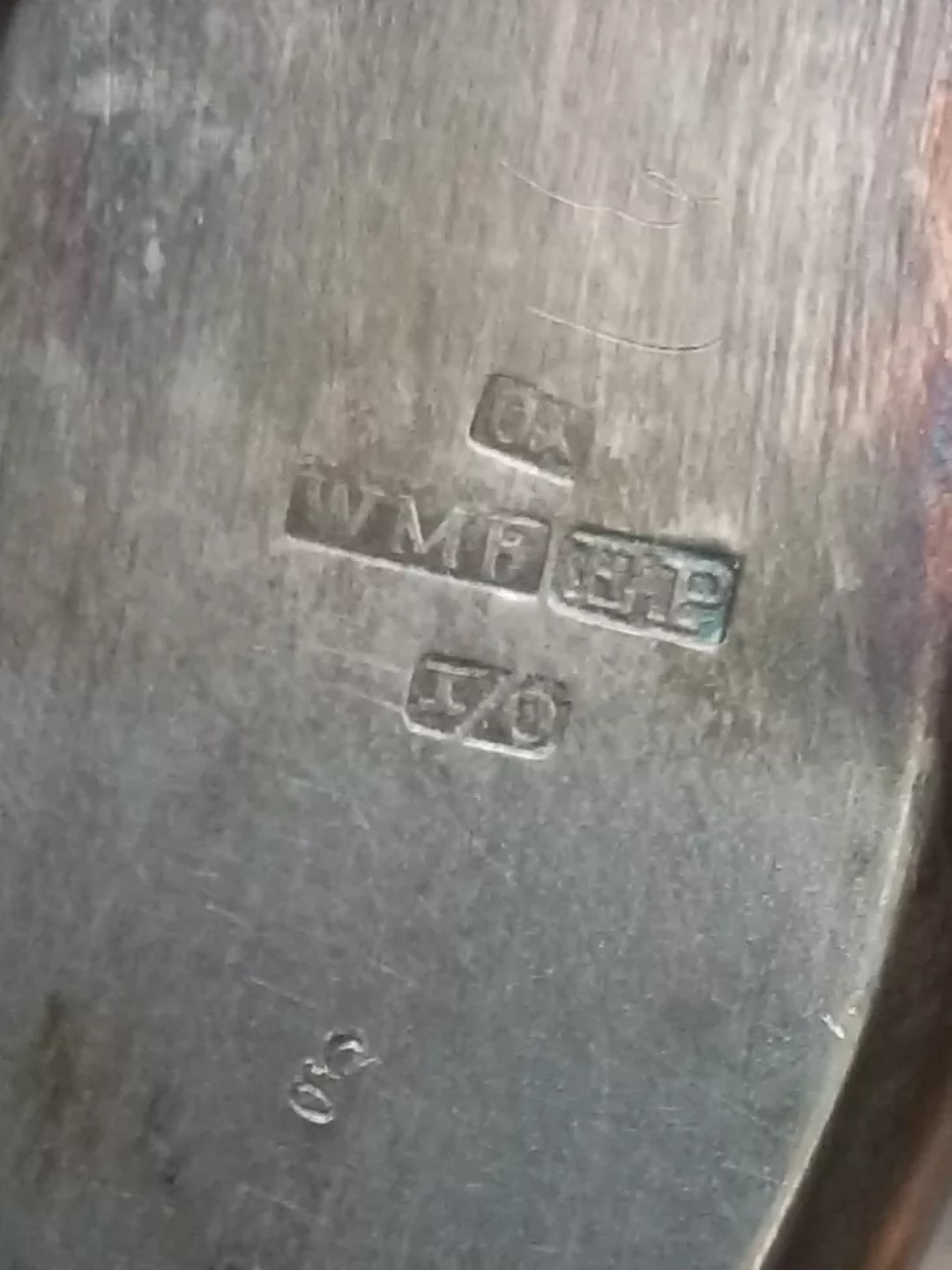 WMF, which stands for Württembergische Metallwarenfabrik, was a German company known for its high-quality pewter and silver products. The underside of this inkstand bears the WMF mark and is impressed with an “EP” (electro-plated) and “OX” (oxidized), and “I/O” (normal thickness).