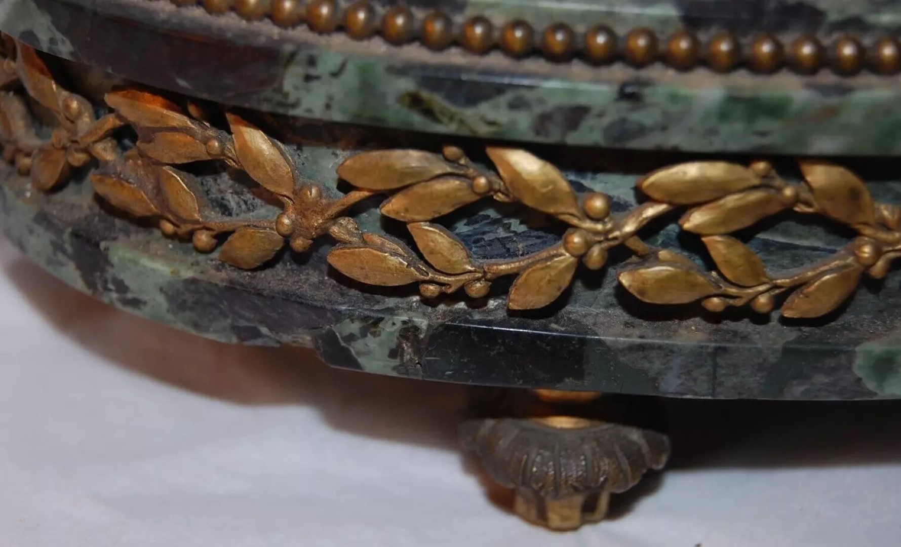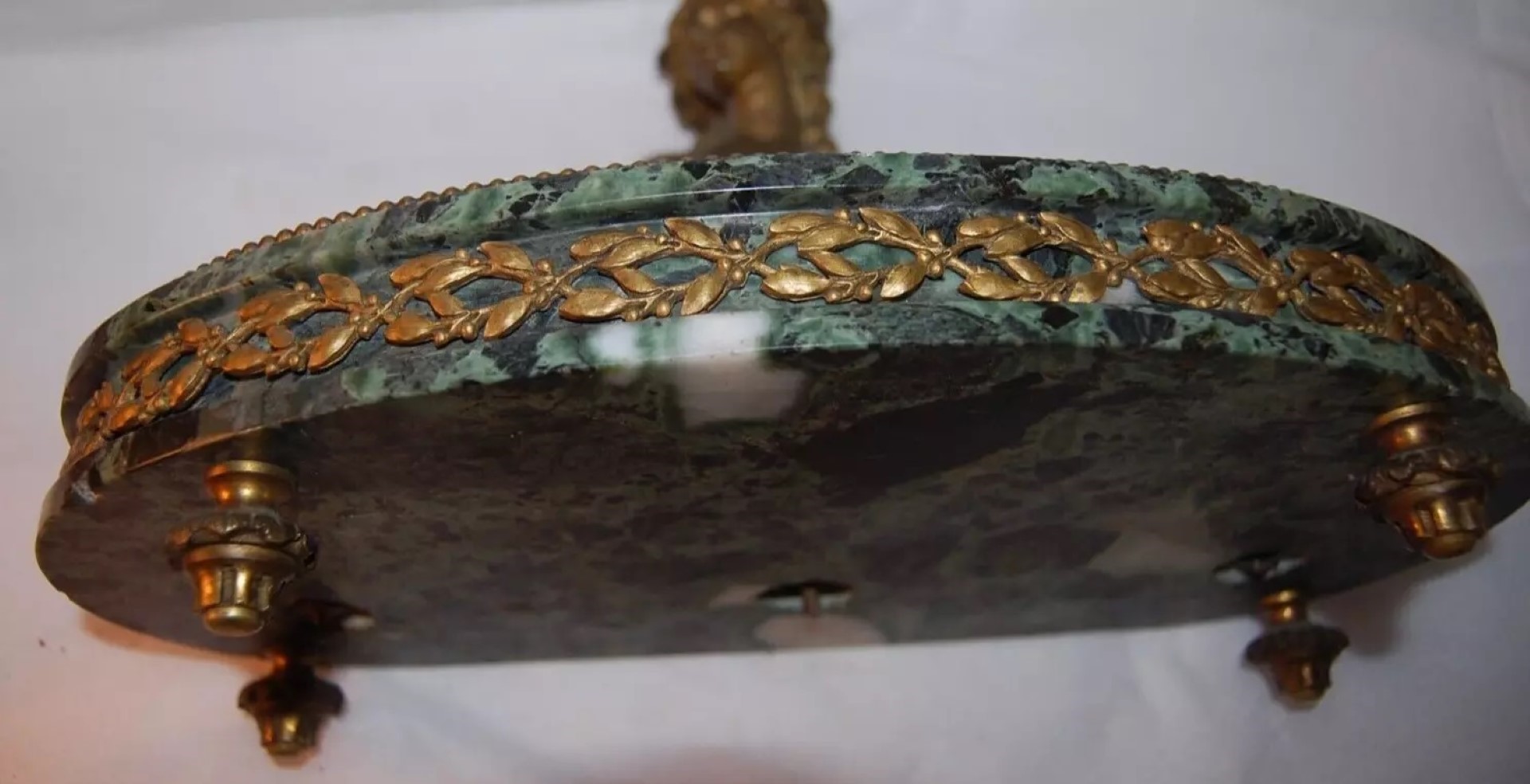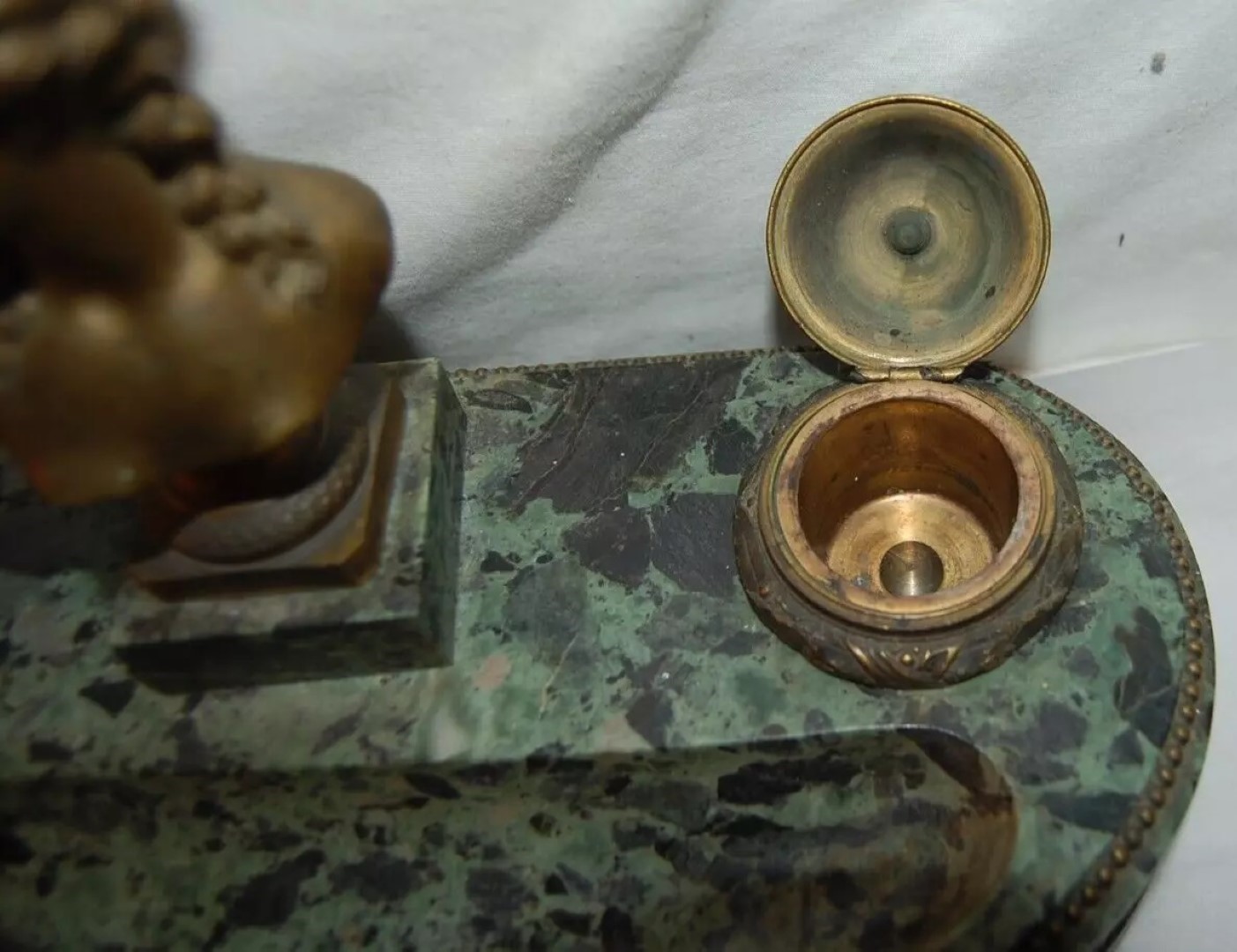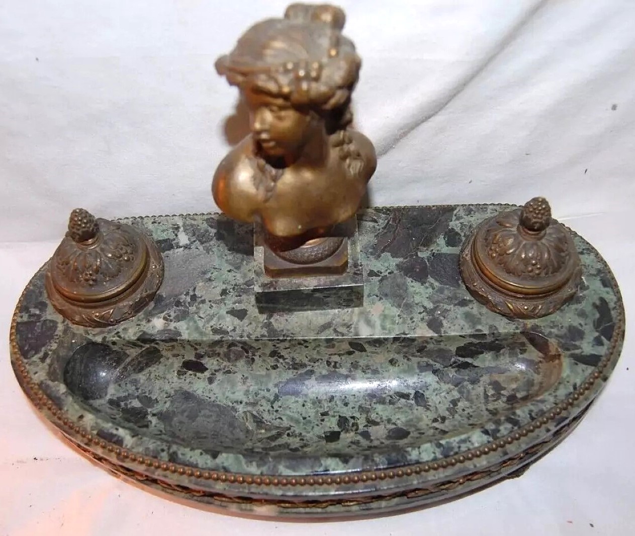 This double inkstand has a marble base with gilt trim along the front edge. At the center is the bust of a young woman (unidentified) mounted on a small square pedestal. Flanking the bust on either side are inkwells. In the front is a recessed area intended to hold pens.