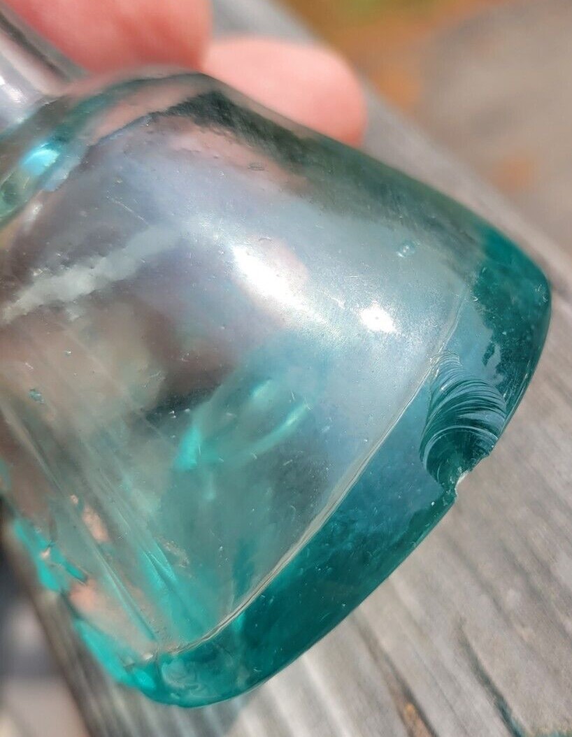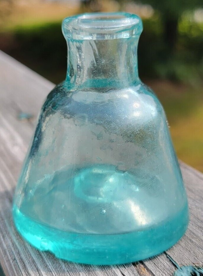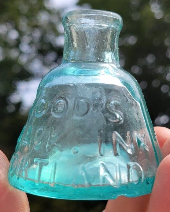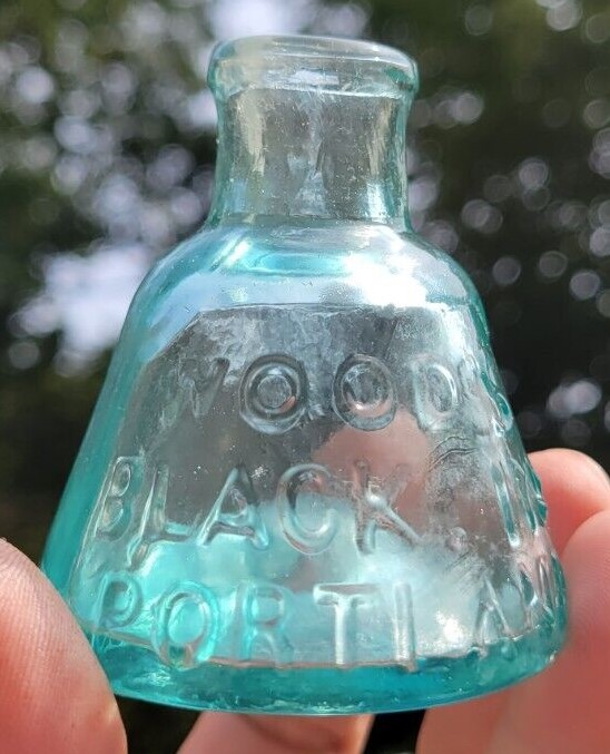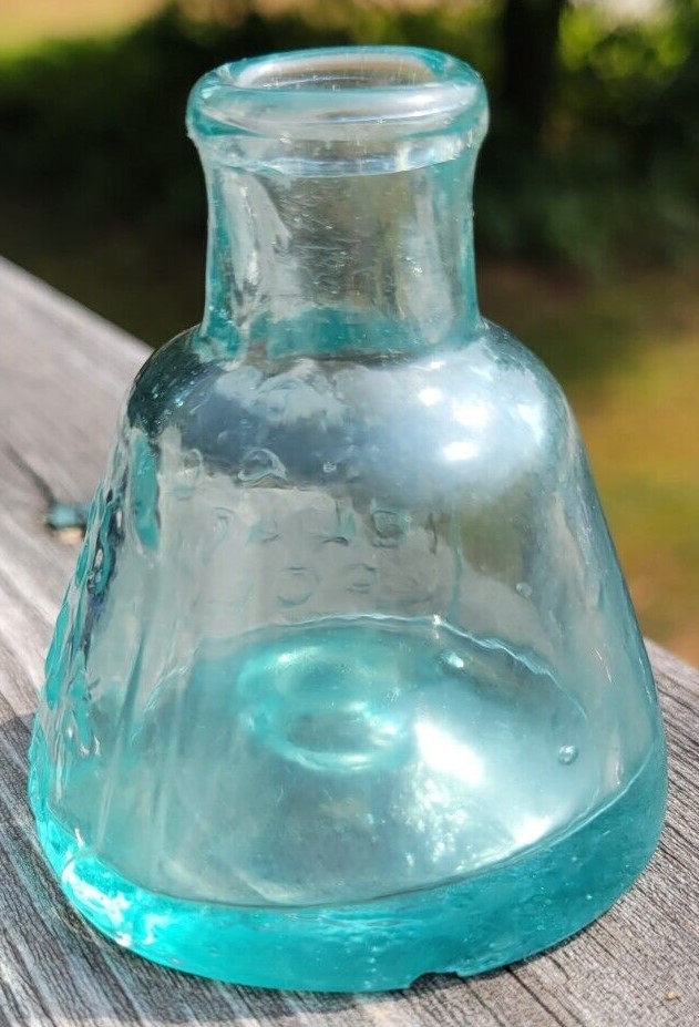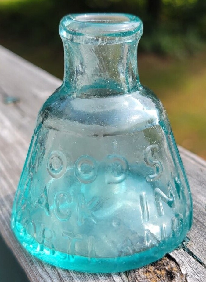 This open pontil Wood’s black ink bottle, cone-shaped, aqua in color has a few flakes / small chips on the base. This bottle was made in Portland, Maine before 1900.