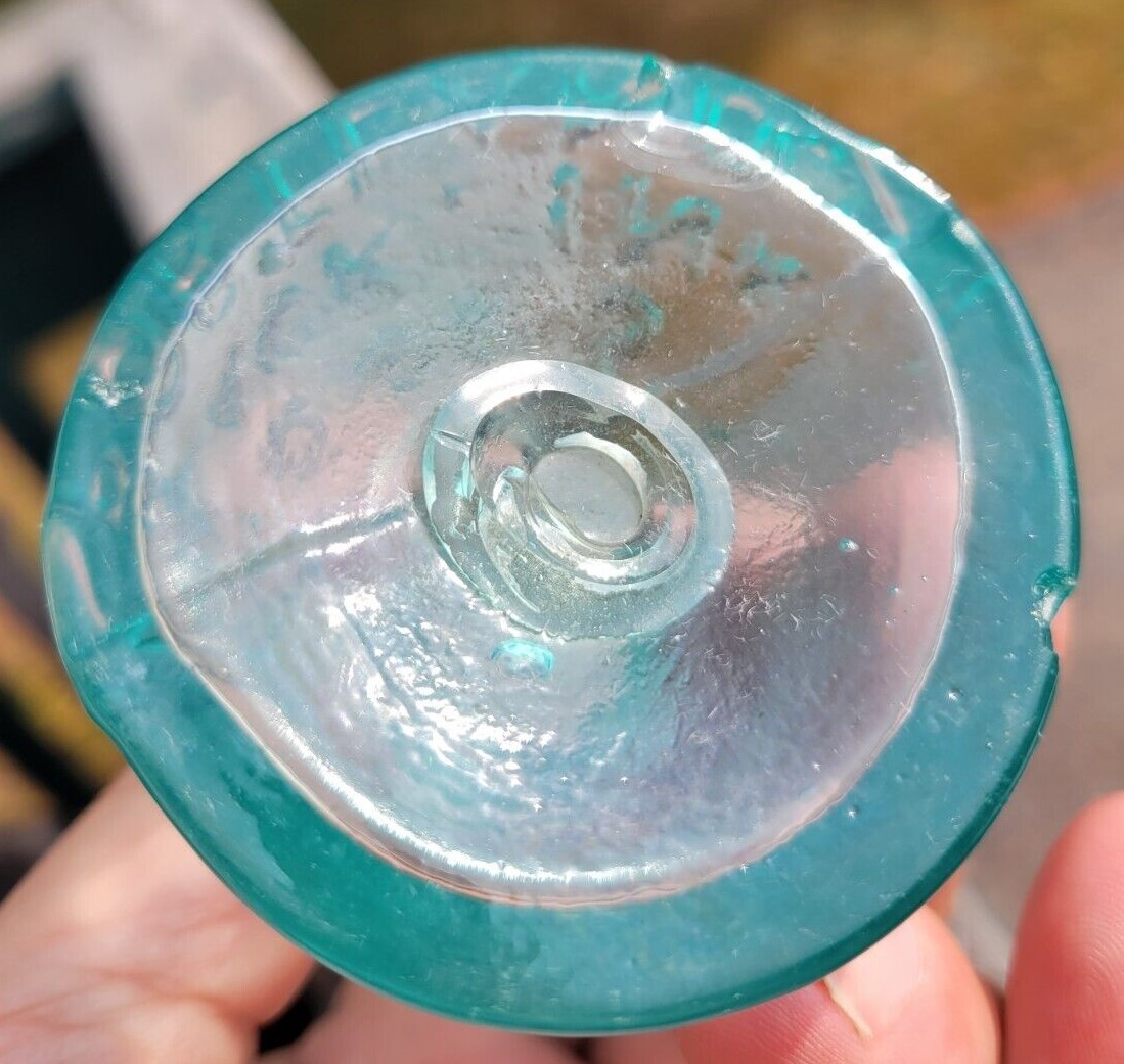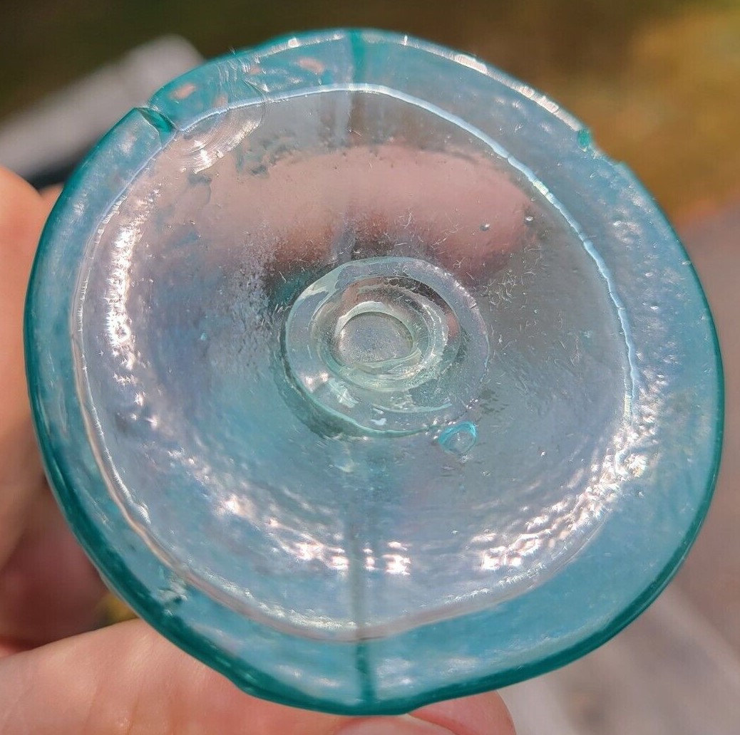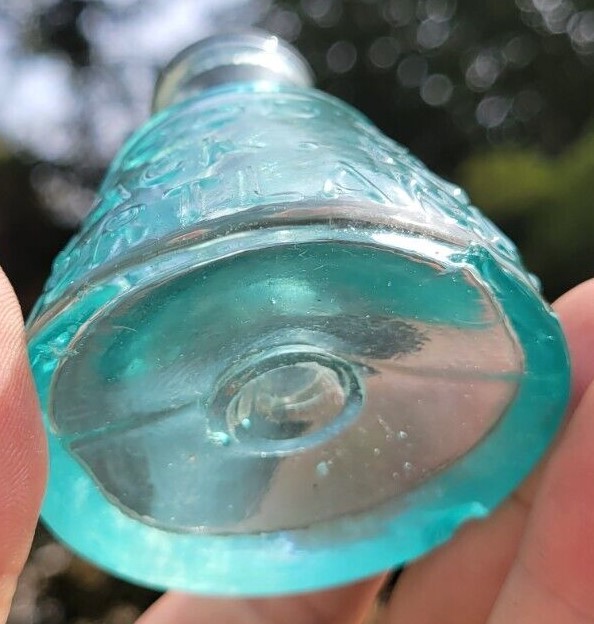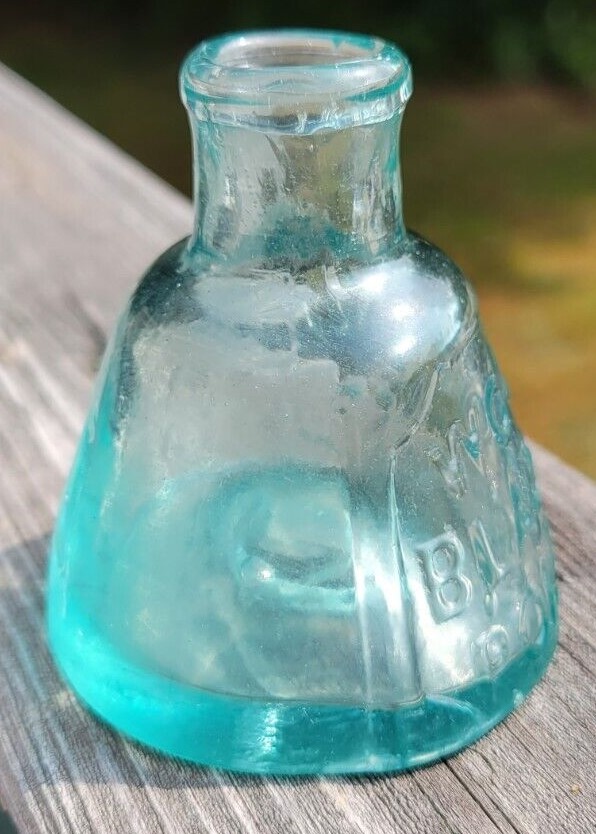 This open pontil Wood’s black ink bottle, cone-shaped, aqua in color has a few flakes / small chips on the base. This bottle was made in Portland, Maine before 1900.
