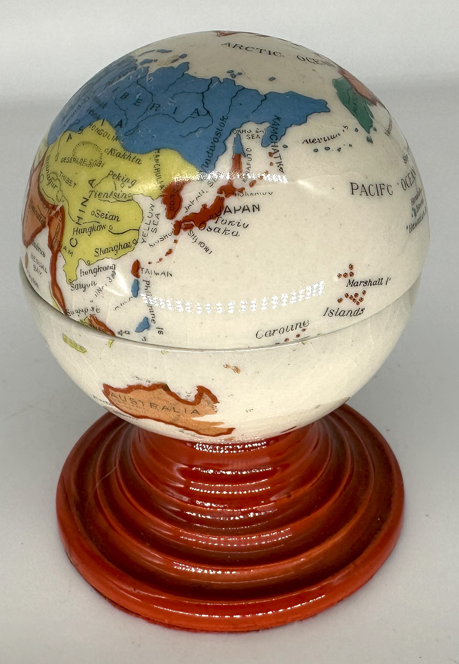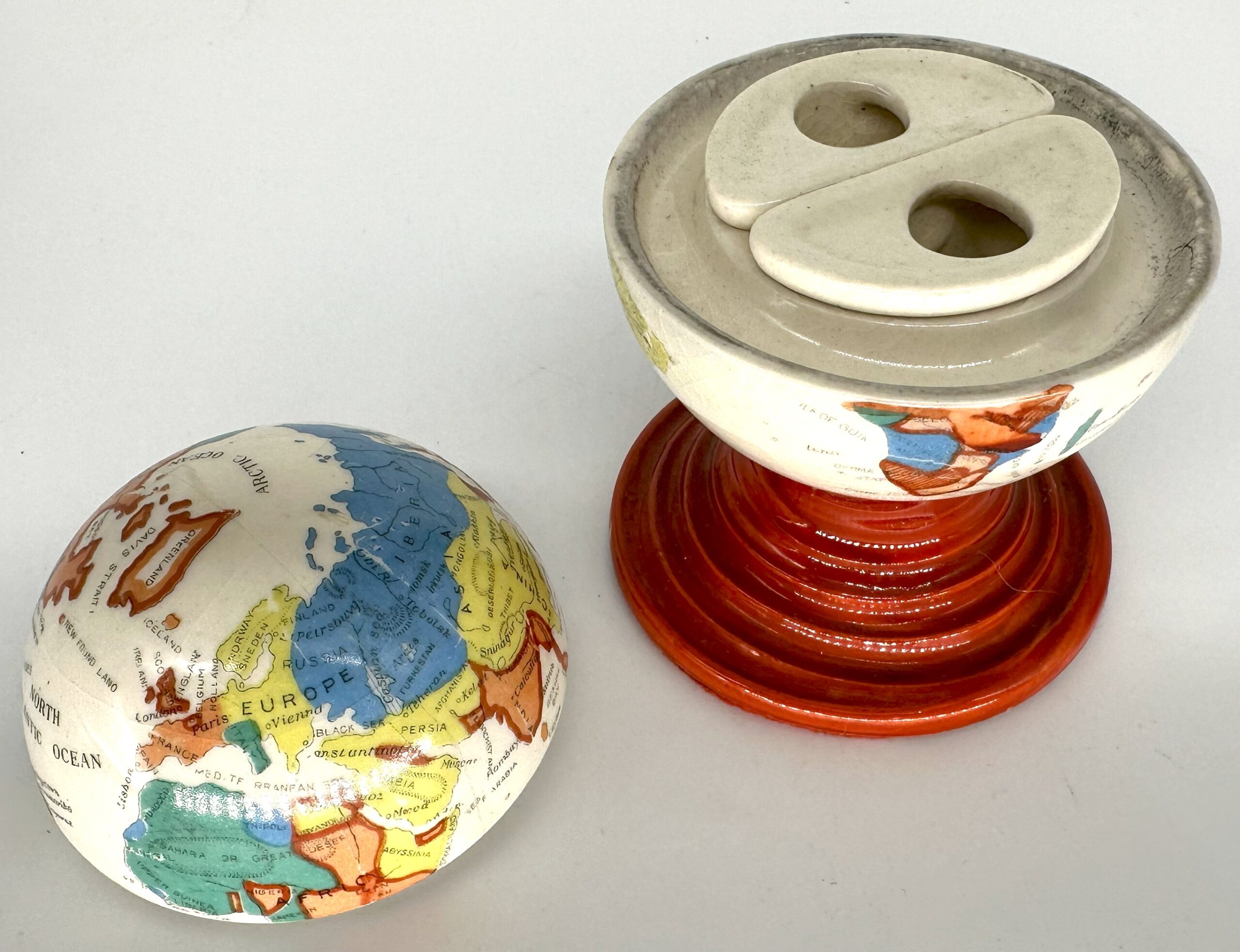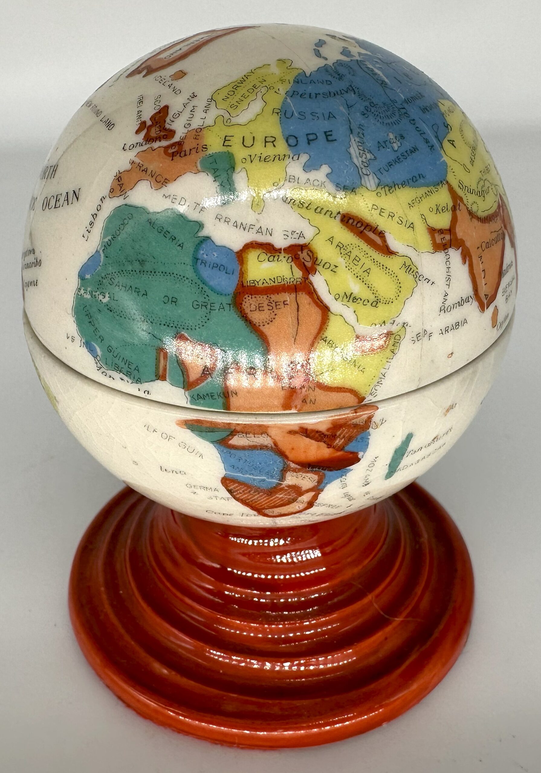 Ceramic world globe on a tiered circular base. Transfer printed, polychrome exterior with two ceramic inkwells inside. All the markings on the globe are in English, though the inkwell was made in Japan (there is an impressed Japanese mark on the bottom).