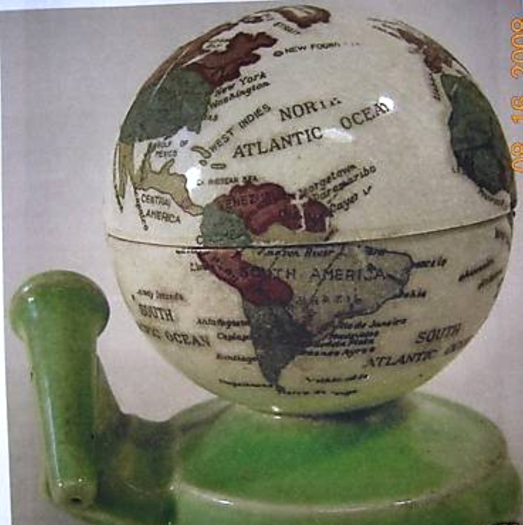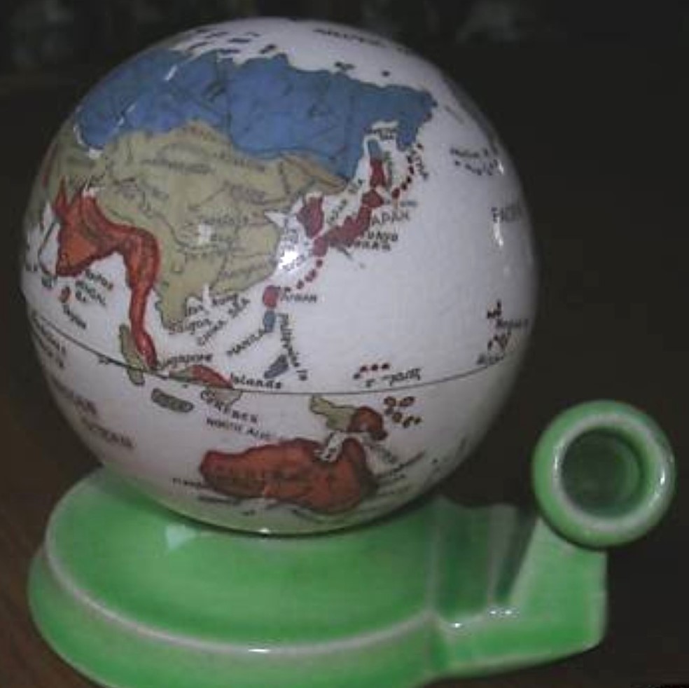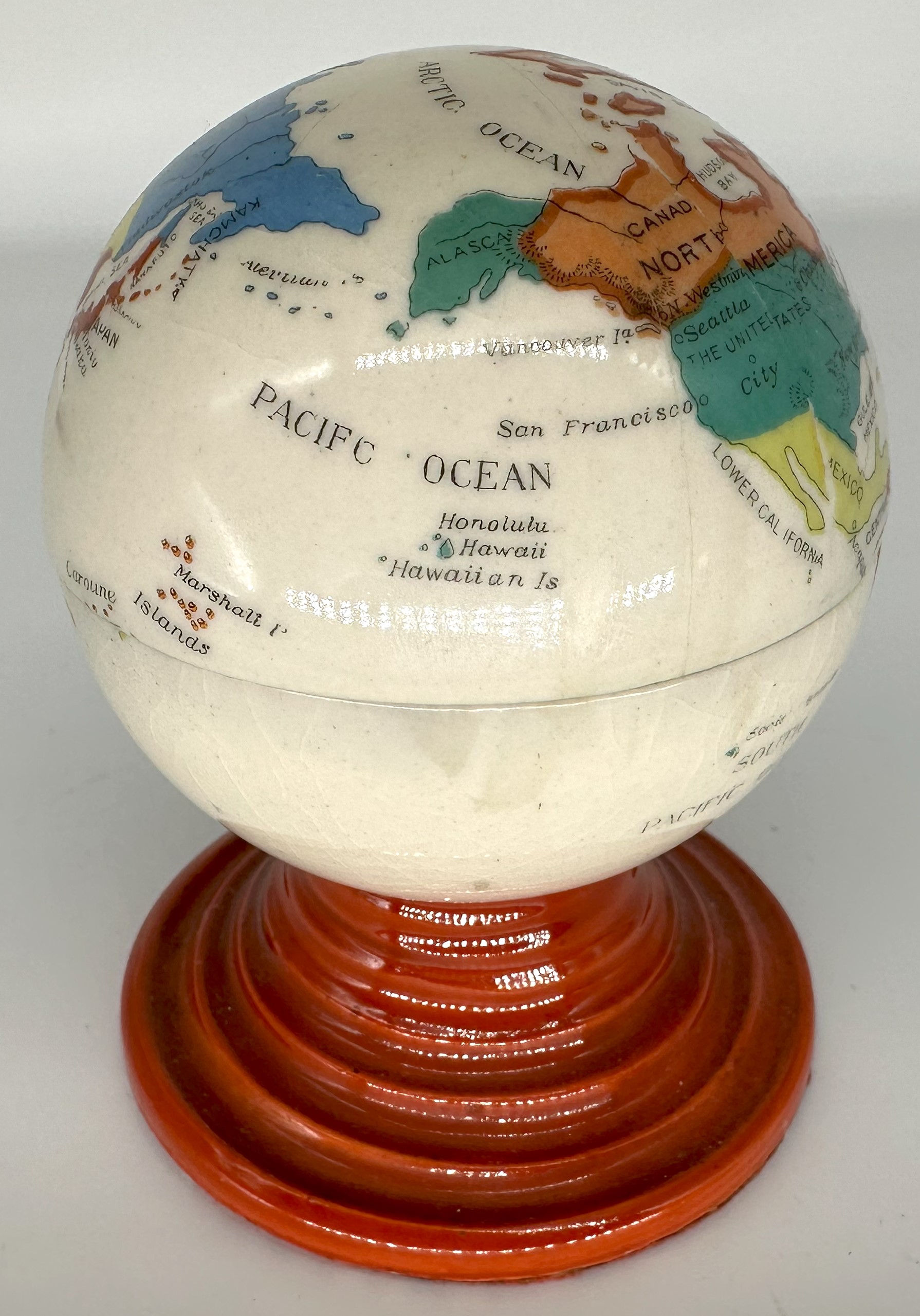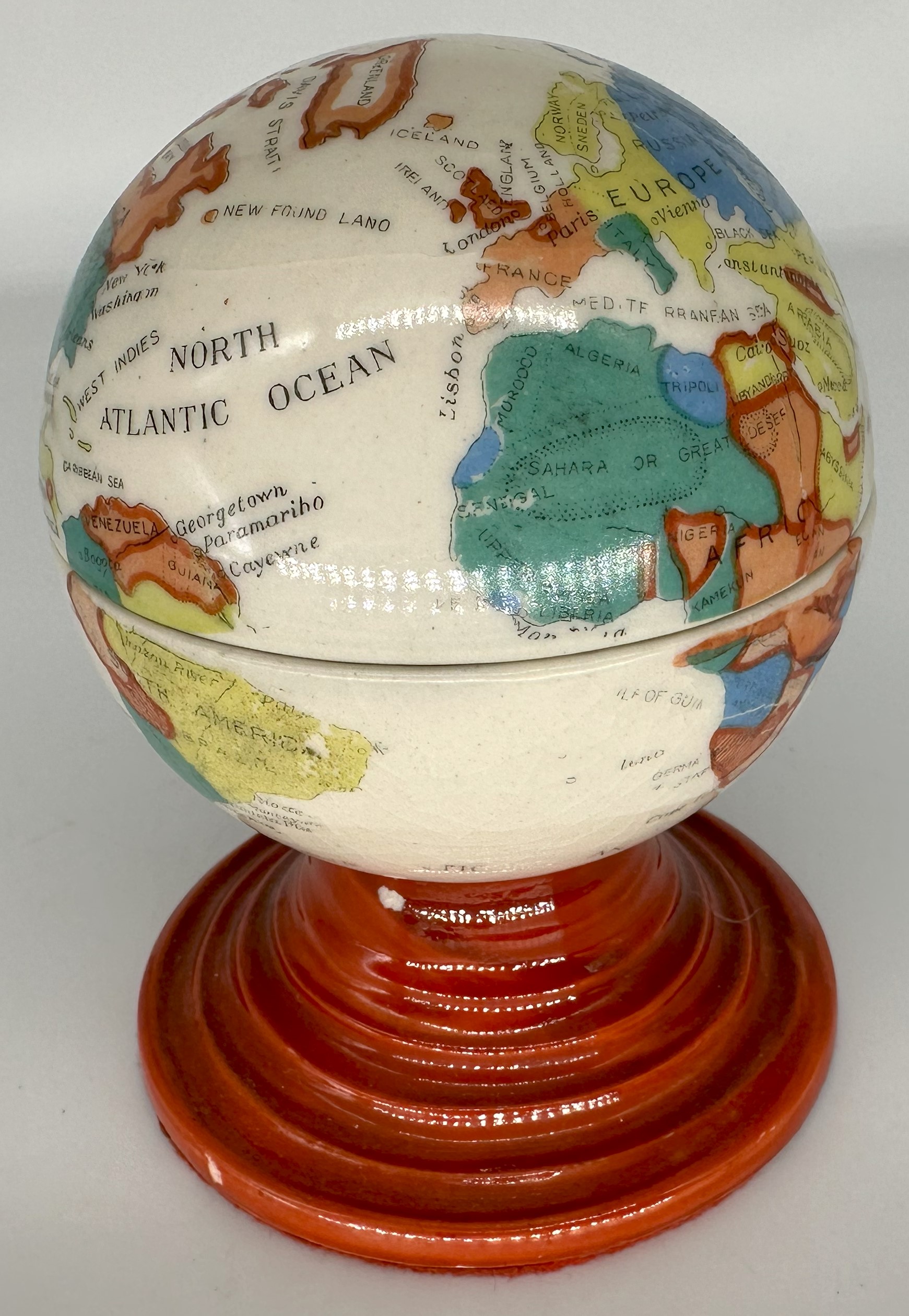Ceramic world globe on a tiered circular base. Transfer printed, polychrome exterior with two ceramic inkwells inside. All the markings on the globe are in English, though the inkwell was made in Japan (there is an impressed Japanese mark on the bottom).