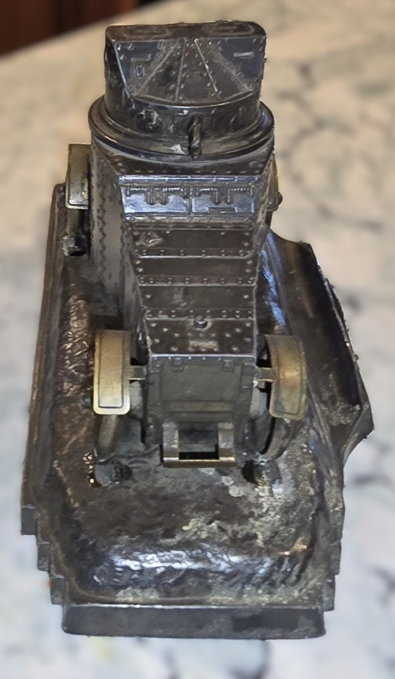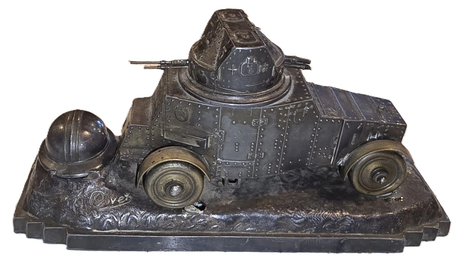 - Materials and Construction: The inkstand is cast from white metal, a common term for spelter (a zinc alloy) often used for decorative objects in the early 20th century. The casting is highly detailed, showing surface features like rivets and hatches on the vehicle.