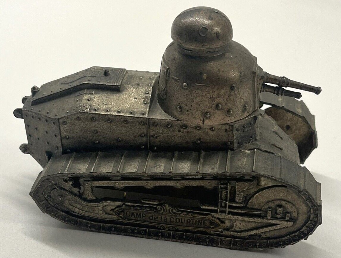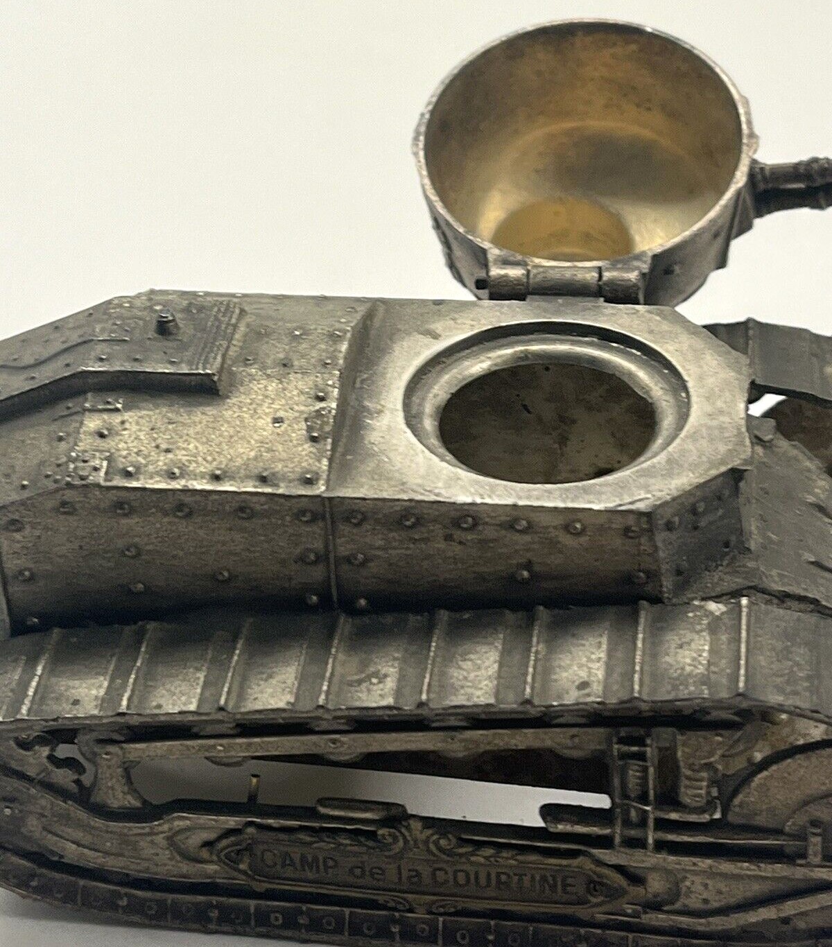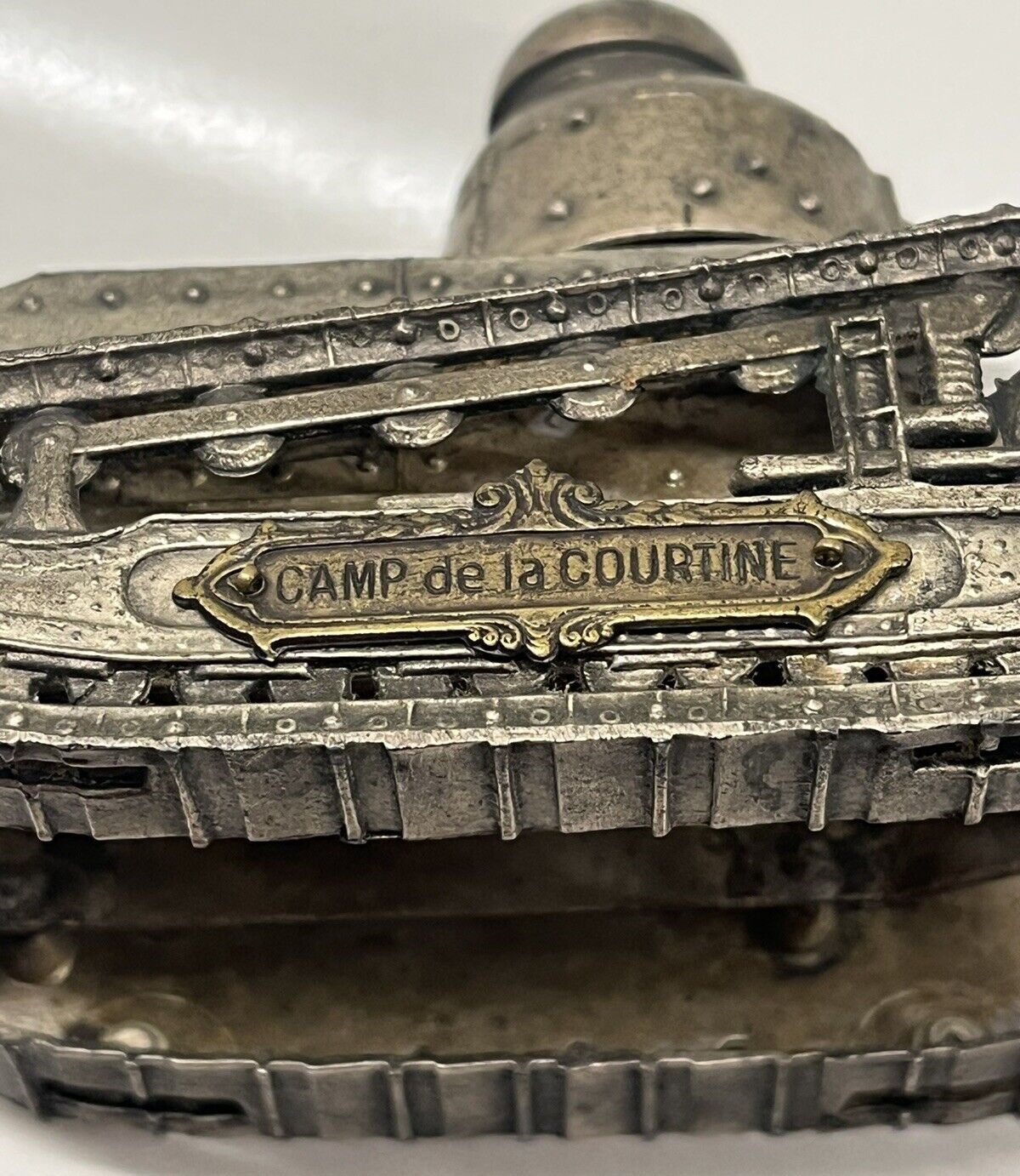 A WWI die-cast figural inkwell in the shape of a Renault FT17 tank. The turret is hinged, covering the inkpot (missing). Metal placard in the front shows “Camp de la Courtine”.