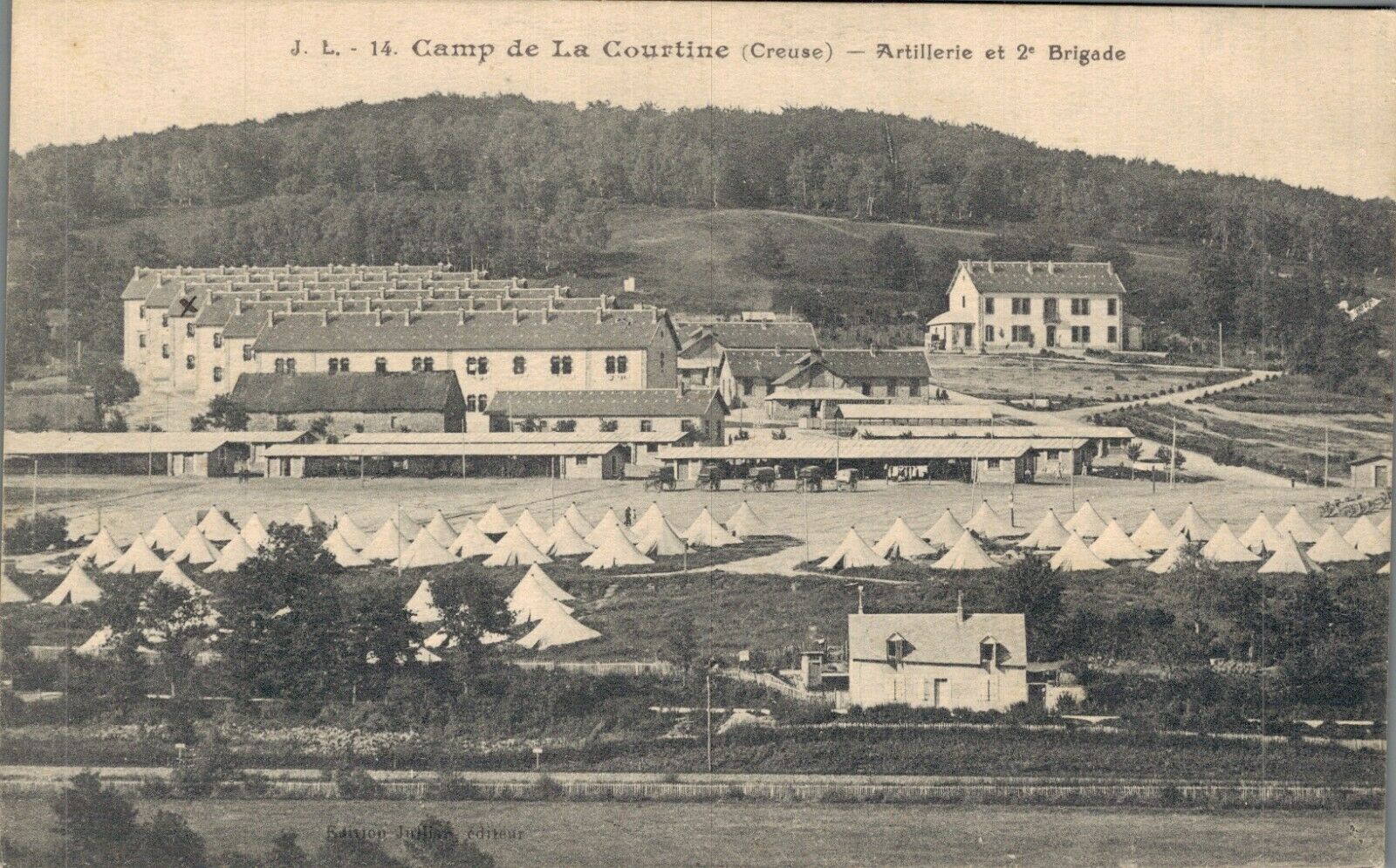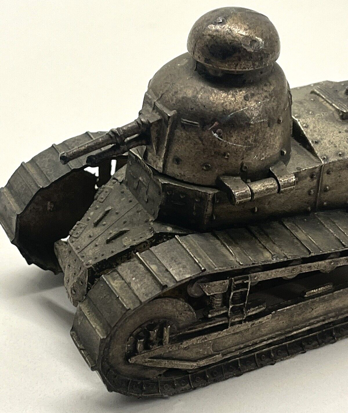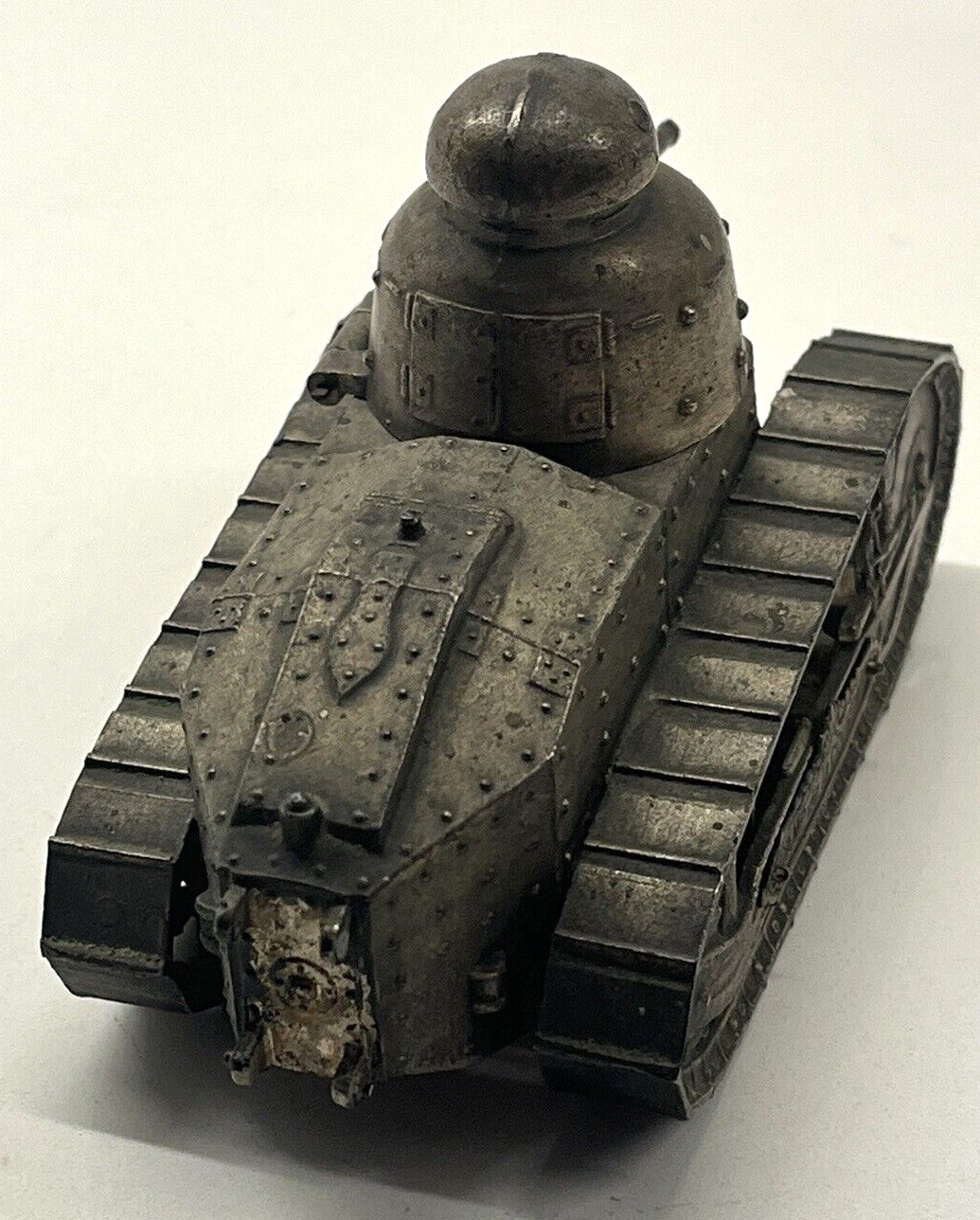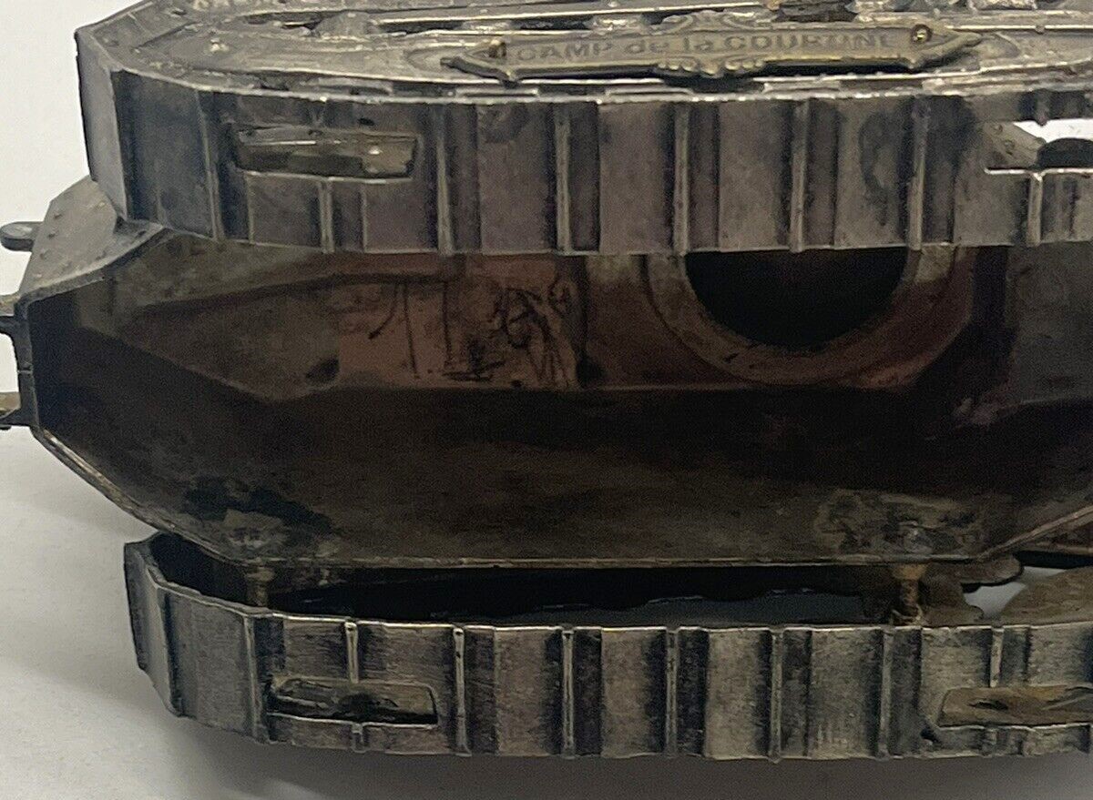 A WWI die-cast figural inkwell in the shape of a Renault FT17 tank. The turret is hinged, covering the inkpot (missing). Metal placard in the front shows “Camp de la Courtine”.