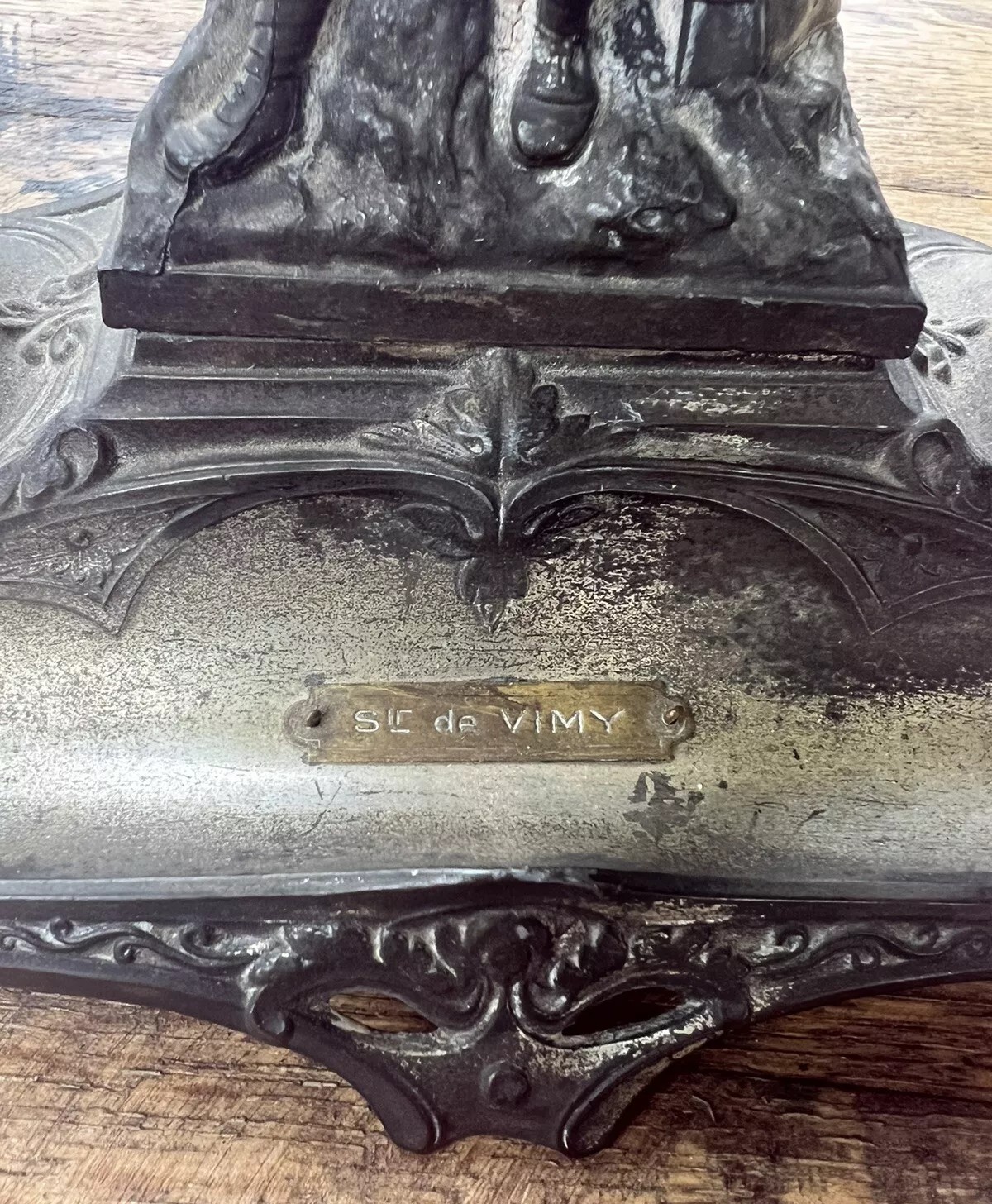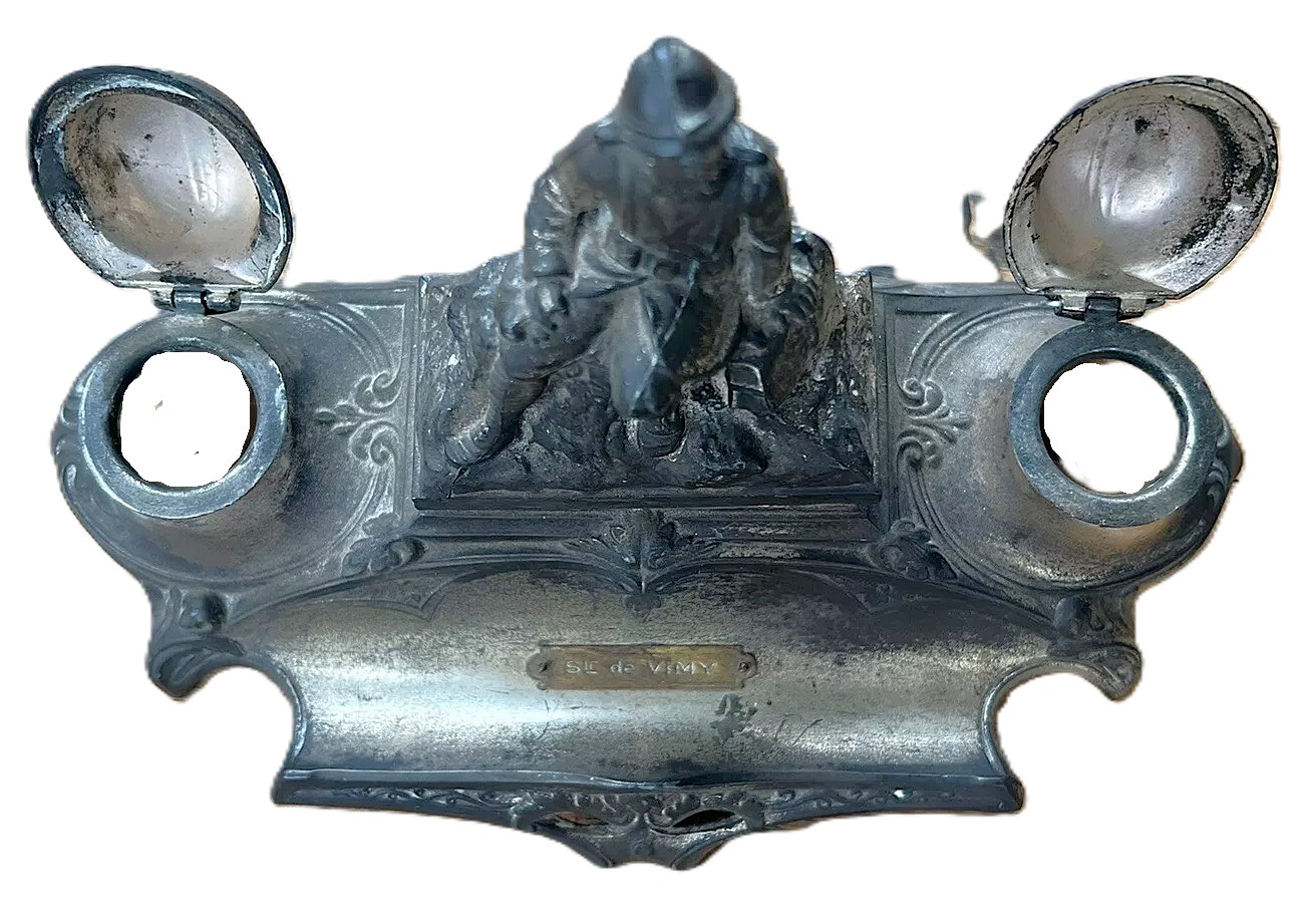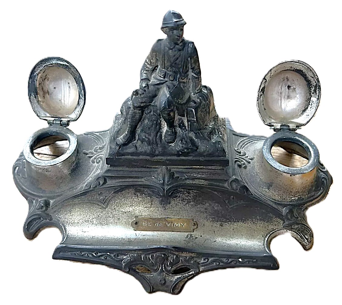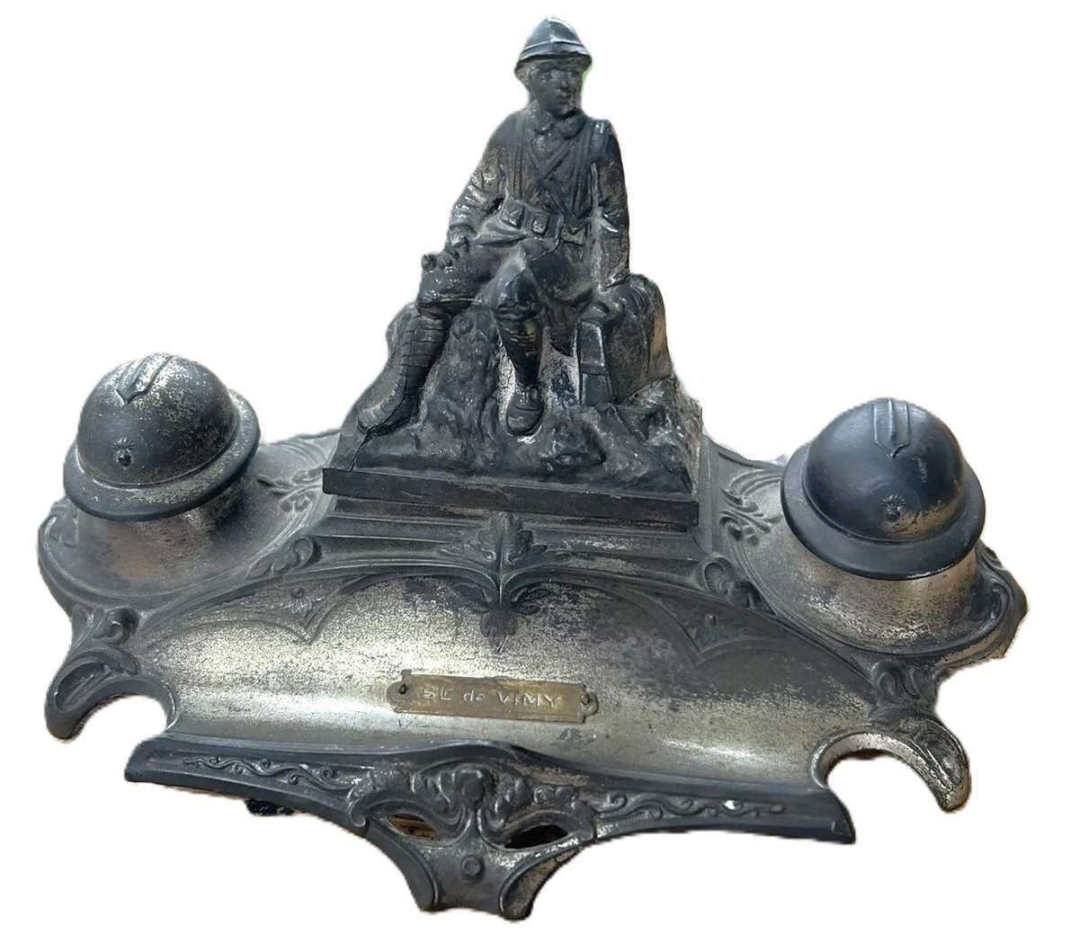 This commemorative inkstand is a tribute to the fallen inWorld War I, featuring a detailed figure of a soldier in uniform. The soldier is seated. Flanking the soldier are two dome-shaped covers resembling military helmets, which serve as the lids for the inkwells. The base of the inkstand bears the inscription “Sr de VIMY,” referring to Vimy, a significant location during the Battle of Vimy Ridge. The underside is marked “Made in France” and “509”.