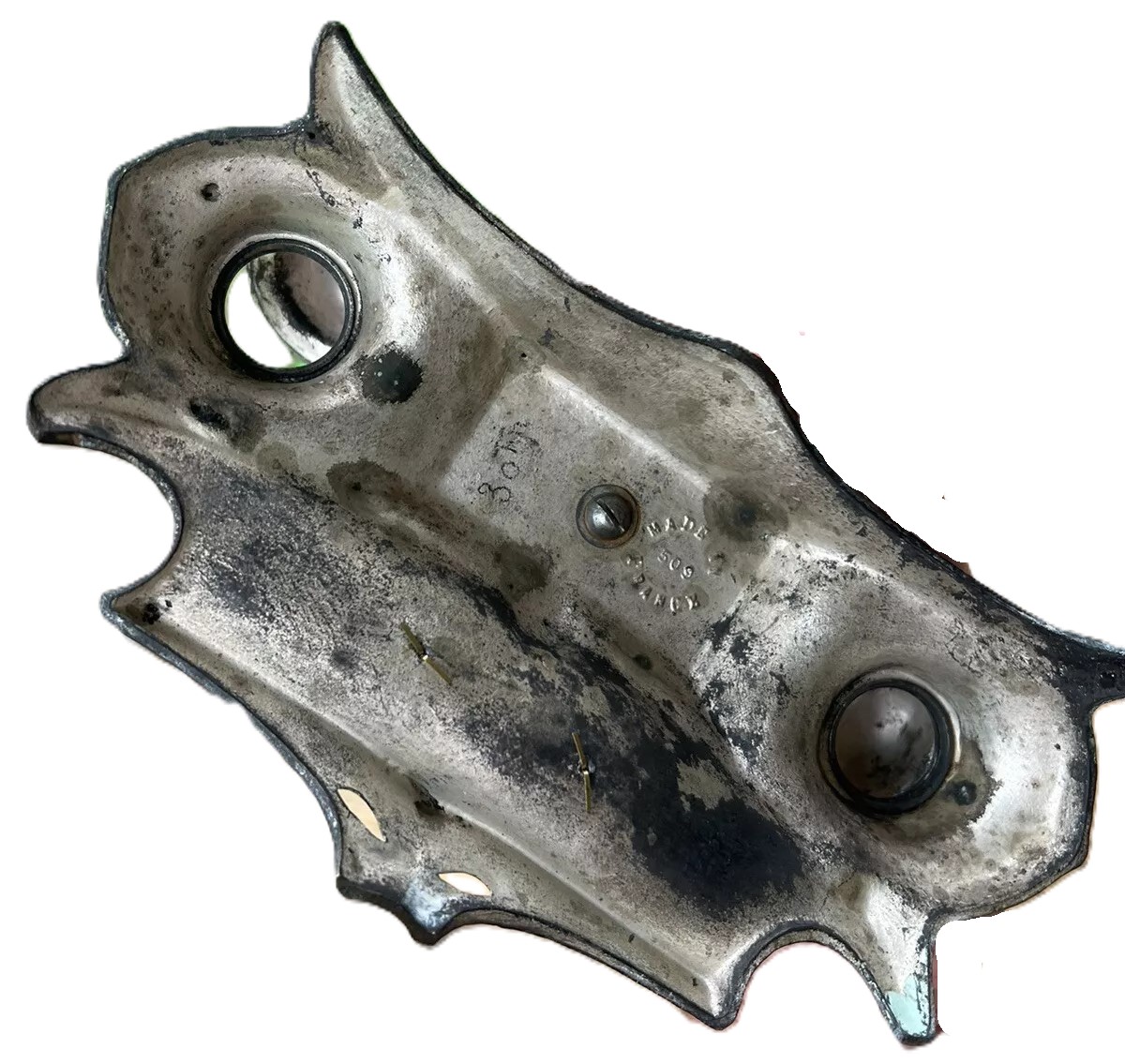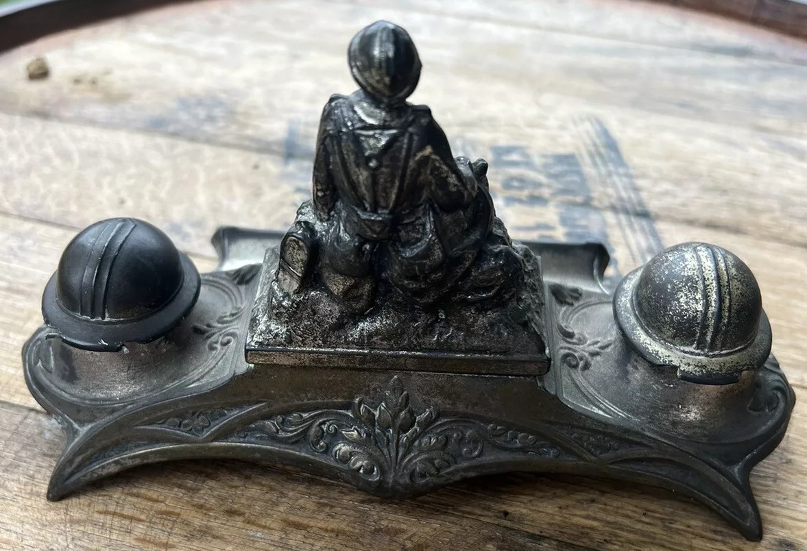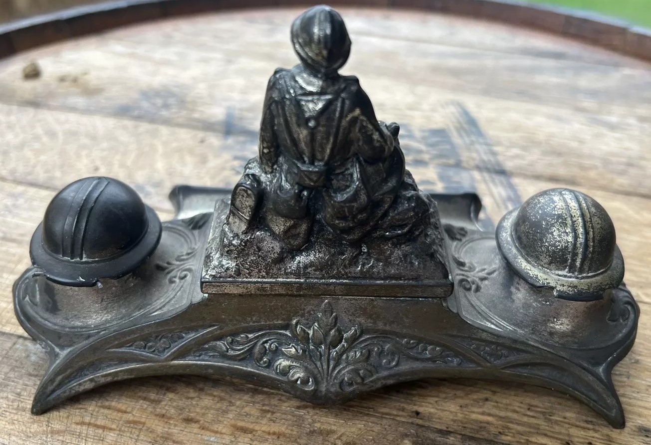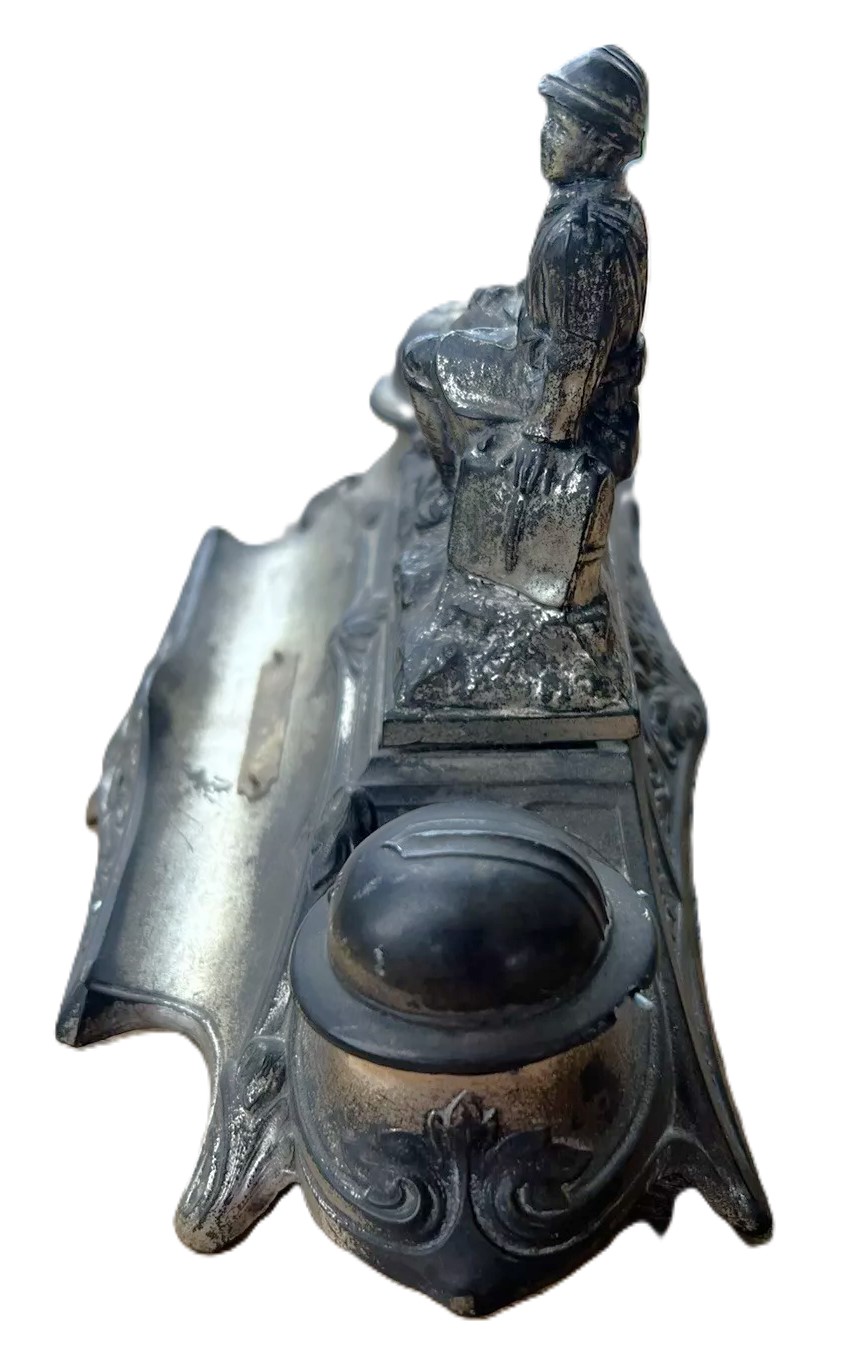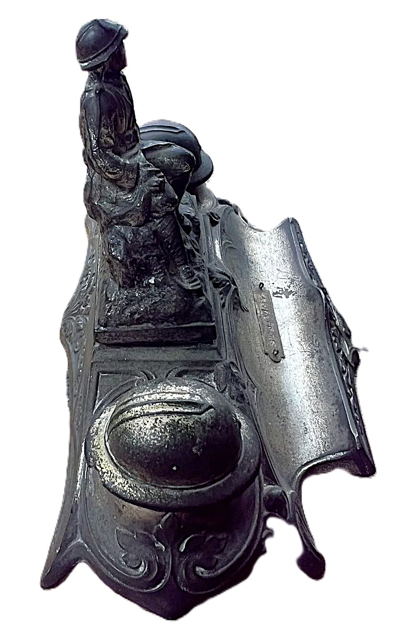 This commemorative inkstand is a tribute to the fallen inWorld War I, featuring a detailed figure of a soldier in uniform. The soldier is seated. Flanking the soldier are two dome-shaped covers resembling military helmets, which serve as the lids for the inkwells. The base of the inkstand bears the inscription “Sr de VIMY,” referring to Vimy, a significant location during the Battle of Vimy Ridge. The underside is marked “Made in France” and “509”.