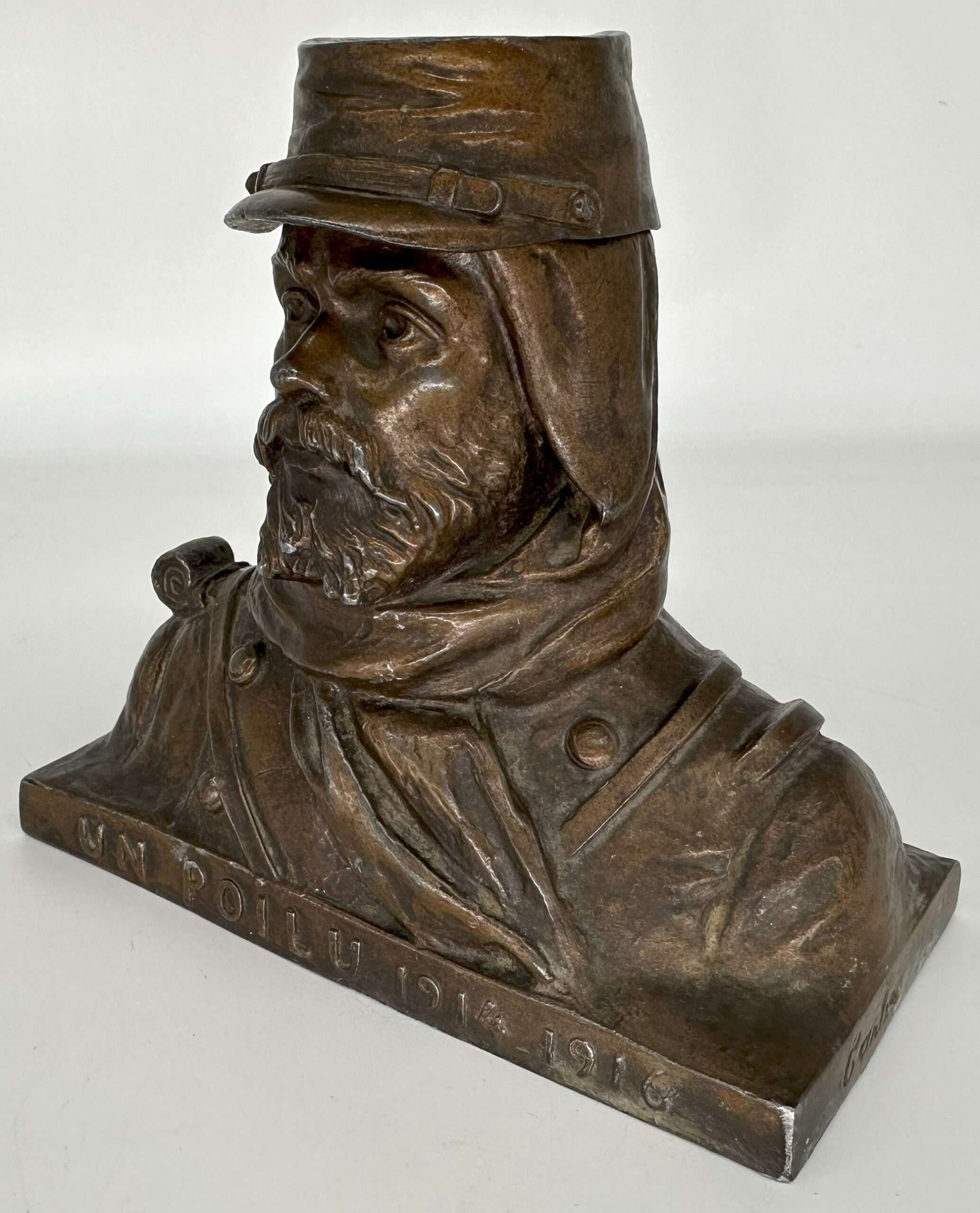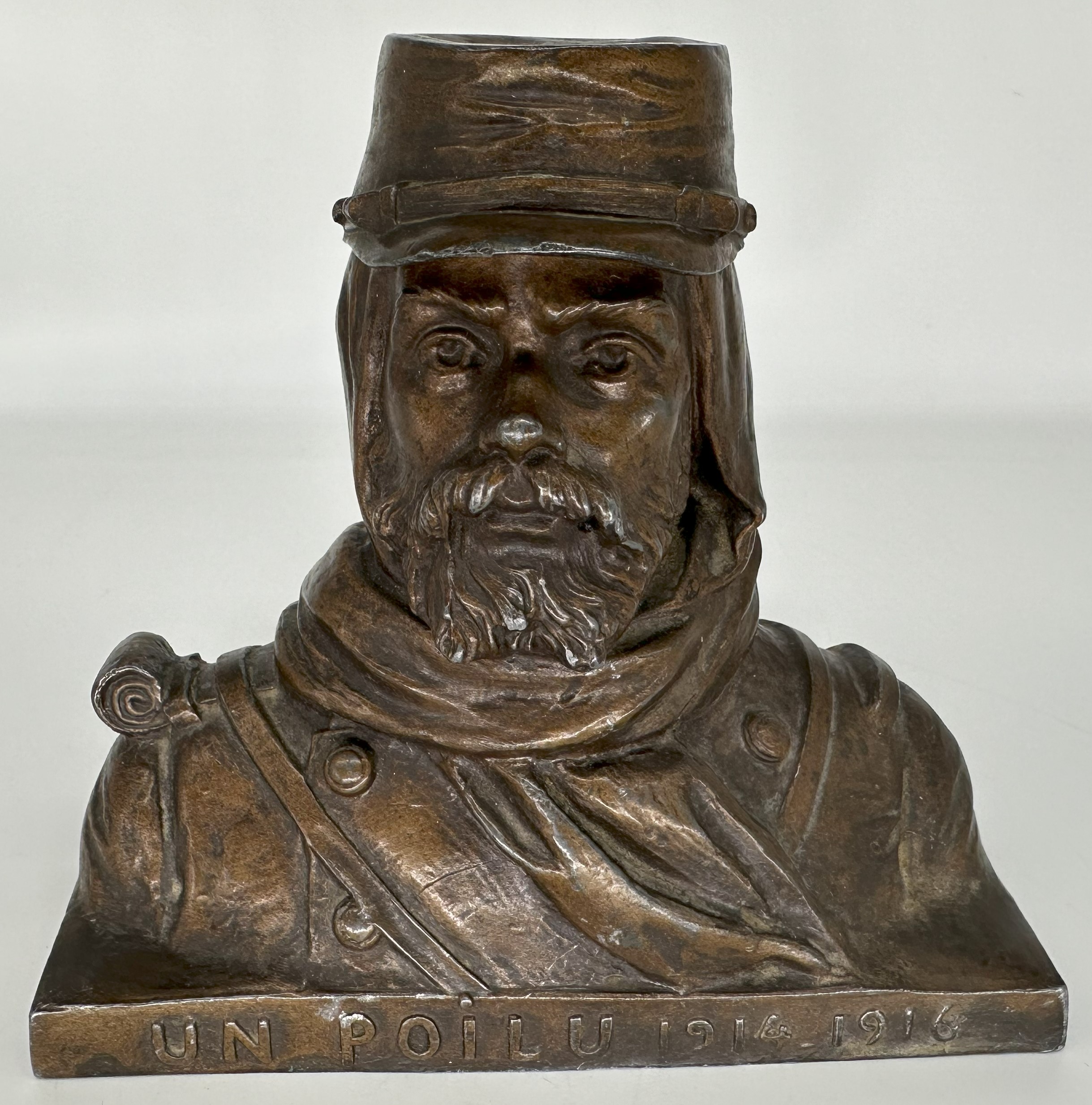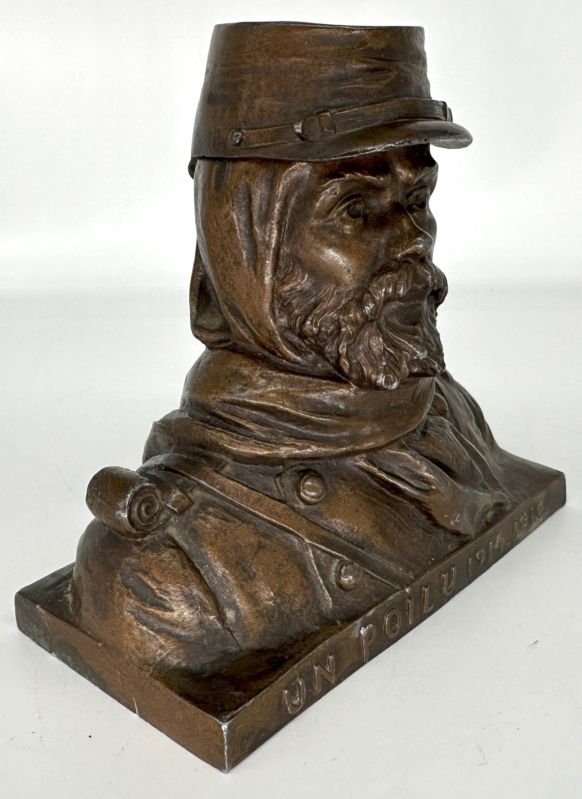 This inkwell is marked “Un Poilu 1914 – 1916”. The term “Poilu” translates to “hairy one” in French. It was a nickname commonly used for French army infantrymen, particularly during World War I. “Poilu” carries the sense of the infantryman’s typically rustic, agricultural background. Beards and bushy moustaches were often worn. The poilu was particularly known for his love of pinard, his ration of cheap wine. These brave soldiers endured the horrors of trench warfare on the Western Front. The nickname has historical roots dating back to Napoleonic times. The inkwell is a remembrance of the sacrifices made in WWI. (Note: there is an earlier version which has the dates “1914 – 1915”).