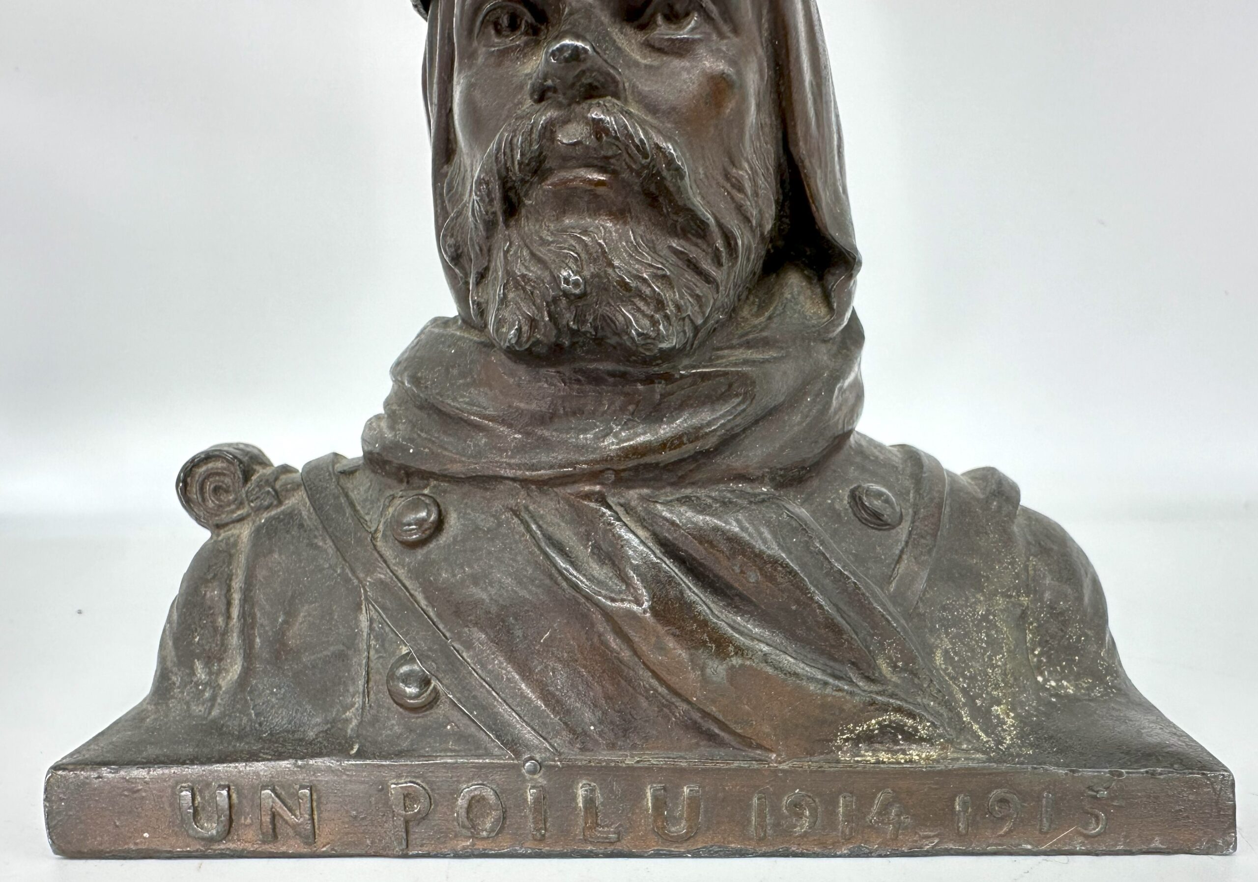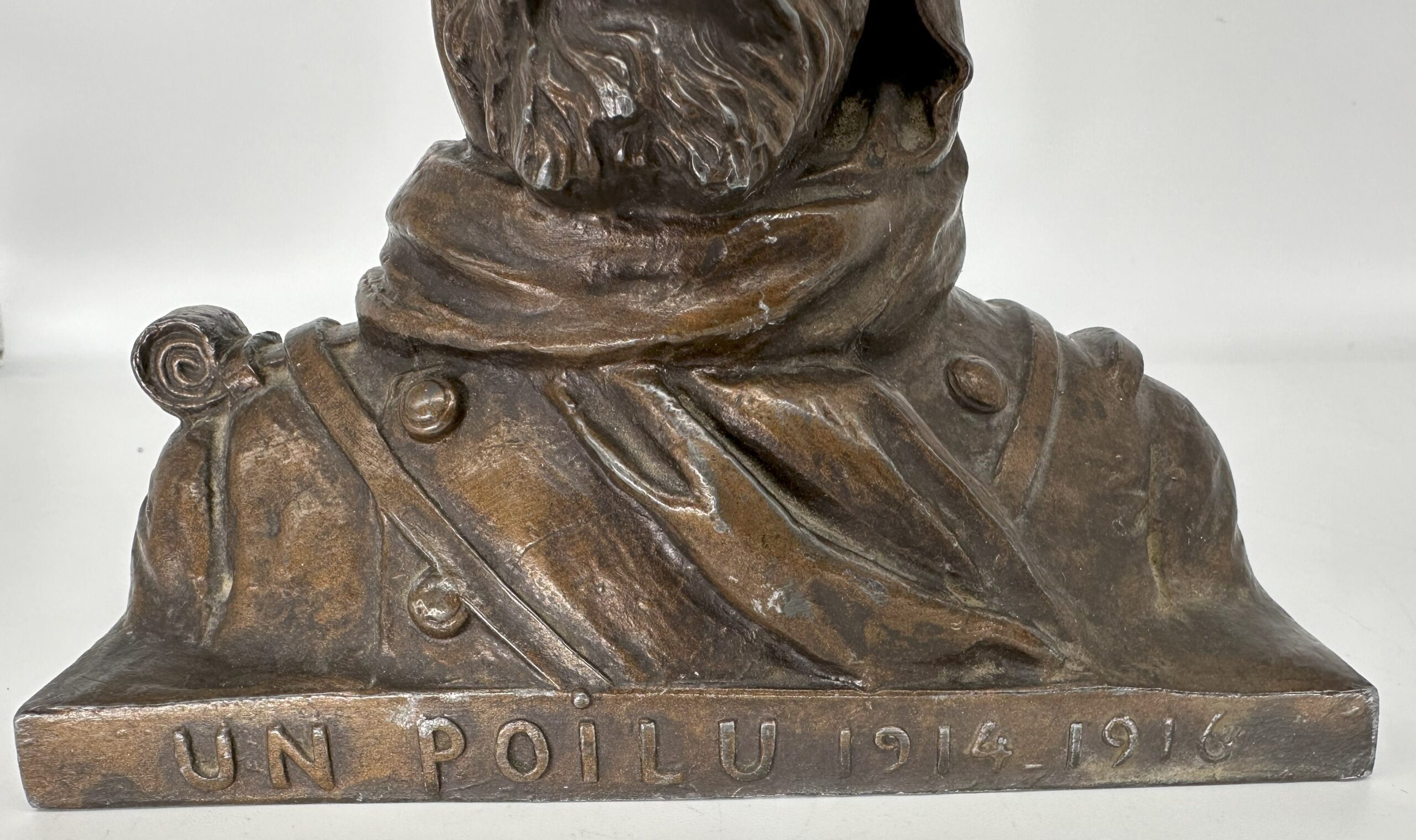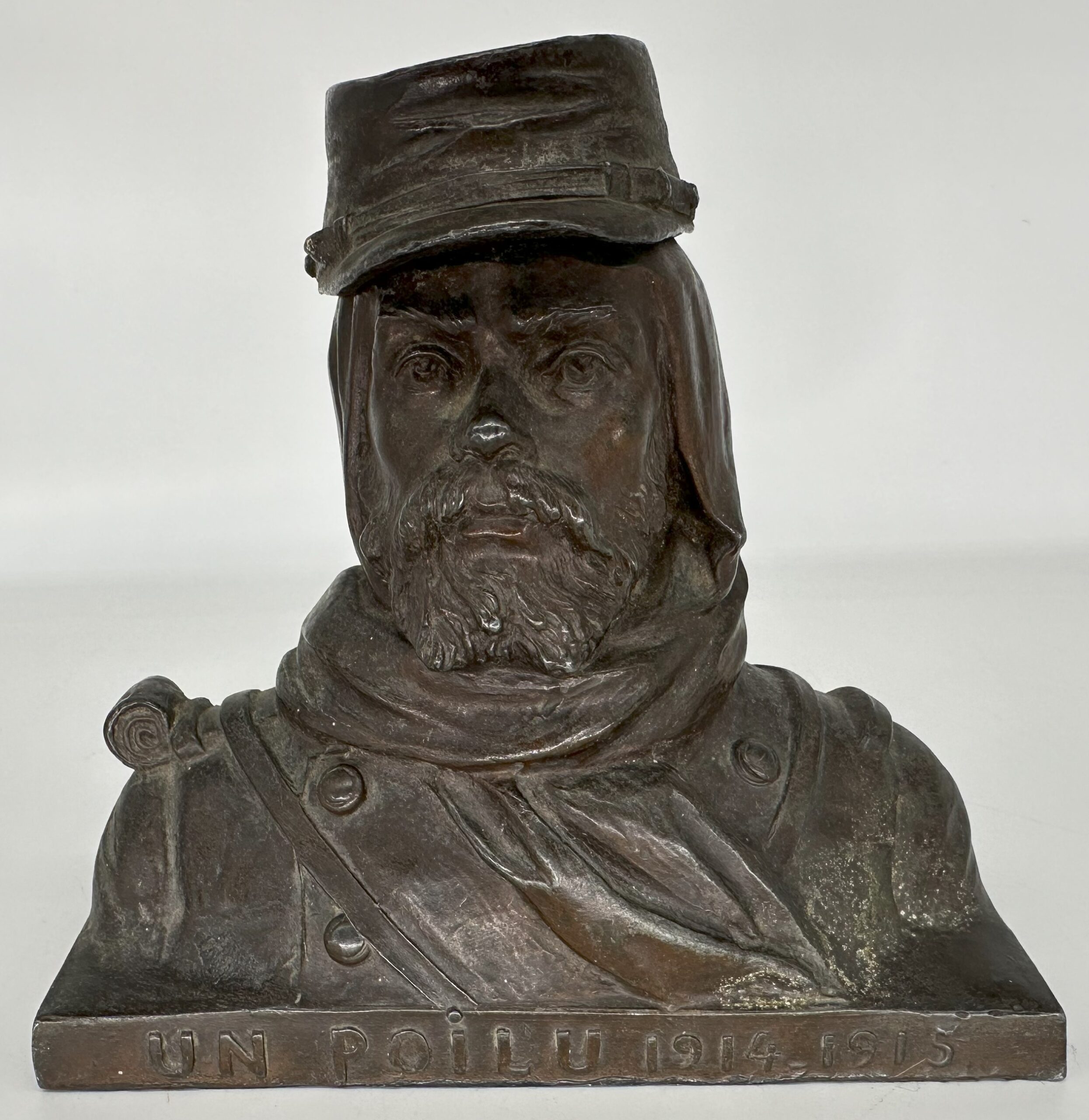This inkwell is marked “Un Poilu 1914 – 1916”. The term “Poilu” translates to “hairy one” in French. It was a nickname commonly used for French army infantrymen, particularly during World War I. “Poilu” carries the sense of the infantryman’s typically rustic, agricultural background. Beards and bushy moustaches were often worn. The poilu was particularly known for his love of pinard, his ration of cheap wine. These brave soldiers endured the horrors of trench warfare on the Western Front. The nickname has historical roots dating back to Napoleonic times. The inkwell is a remembrance of the sacrifices made in WWI. (Note: there is an earlier version which has the dates “1914 – 1915”).