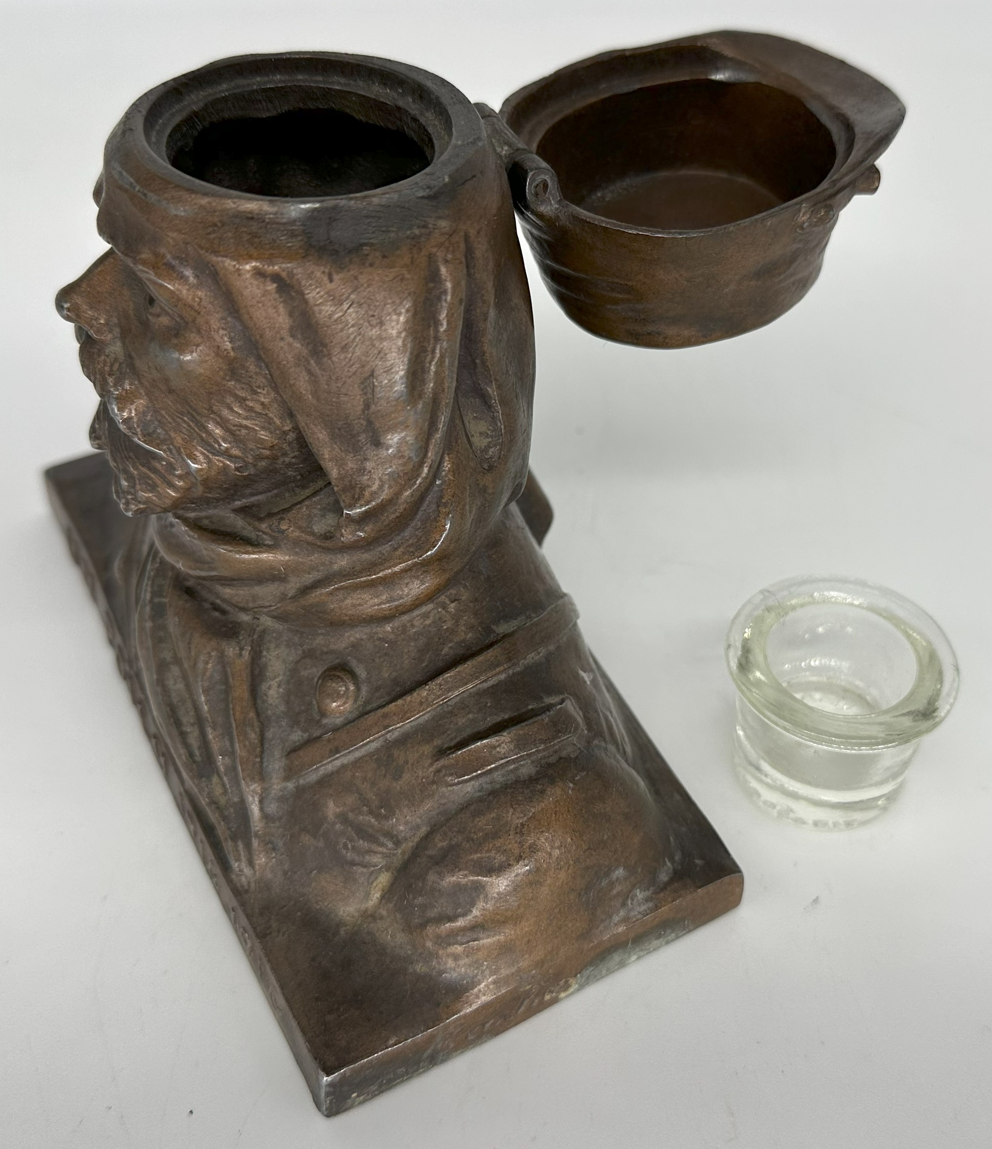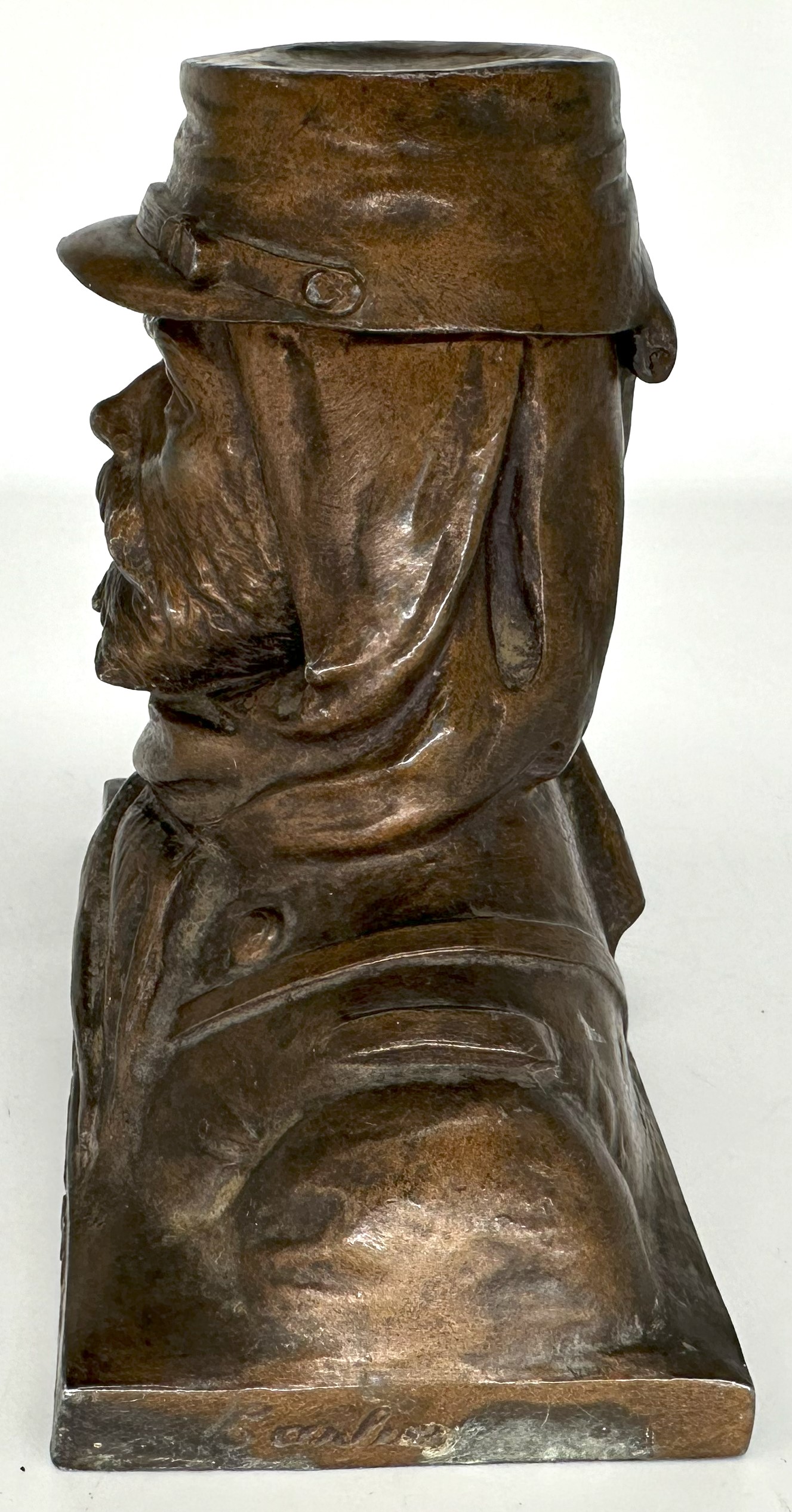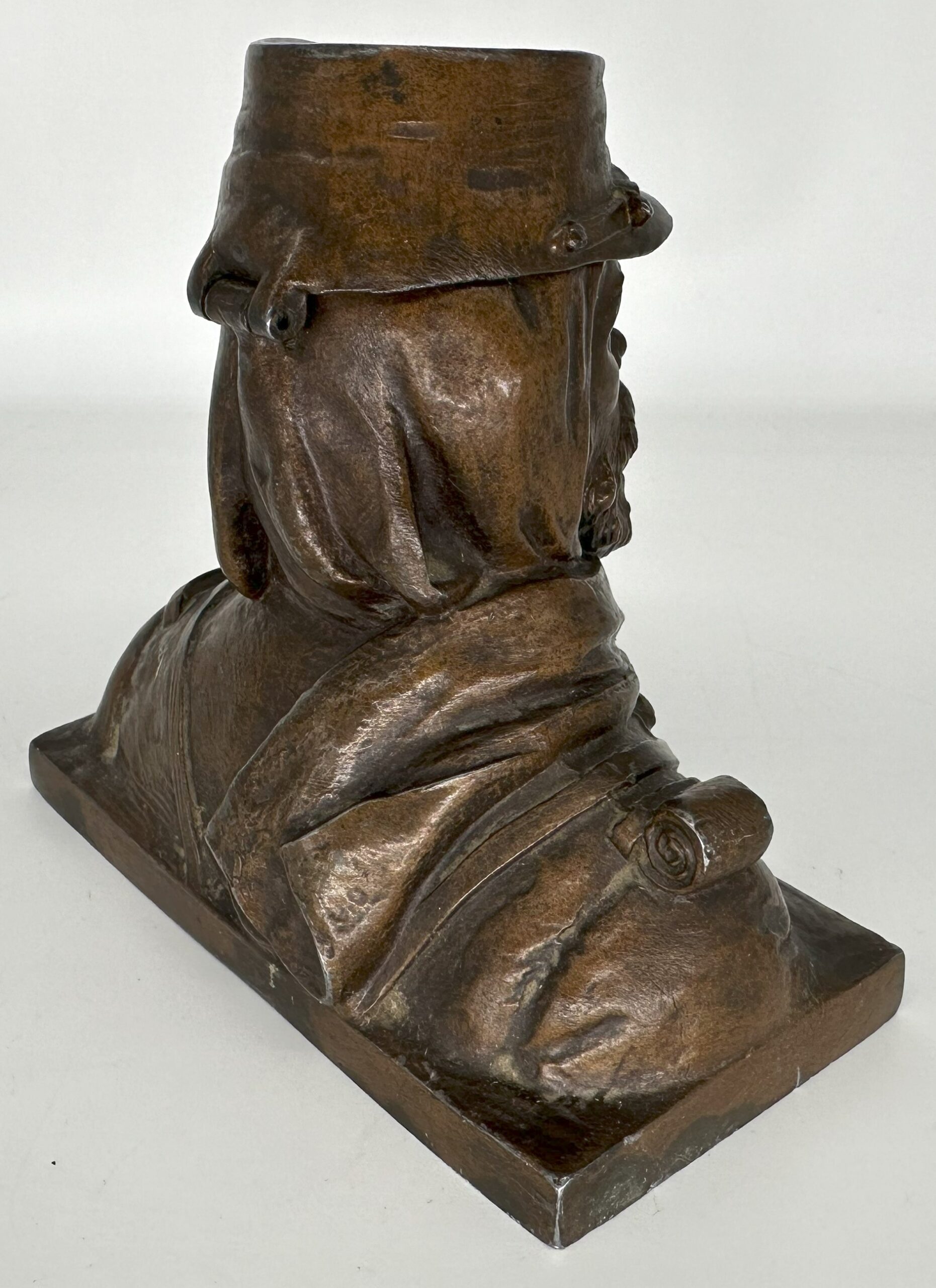 This bust shows the soldier wearing a jacket over which the straps of a satchel run, and a scarf that goes up under his hat. The hat is a military kepi and is hinged to open to the inkwell. The man has a scarred and thin face. He wears a long beard.