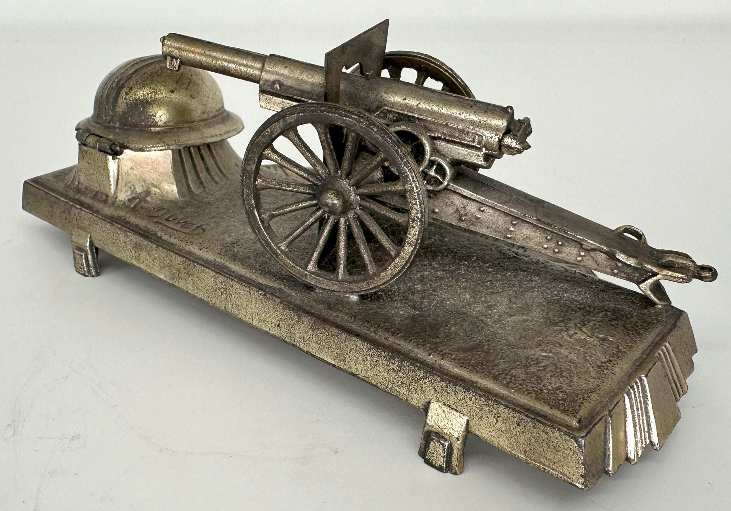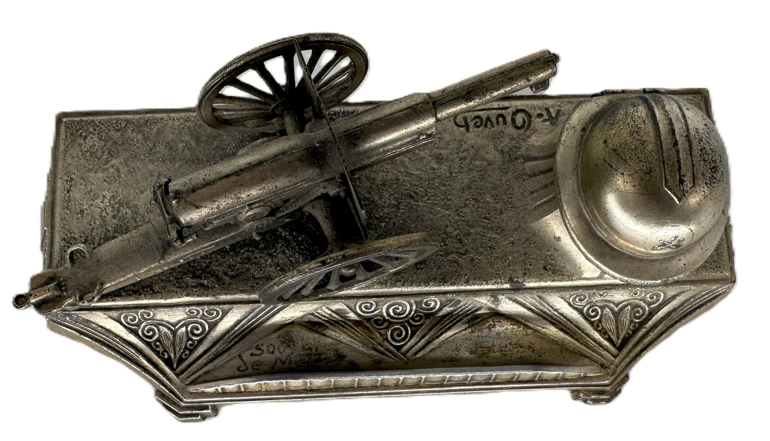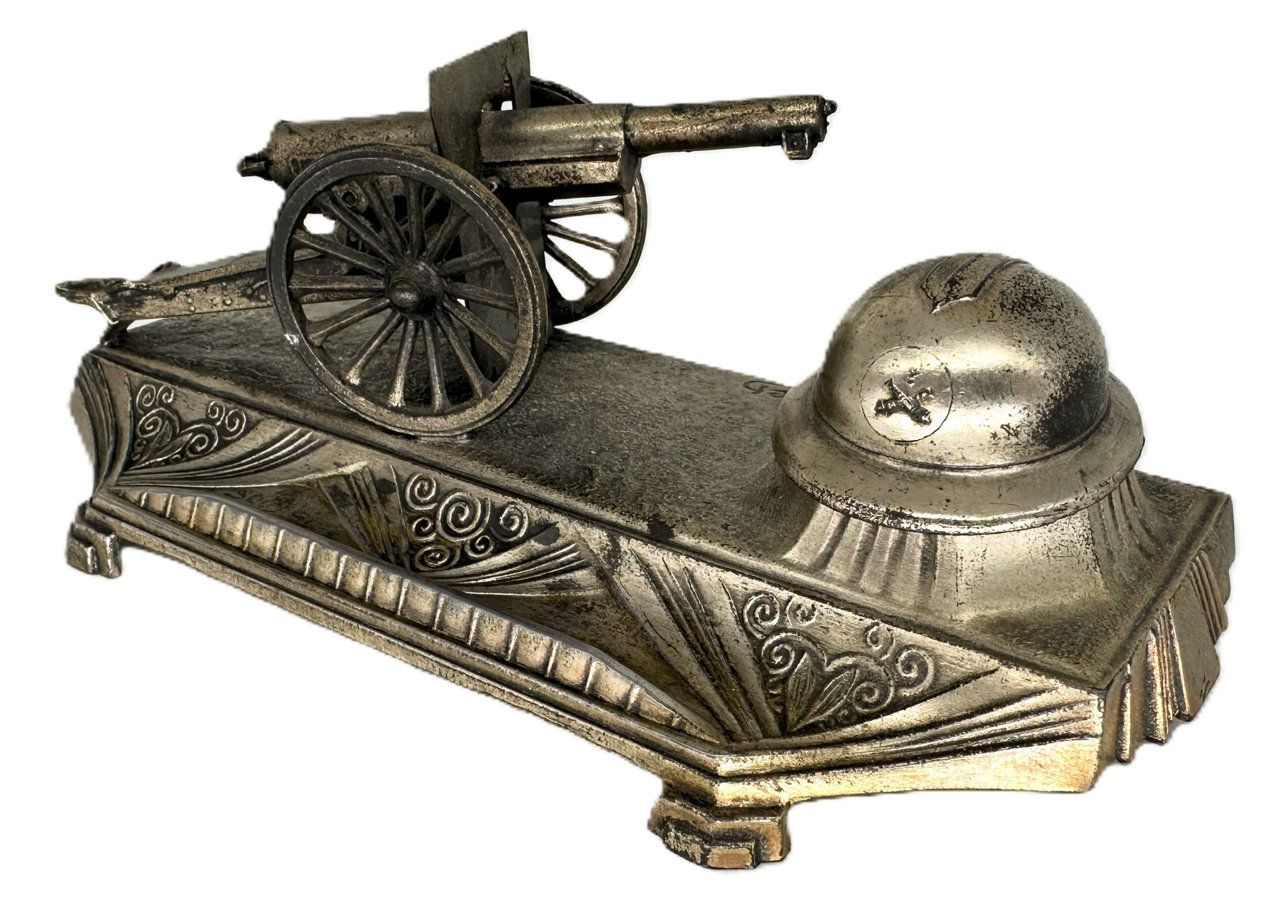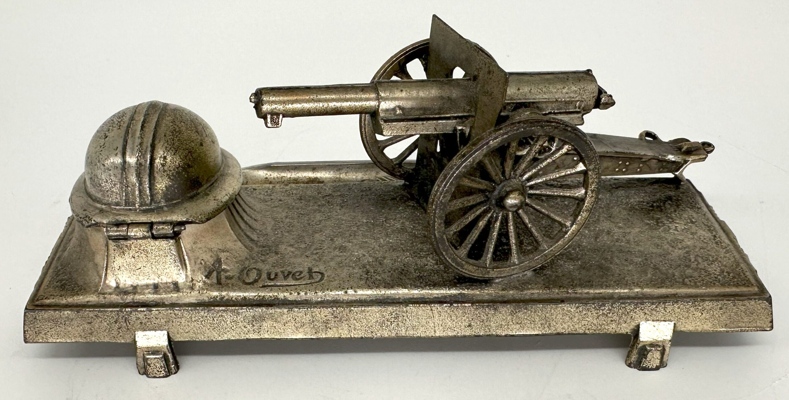 This World War I remembrance inkstand features a miniature French 75mm M1897 artillery cannon. The cannon is positioned next to a French Adrian helmet, which serves as a cover for the inkwell itself. The base of the inkwell is ornately decorated. The underside is marked “Made in France” and numbered 2006. The piece is signed “A. Ouveb” on the backside, near the helmet. Engraved on the front pen channel are the words “Souvenir Je Me Souviens,” which translates “I remember”.