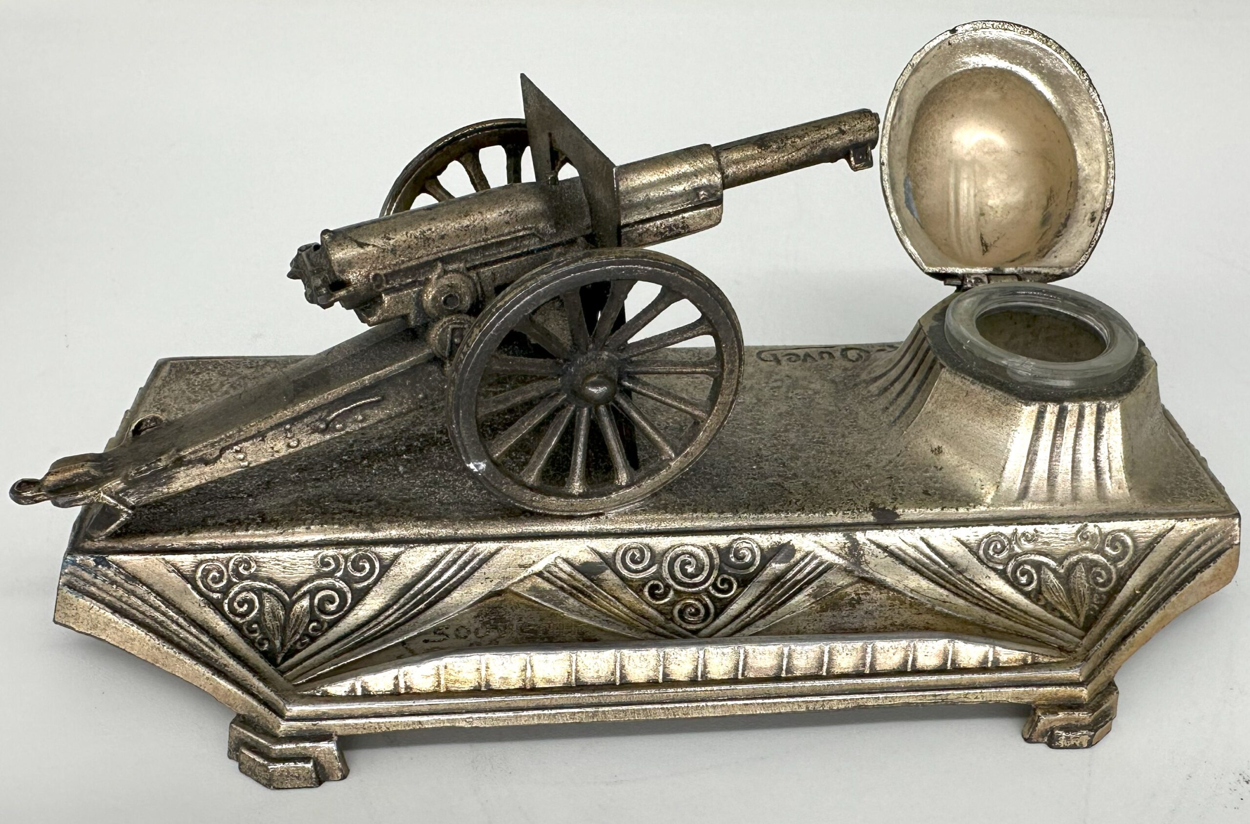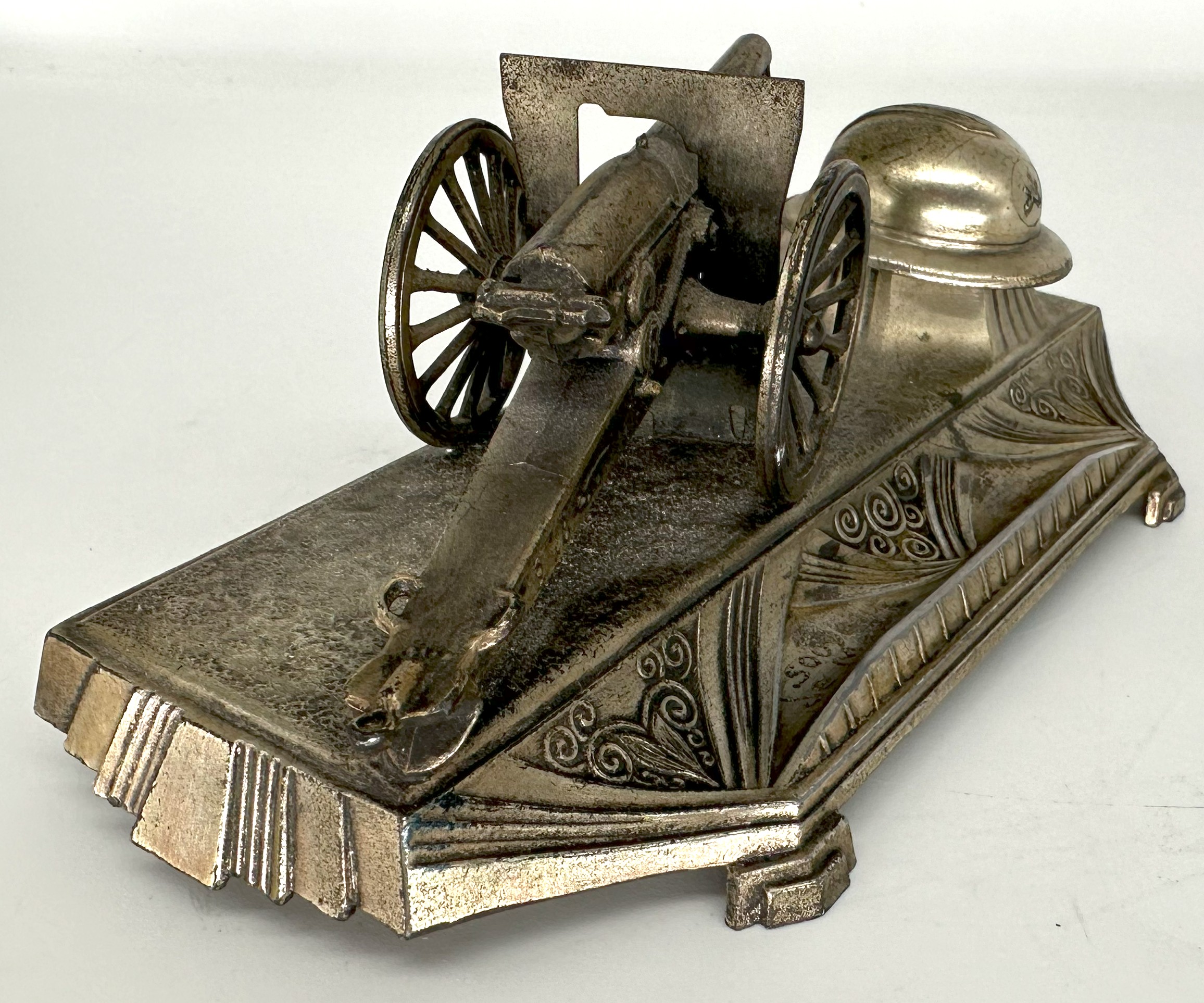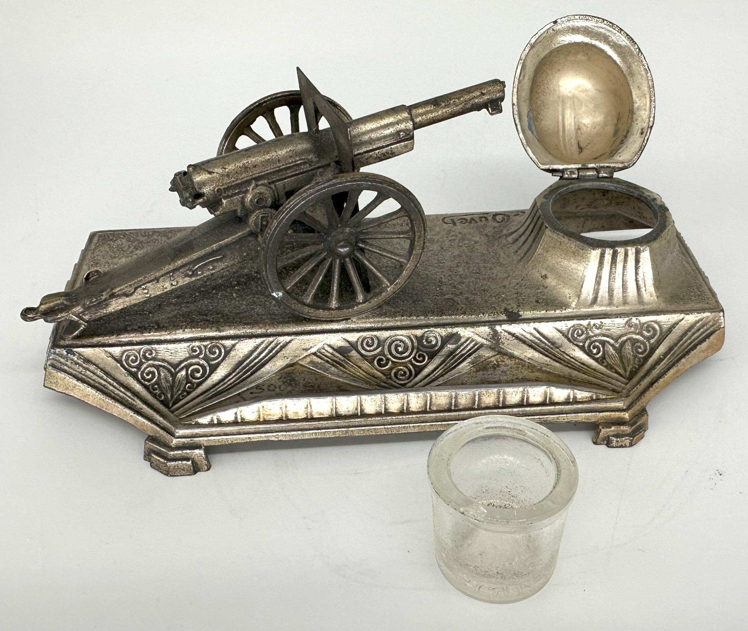 This World War I remembrance inkstand features a miniature French 75mm M1897 artillery cannon. The cannon is positioned next to a French Adrian helmet, which serves as a cover for the inkwell itself. The base of the inkwell is ornately decorated. The underside is marked “Made in France” and numbered 2006. The piece is signed “A. Ouveb” on the backside, near the helmet. Engraved on the front pen channel are the words “Souvenir Je Me Souviens,” which translates “I remember”.