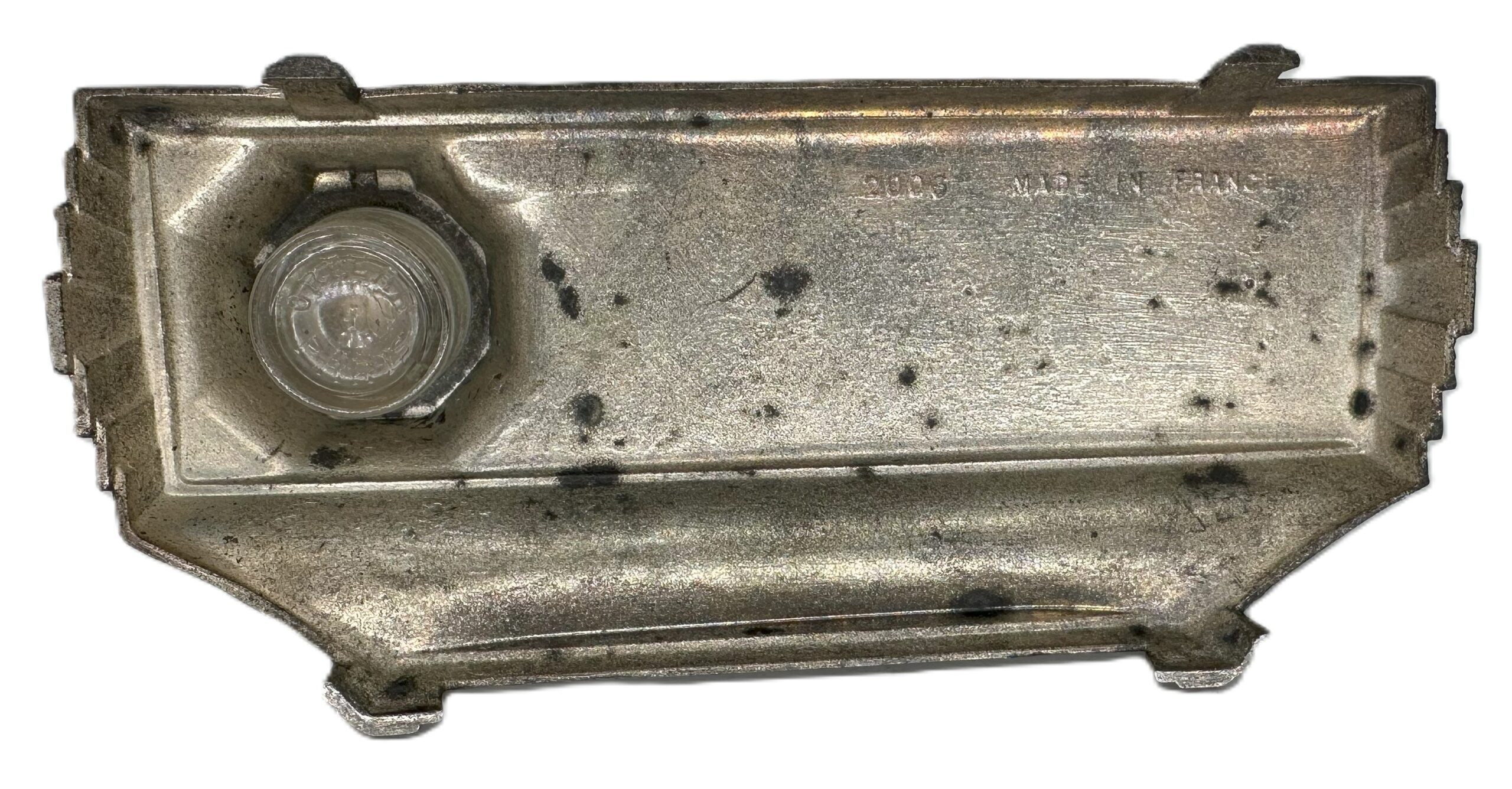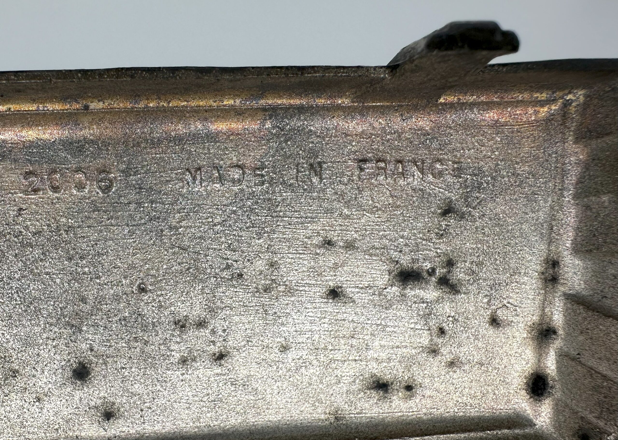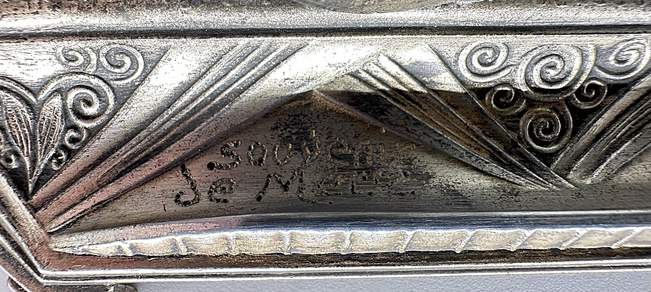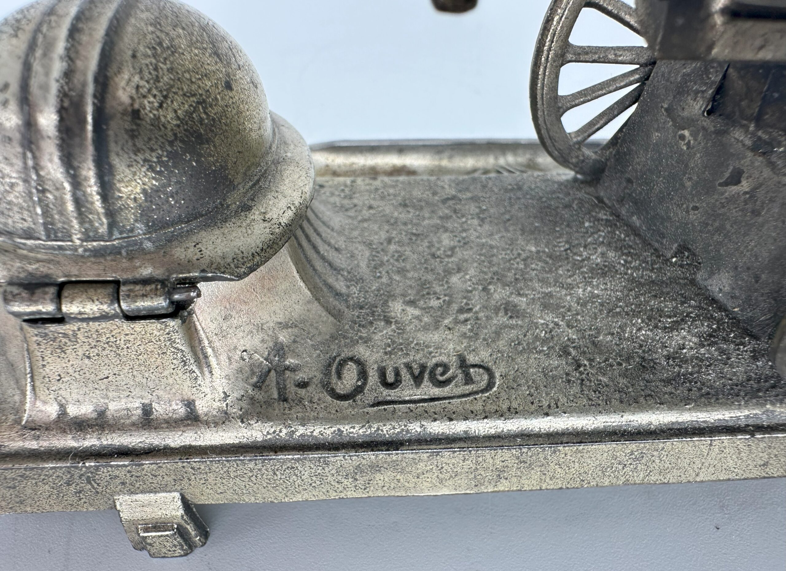 This World War I remembrance inkstand features a miniature French 75mm M1897 artillery cannon. The cannon is positioned next to a French Adrian helmet, which serves as a cover for the inkwell itself. The base of the inkwell is ornately decorated. The underside is marked “Made in France” and numbered 2006. The piece is signed “A. Ouveb” on the backside, near the helmet. Engraved on the front pen channel are the words “Souvenir Je Me Souviens,” which translates “I remember”.