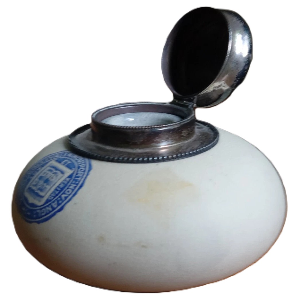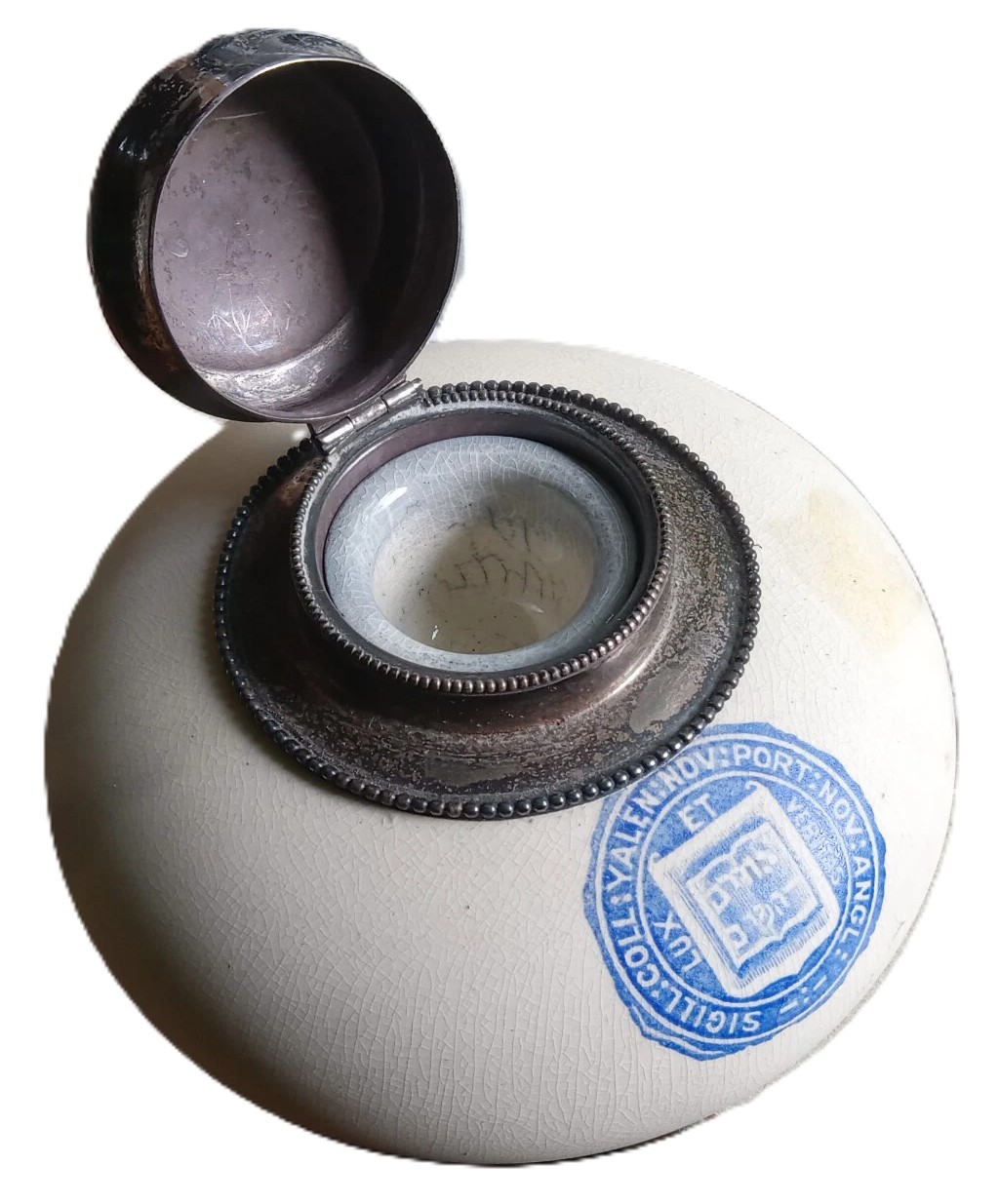 This is cream-colored ceramic inkwell with a sterling silver lid and collar bears the seal of Yale College.
