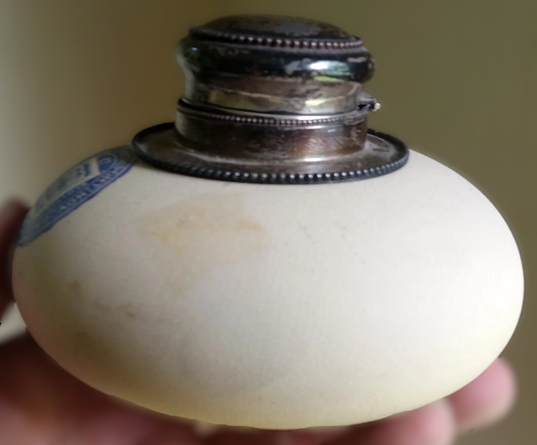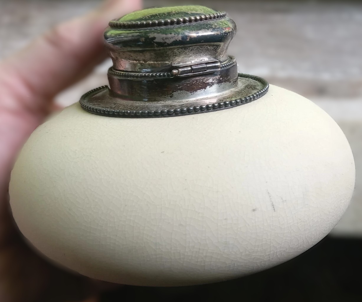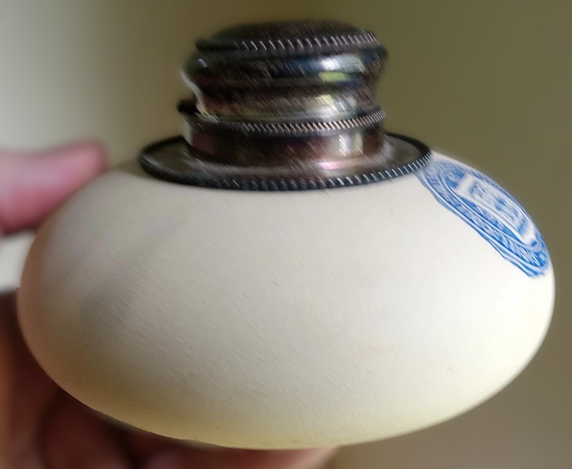 Ceramic Body: The inkwell’s ceramic body is a smooth, bulbous style. The cream-colored glaze exhibits fine crazing, which are the tiny crackle lines that form over time.