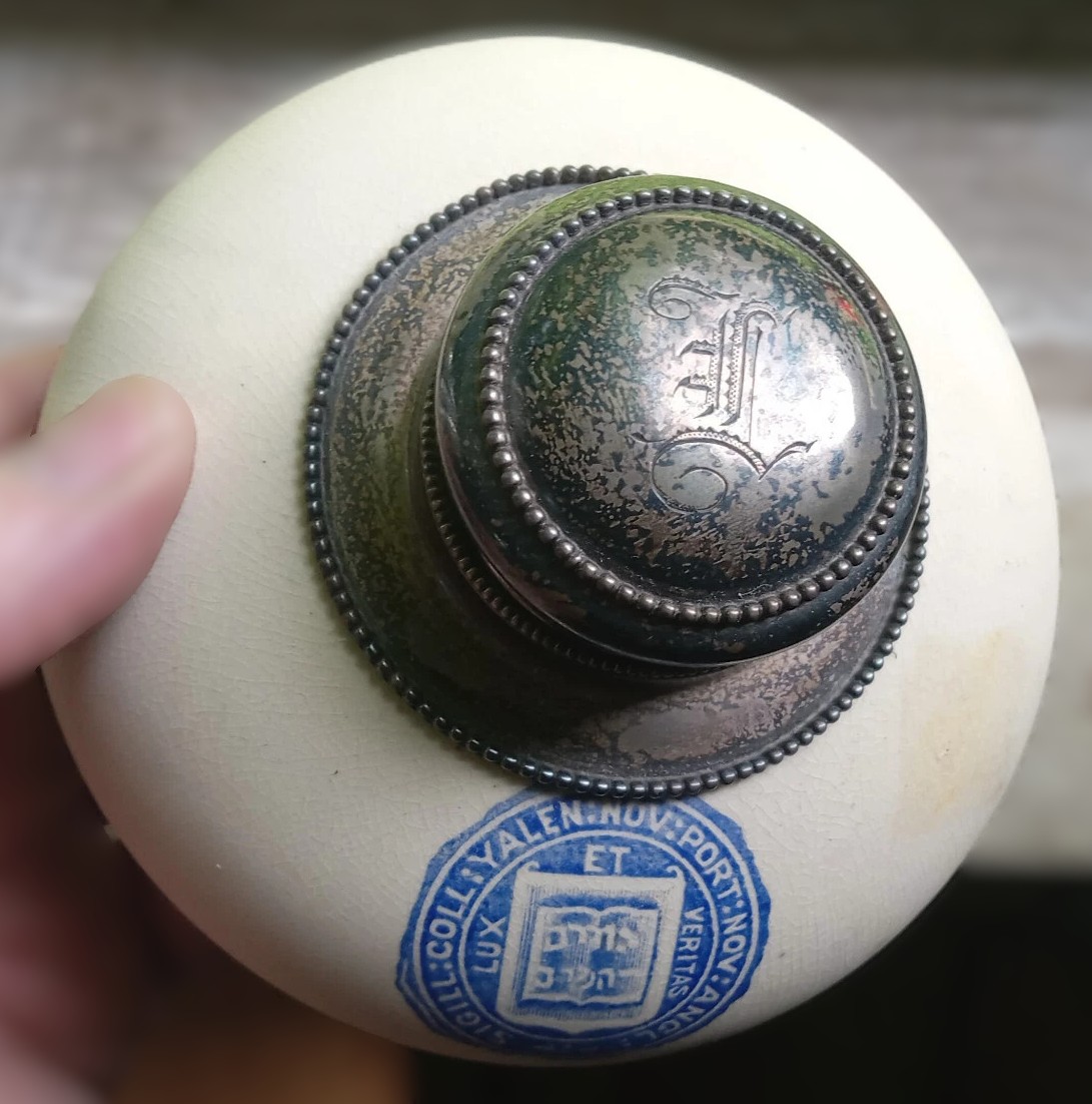 • Age: The company produced these types of high-quality wares, often with silver accents, between 1867 and 1898, before shifting their focus almost entirely to industrial ceramics like electrical insulators. Therefore, this inkwell dates to this period. The use of “Yale College” on the seal further refines the possible date to sometime before the university was officially renamed in 1887. The combination of these factors suggests a manufacture date between 1867 and 1887.