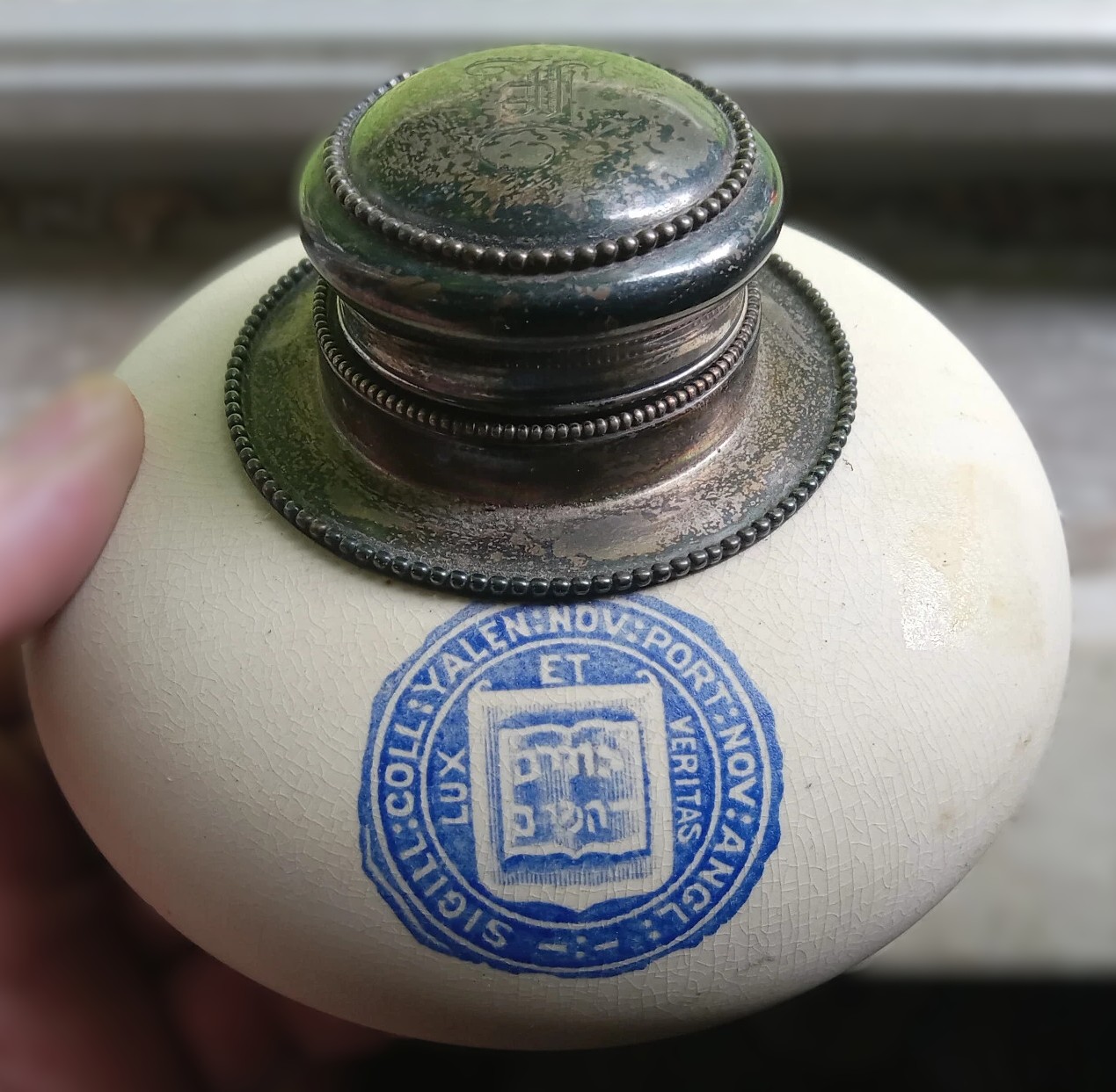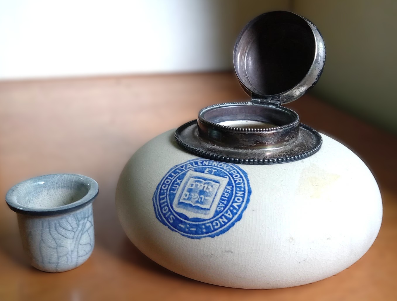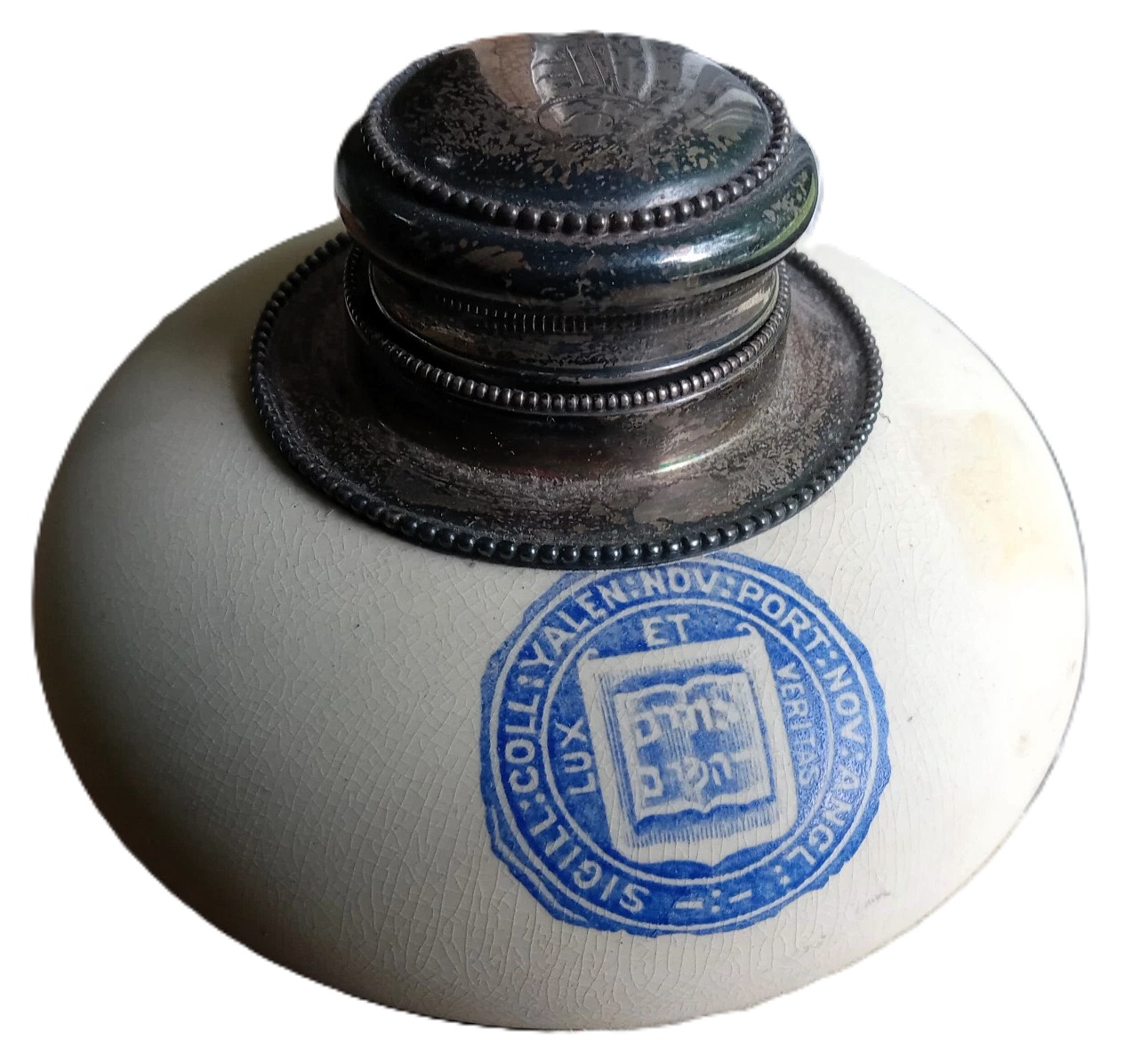 The Yale Insignia: The inkwell is a special commission, as evidenced by the bold blue transfer-printed seal of Yale College on its side. This seal, or coat of arms, provides historical context. The seal features:
