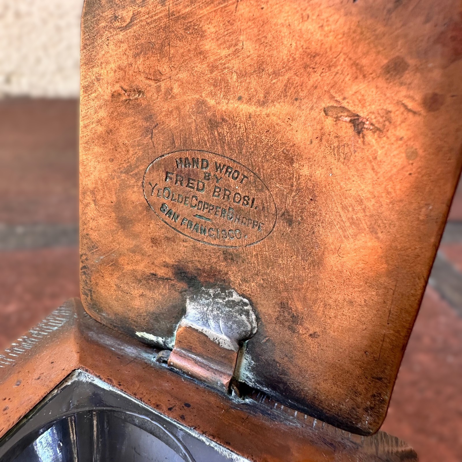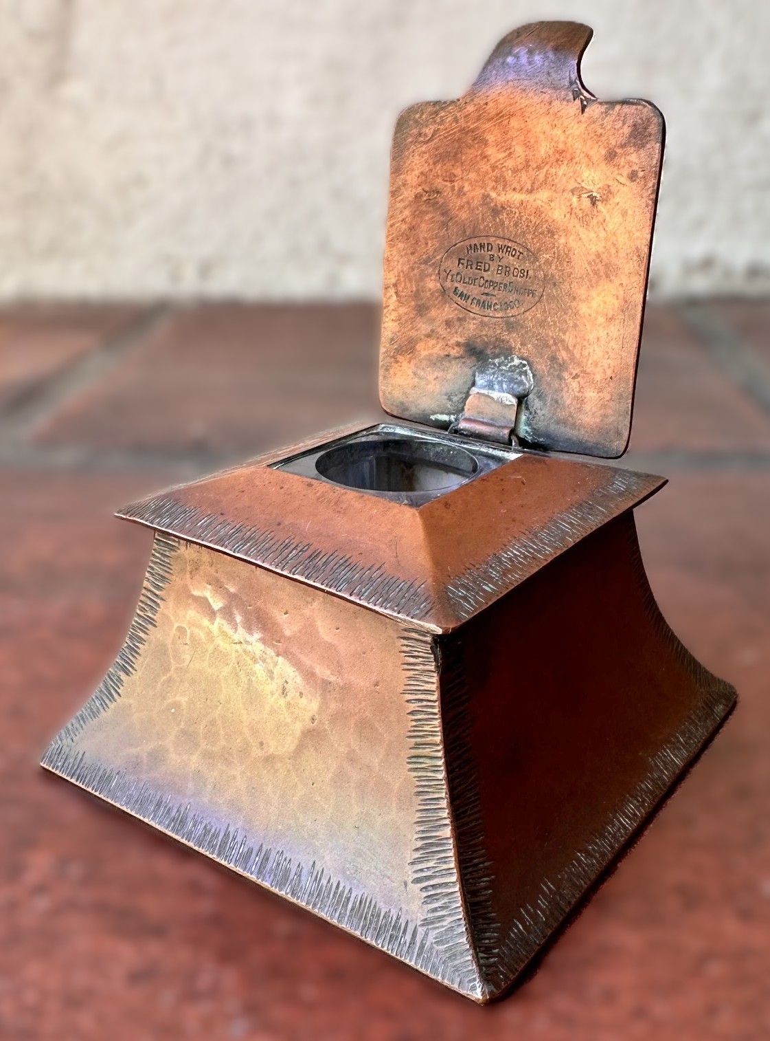 - Markings: The inkwell is marked underneath with “HAND WROT BY FRED BROSI – YE OLDE COPPER SHOPPE – SAN FRANCISCO”.