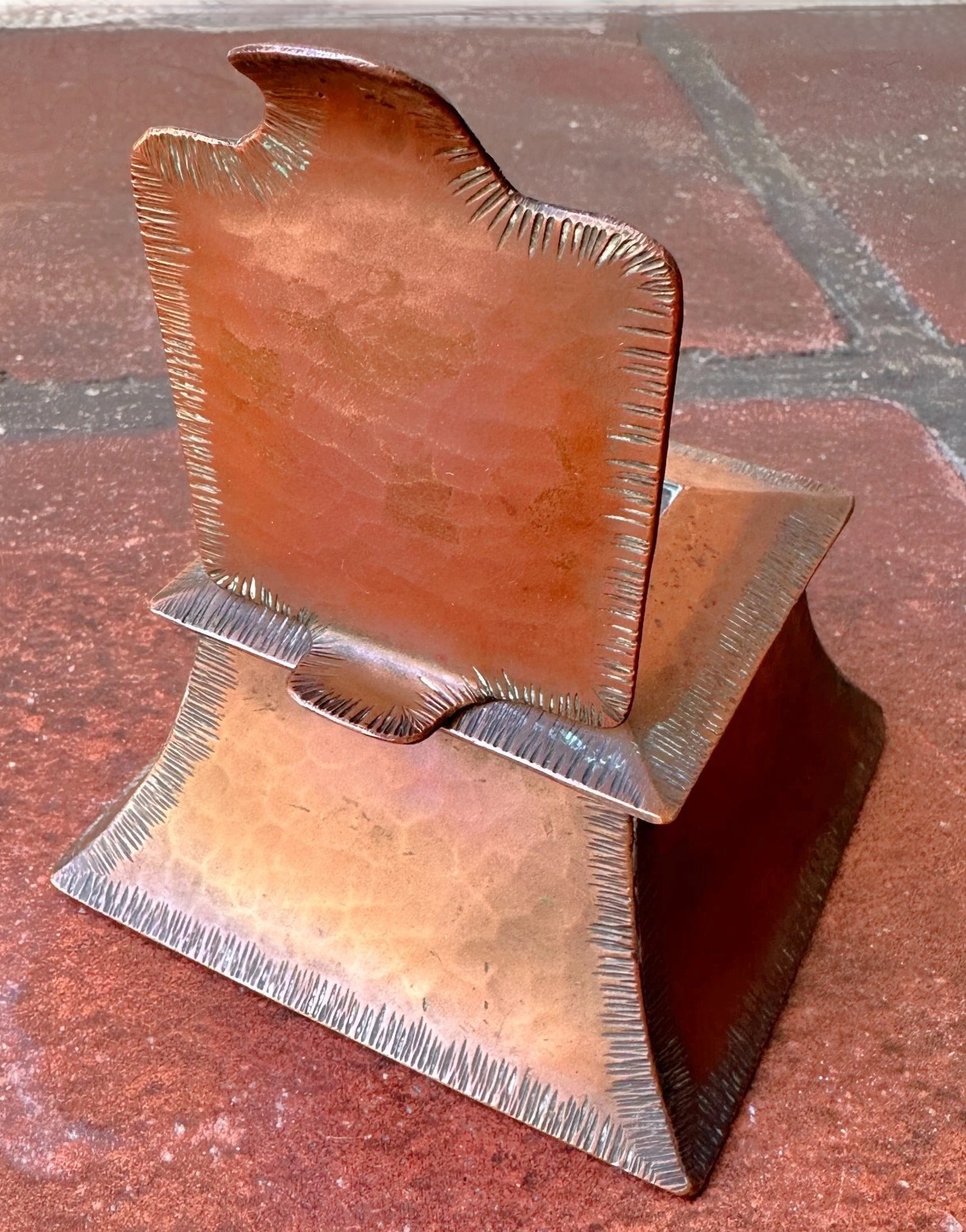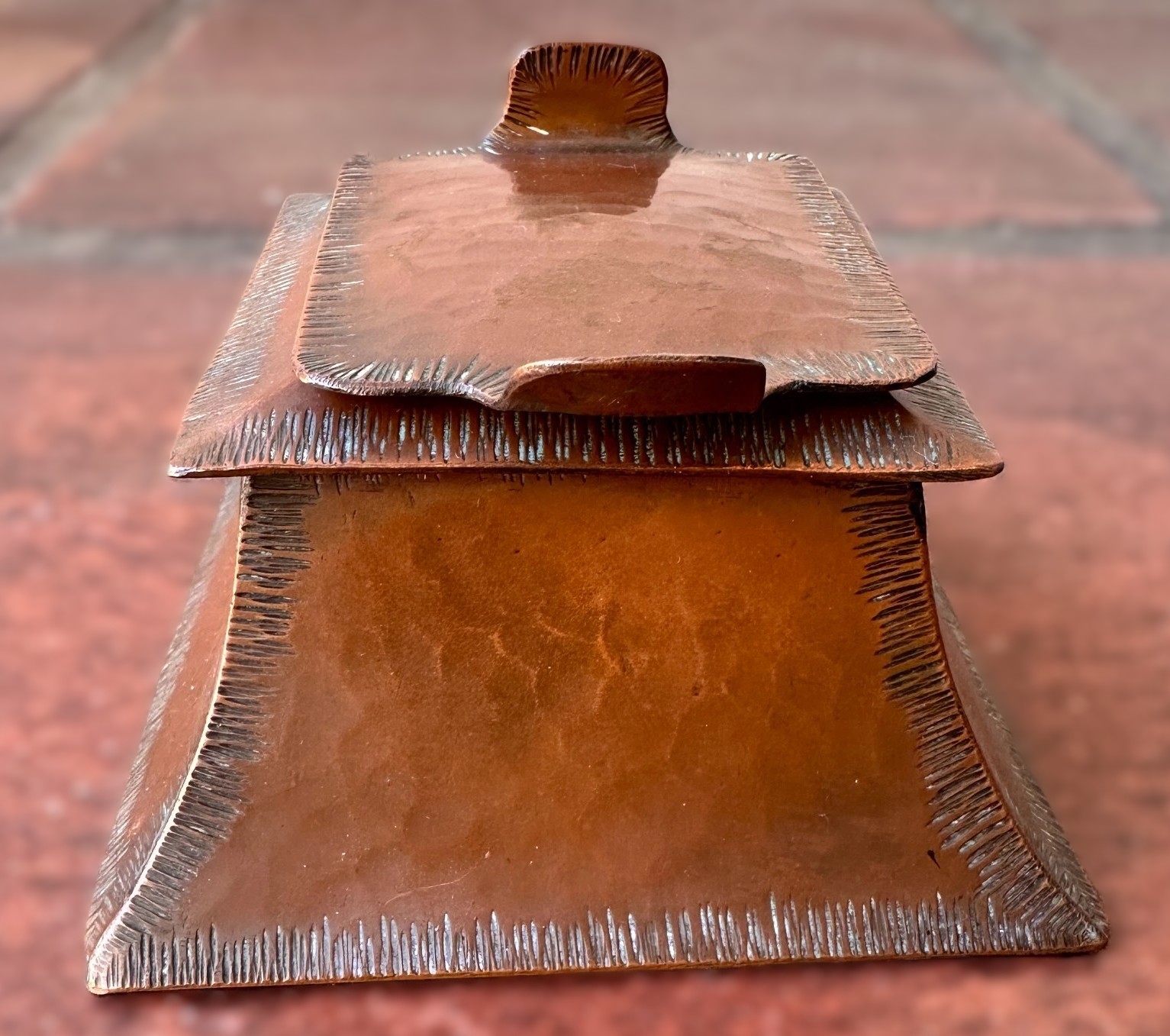 - Hammered Finish: The surfaces of the inkwell exhibit a prominent hammered texture which is a hallmark of the Arts & Crafts movement’s appreciation for handcrafted objects. This hammering creates subtle undulations across the copper.