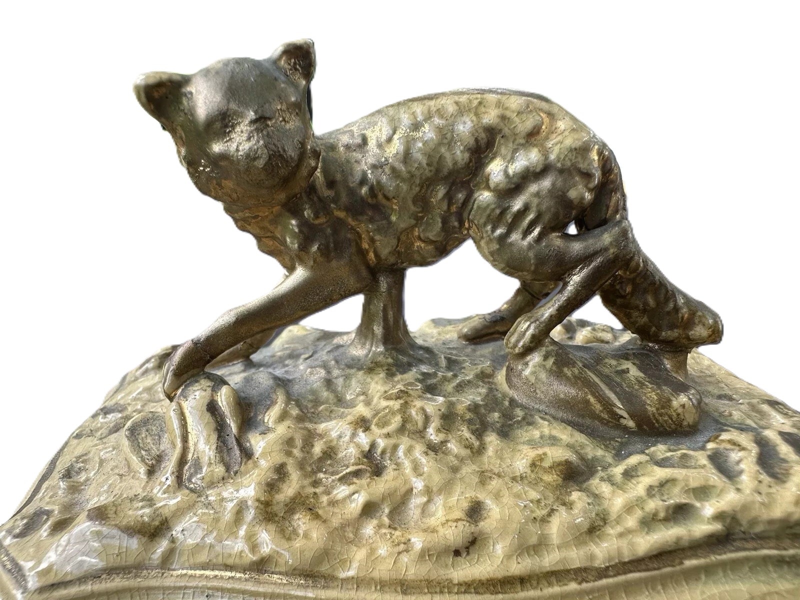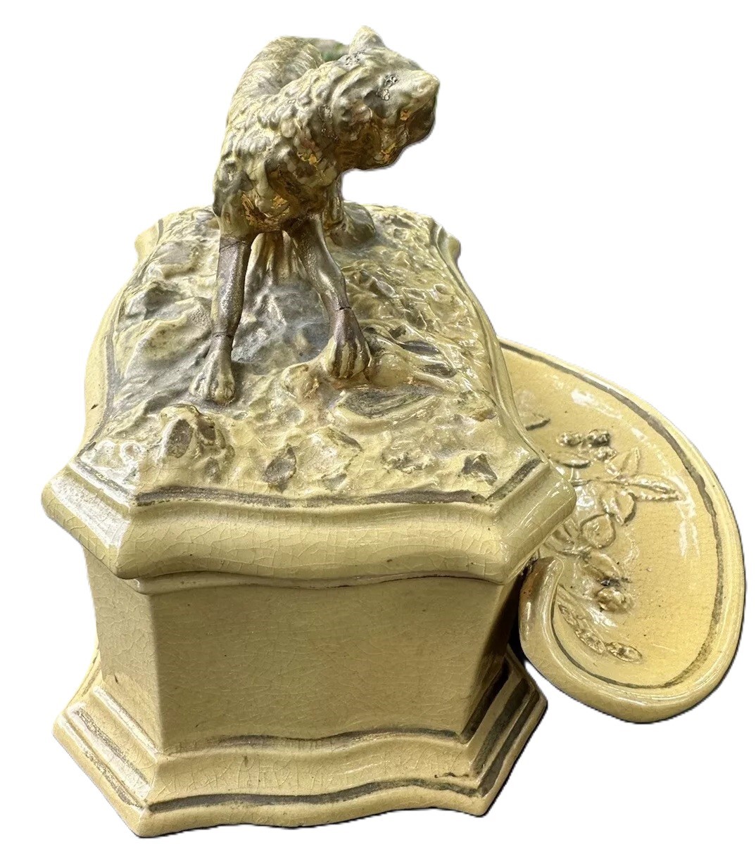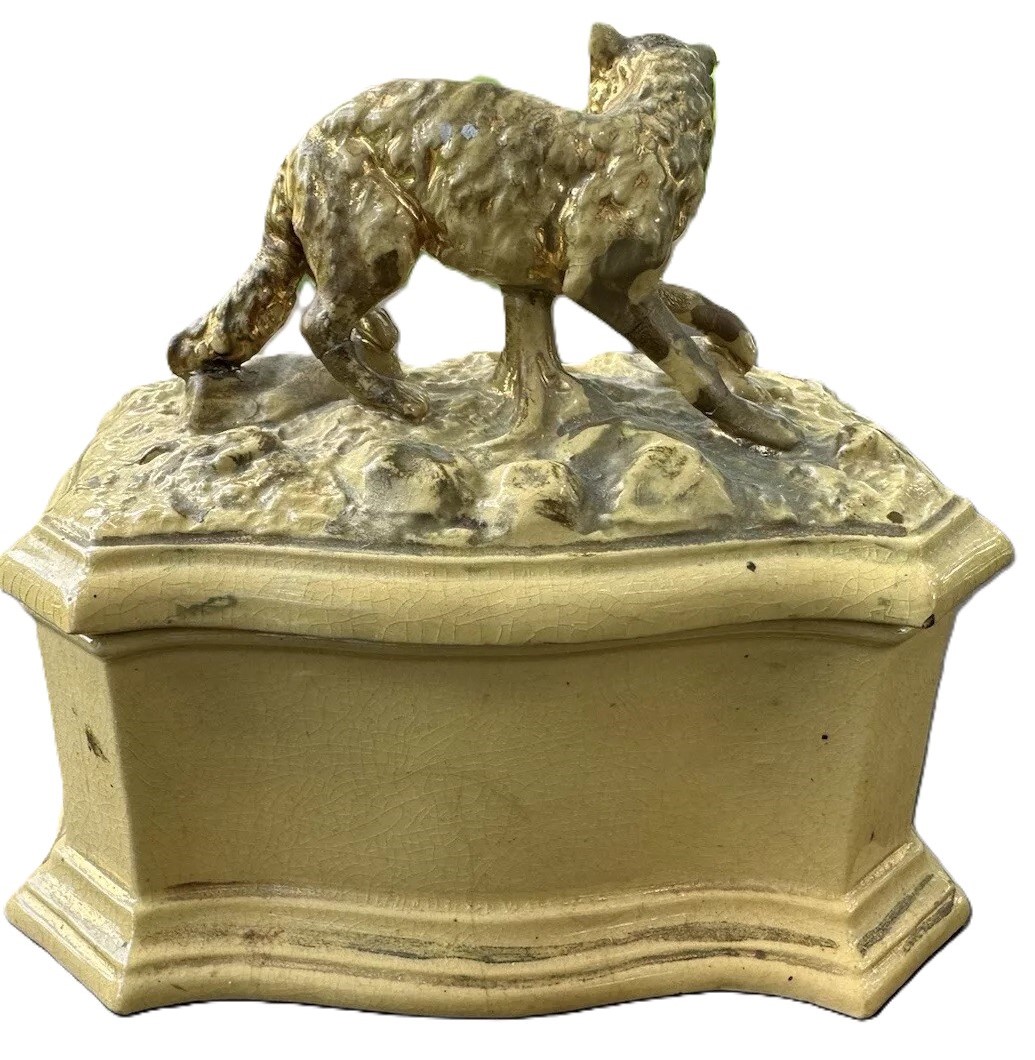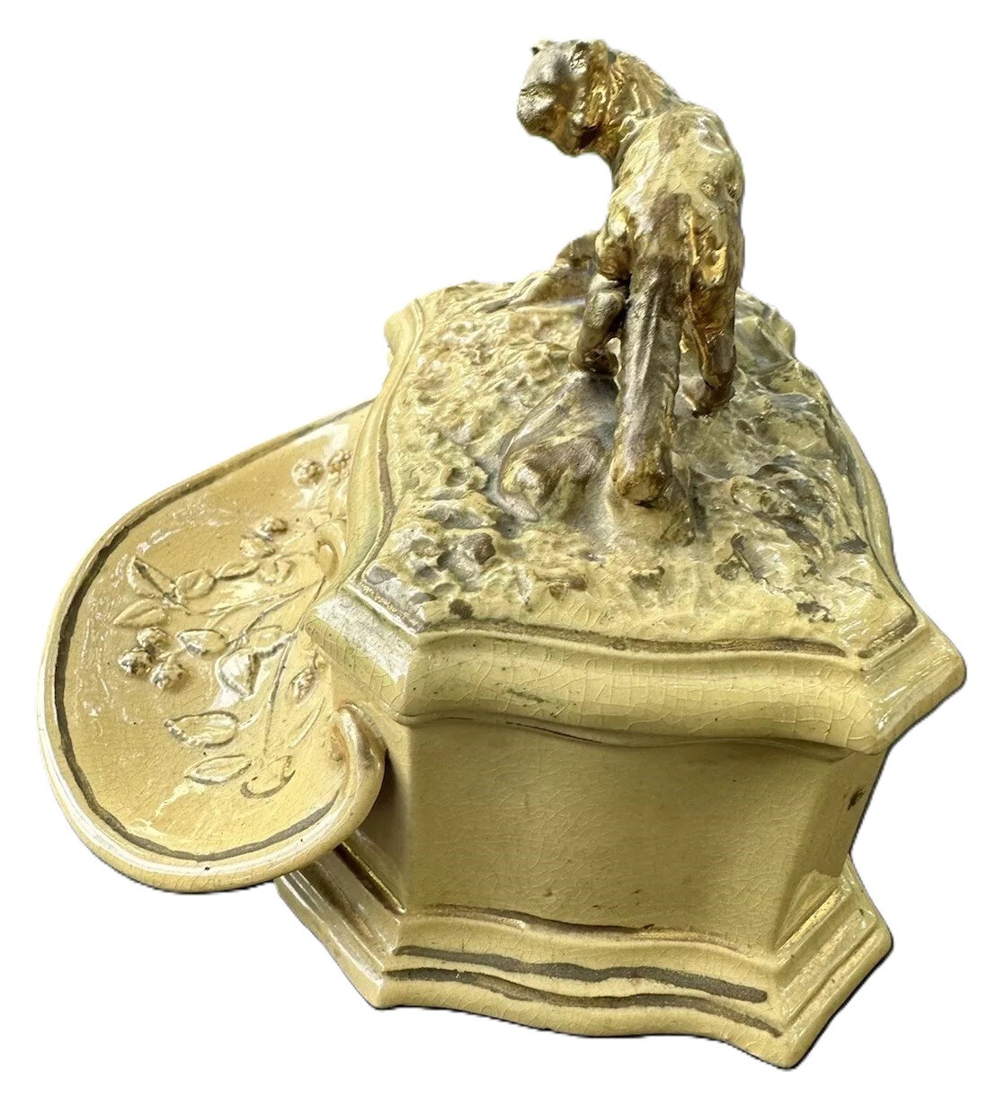 The lid of this yellowware inkstand features a sculpted fox in mid-prowl. This lid lifts to reveal two inkwells. The base with a pen tray is adorned with embossed floral patterns.
