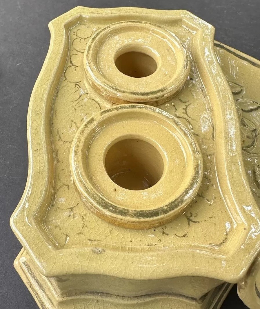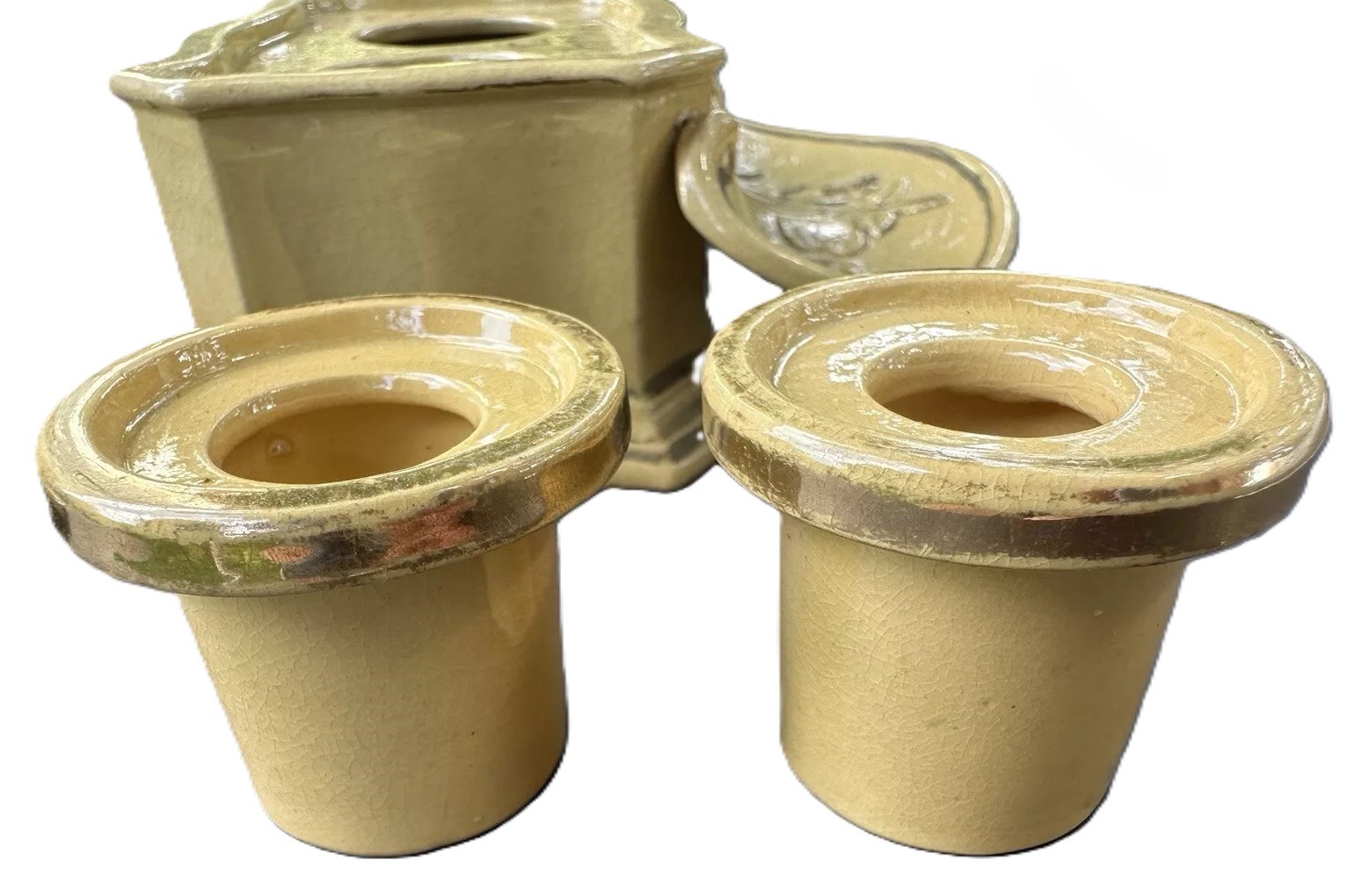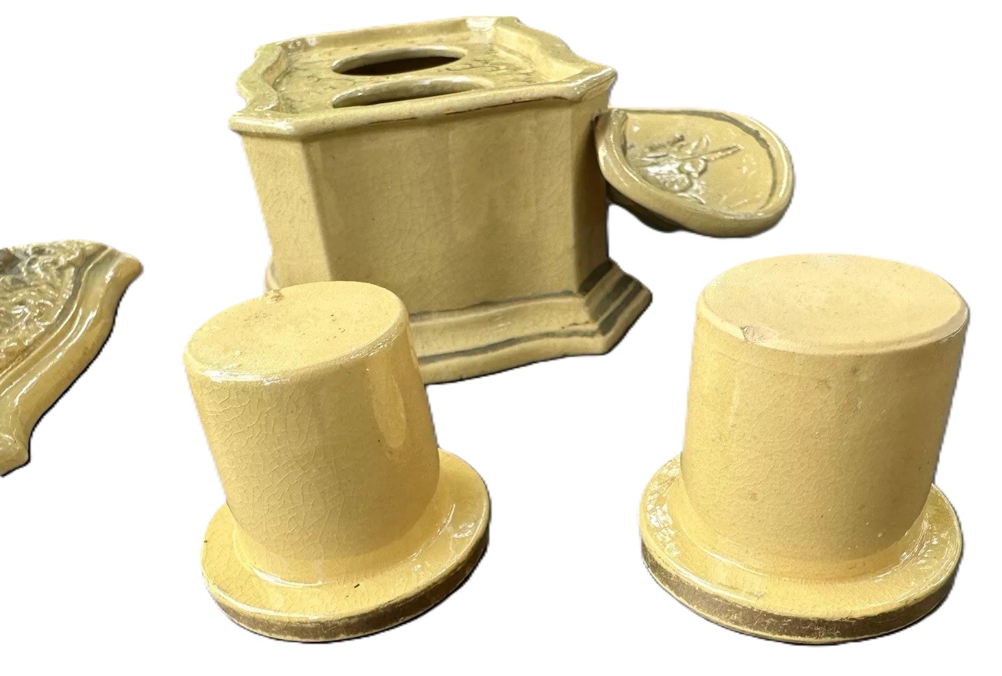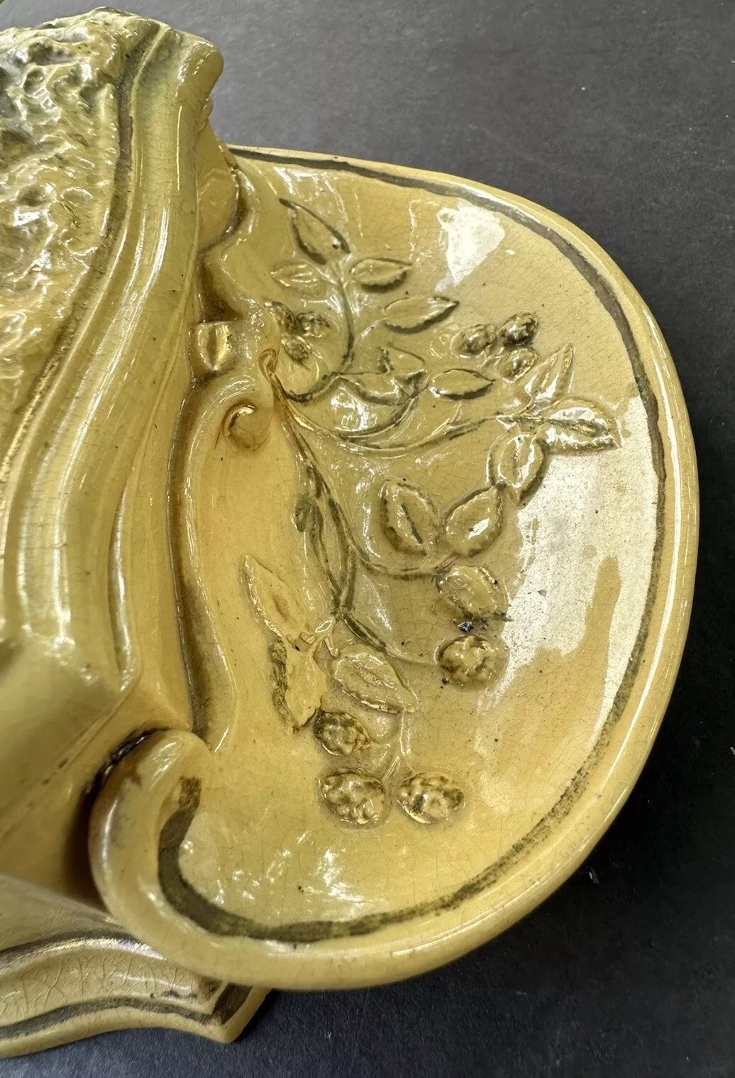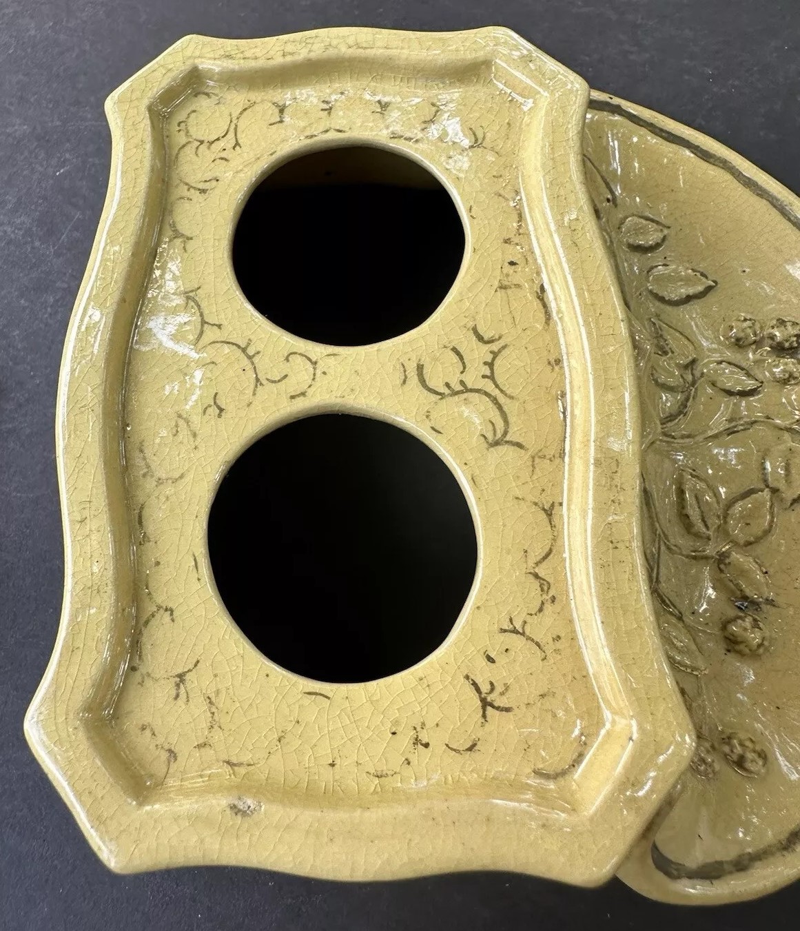 The lid of this yellowware inkstand features a sculpted fox in mid-prowl. This lid lifts to reveal two inkwells. The base with a pen tray is adorned with embossed floral patterns.