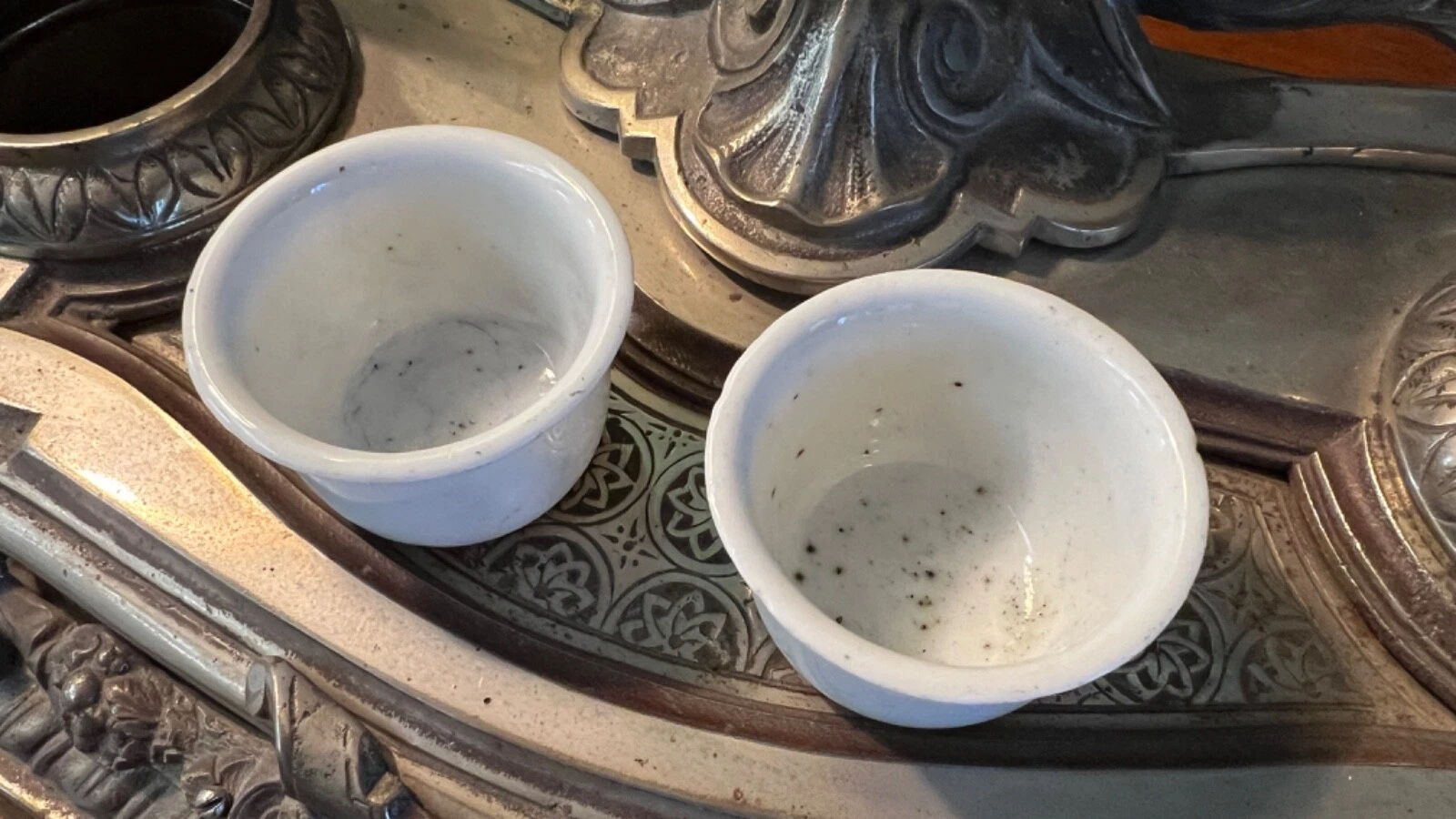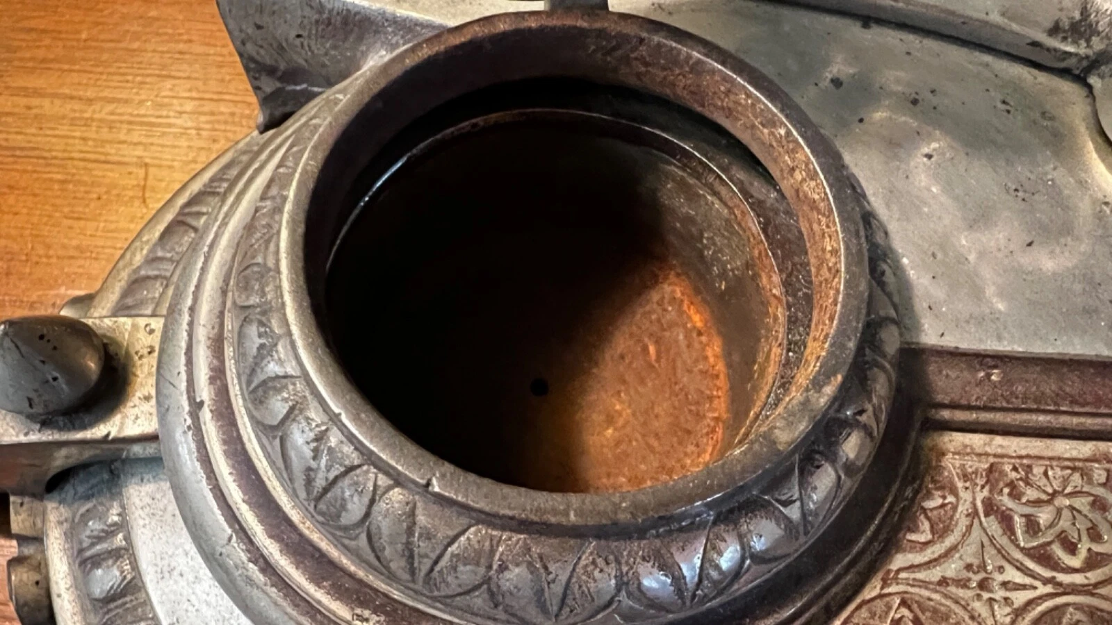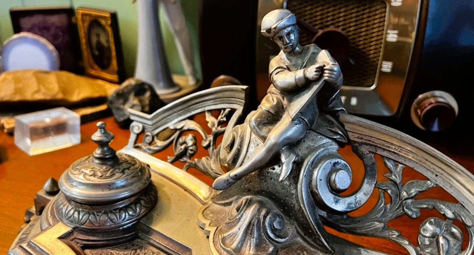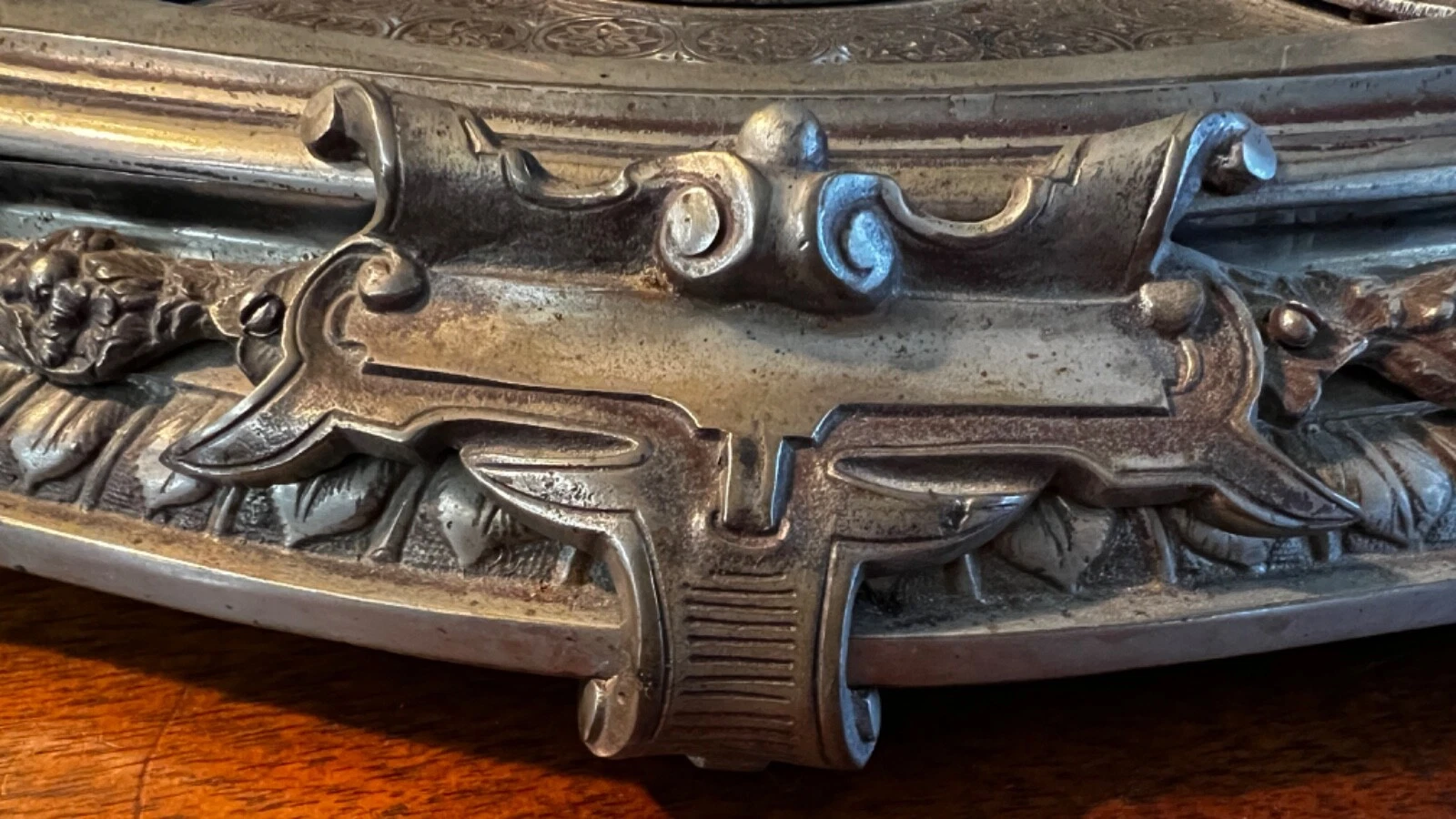 The inkstand is made of cast spelter (also known as white metal or régule in French). Spelter was a popular and more affordable alternative to bronze during the late 19th century. It was typically finished with an “oxidized silver” or “French silver” patina, which explains the grayish-silver tone and the way the finish has darkened or worn in the recessed areas. It has its original ceramic inserts.