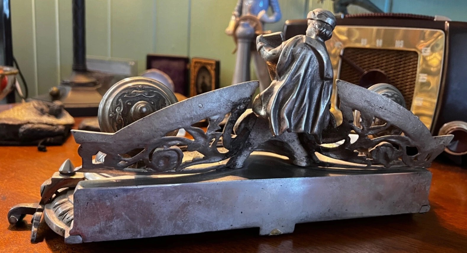 • The Base: The front features a shield-shaped cartouche (plaque), which was intentionally left blank by the manufacturer so that the owner could have it engraved with a name or a presentation date. The pen tray itself has a distinctive repeating geometric star/flower pattern in circles, which was a common design cue for turn-of-the-century desk accessories.