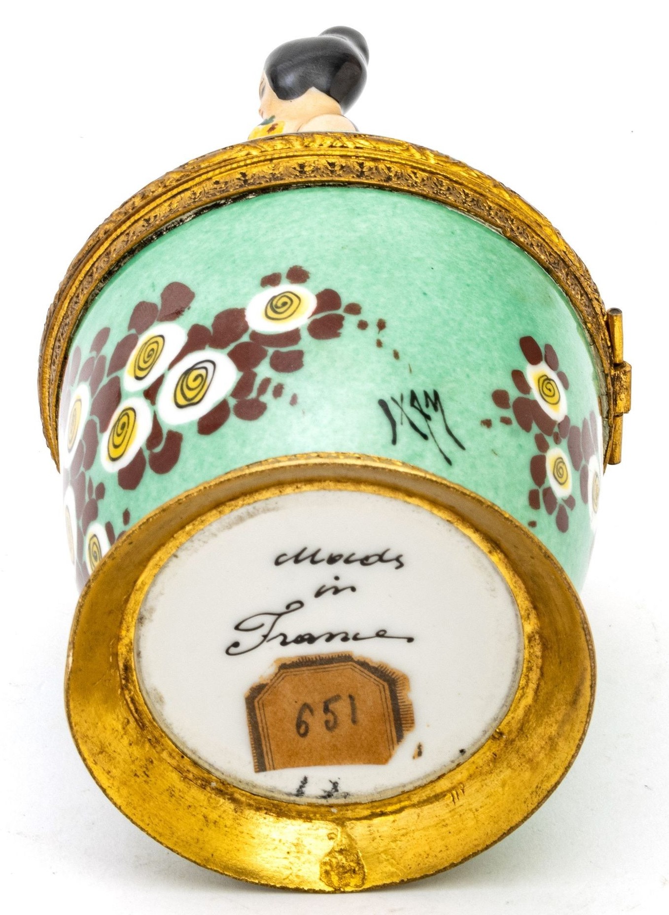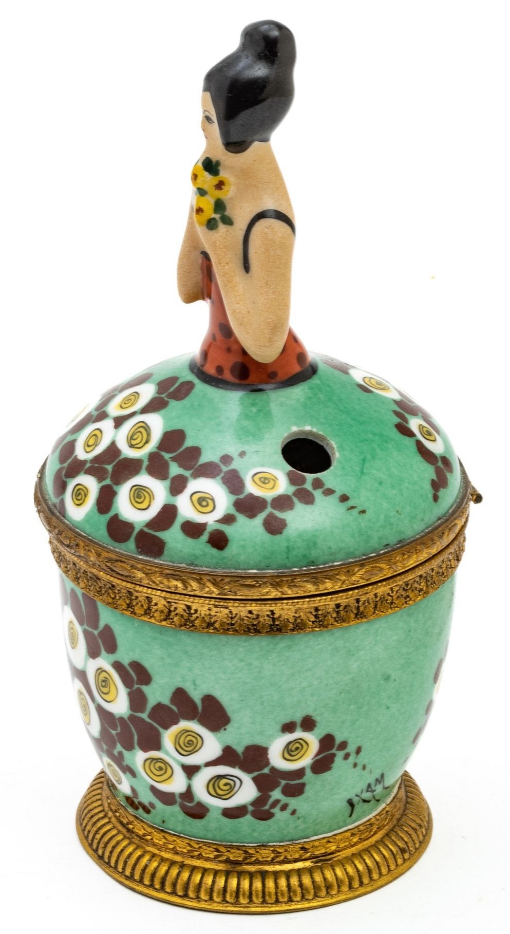 This inkwell features a young woman holding flowers. It has a pen hole in the lid to hold a pen when not in use. The top cover is hinged, allowing access to an inkwell inside, which also has its own hinged cover. The inkwell is adorned with a floral pattern, predominantly in green, white, yellow, and brown colors, and has ornate gold detailing around the edges and base. The inkwell is marked “Made in France,” and there is a mark or signature above the base that looks like “IX4M” or “lX4M.”