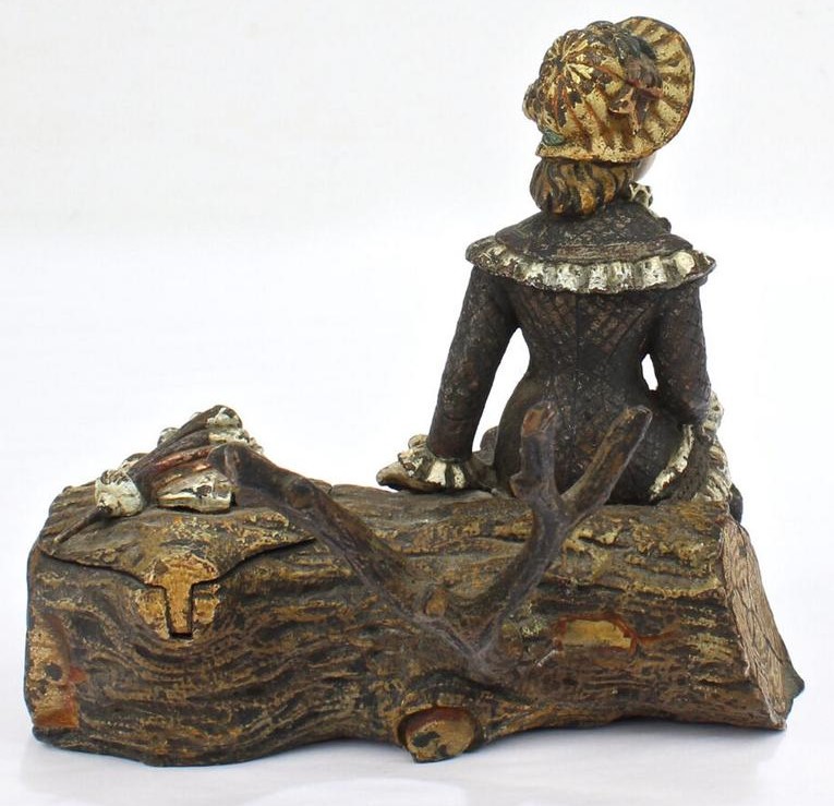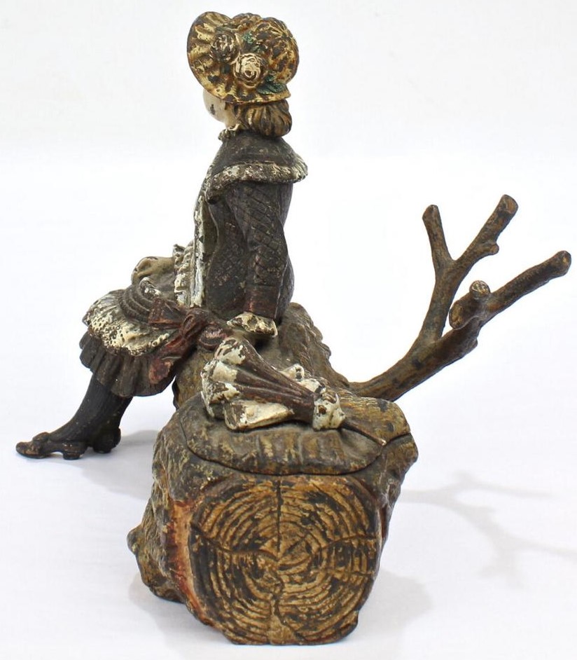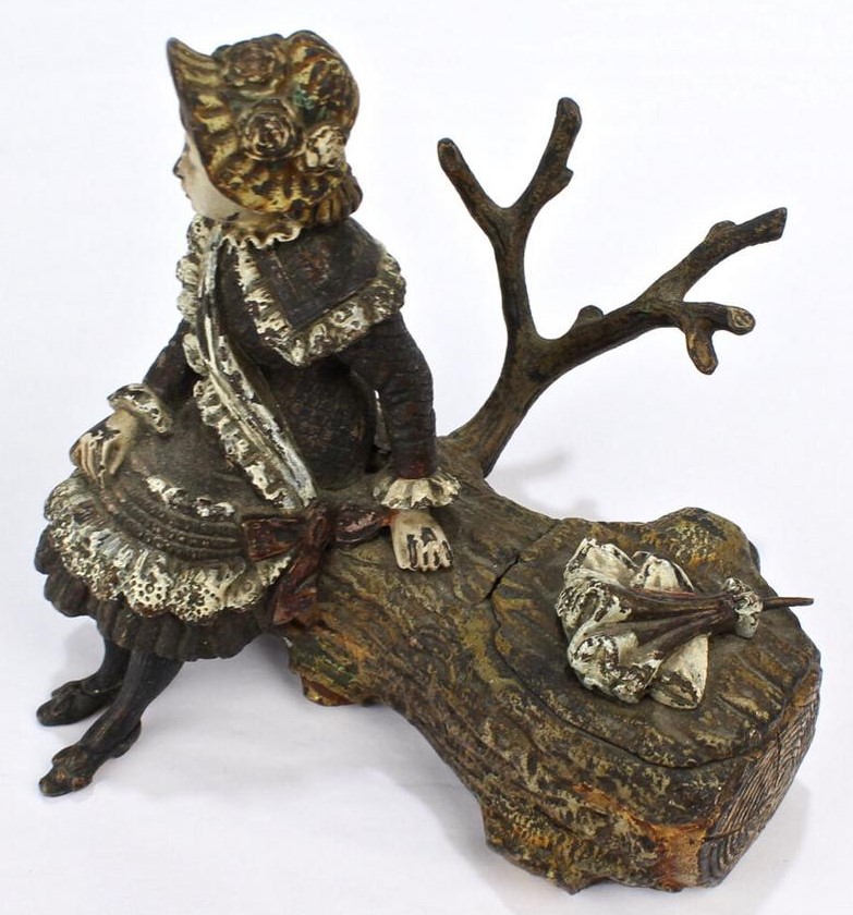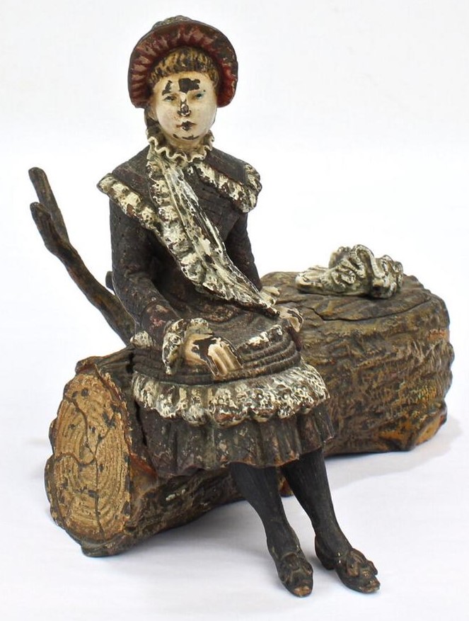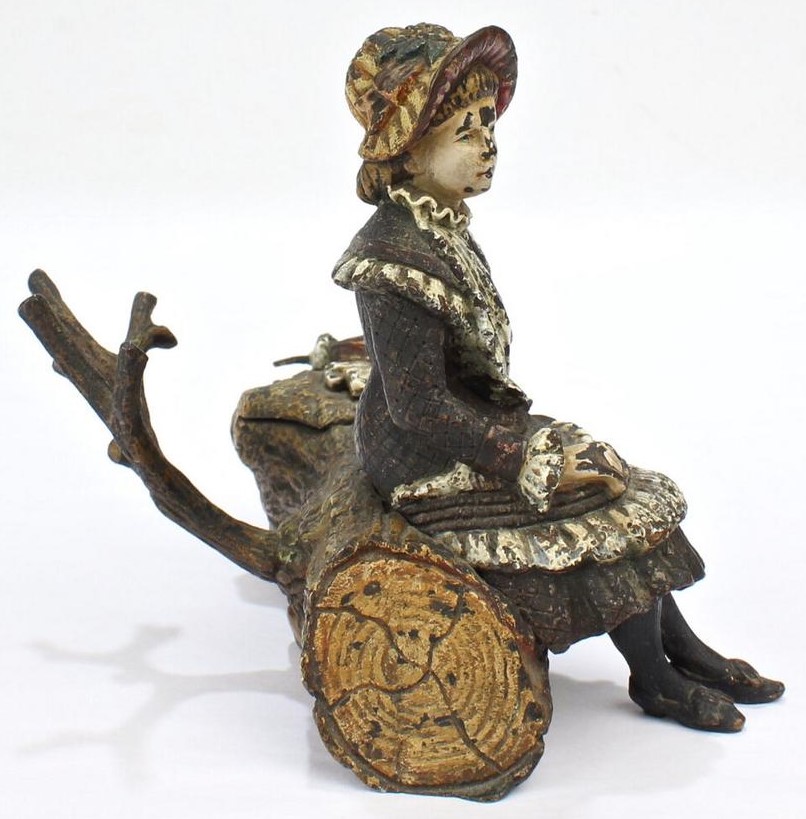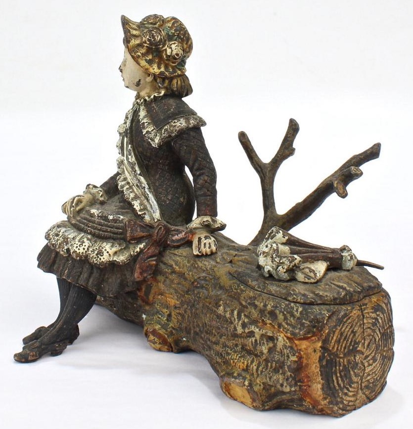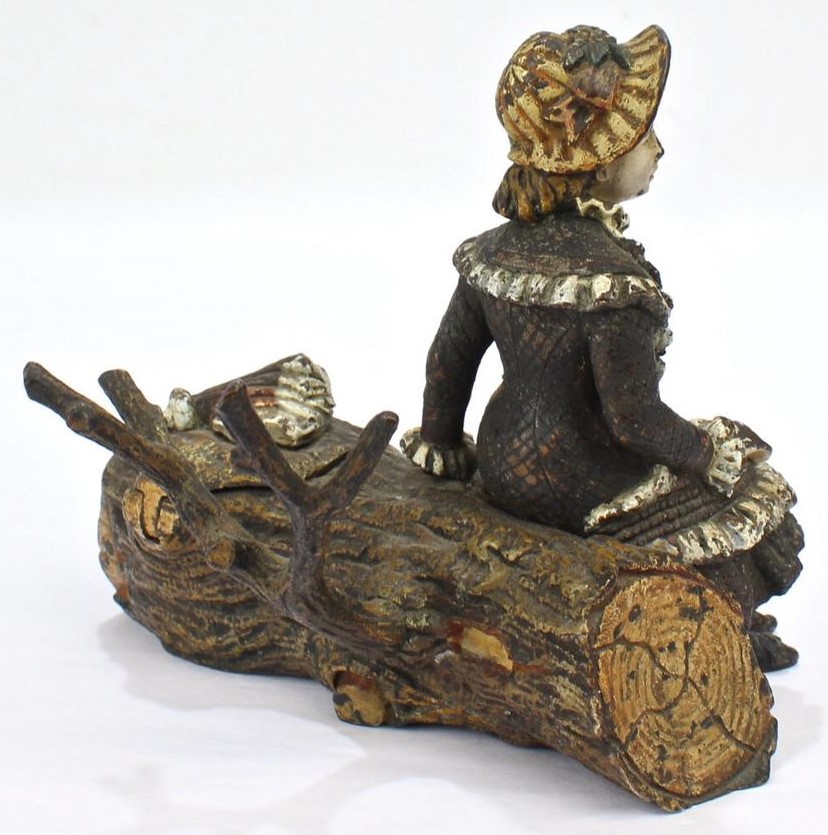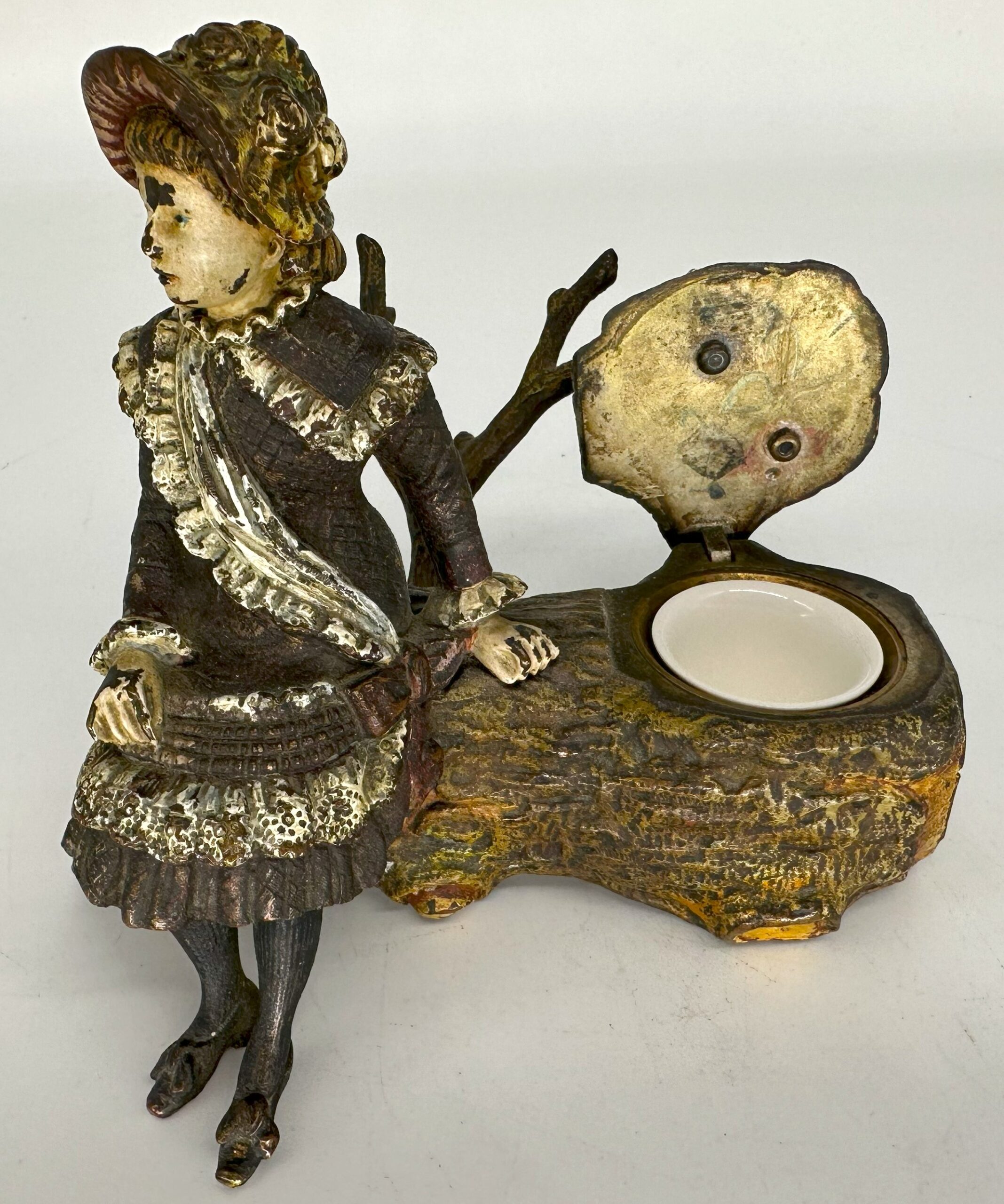 This beautifully rendered cold-painted bronze inkstand features a young woman sitting on a log. Her parasol lies next to her and serves as the handle for the hinged lid covering the inkwell. The vestigial branches form a pen holder.