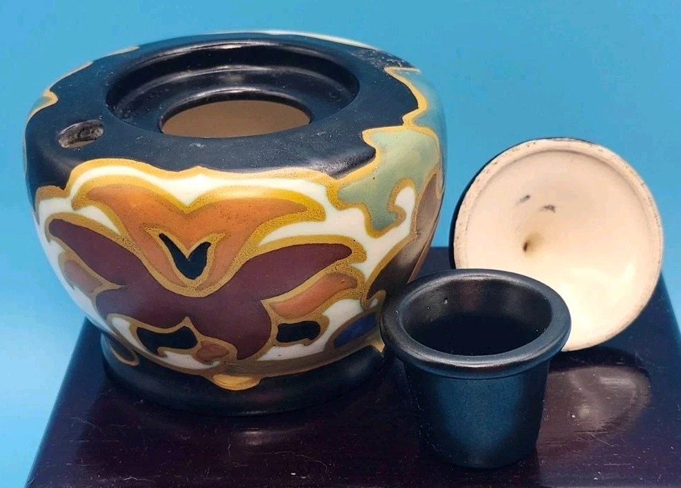 - Design: The pattern consists of bold geometric designs. These abstract shapes form vertical bands or segments around the body of the inkwell and on the lid. The design uses thick outlines and solid color blocks, characteristic of the geometric phase of Gouda pottery, setting it apart from the earlier floral Art Nouveau styles.