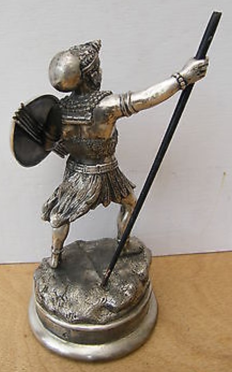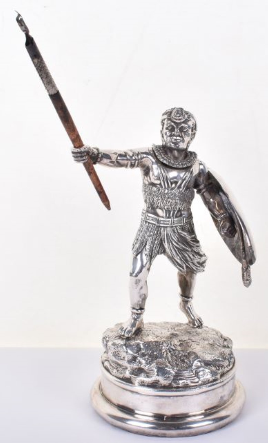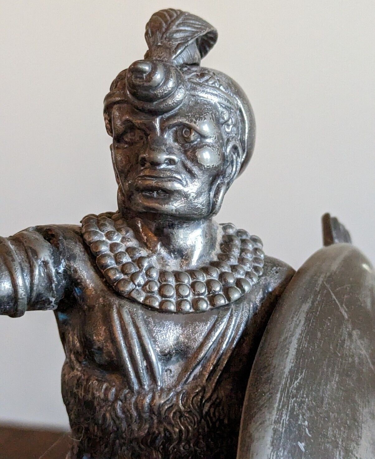 This inkwell features a Zulu warrior holding a shield and assegais / spears. The warrior is depicted in intricate attire, showcasing detailed armor and clothing. His hand is designed to hold a pen as a spear. His head is hinged and opens for access to the inkwell.